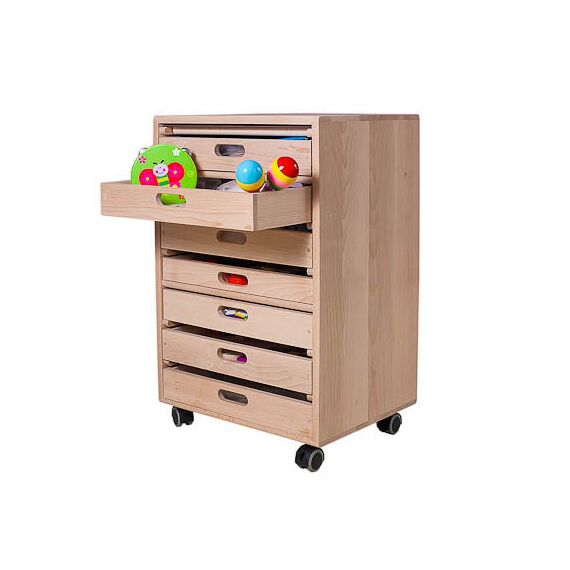 Мобильный стеллаж для хранения модулей изготовлен из натурального дерева (бука) и сконструирован в соответствии с педагогико-эргономическими требованиями, обеспечивает быстрый доступ к дидактическому материалу, простоту обзора и подбора необходимого для занятий материала.