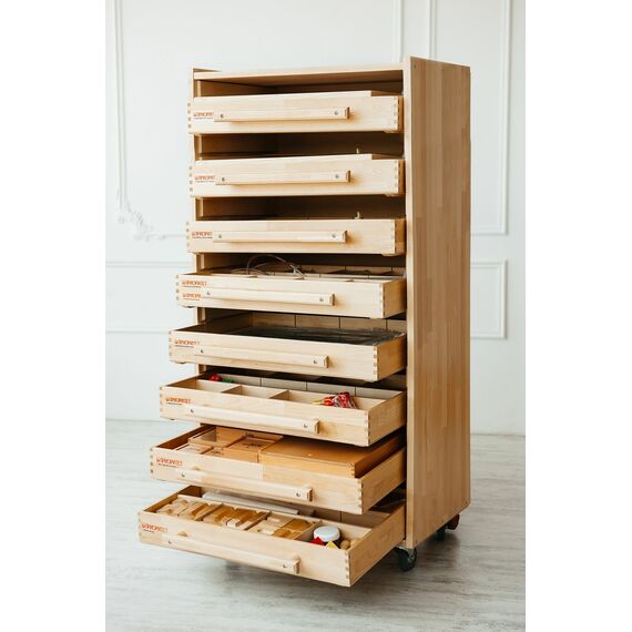 В состав набора входят 8 модулей-ящичков, стеллаж-тумба и книжка. Наборы Монтессори и Фребеля, входящие в состав комплекта, подойдут для обучения математике - счету, геометрии и физическим свойствам разных фигур. Также в комплект входят бусины, фишки и палочки, которые могут использоваться в качестве счетного материала и для выкладывания букв и слов. Многие материалы из комплекта также подходят для самостоятельного изучения, стимулируя любознательность и целеустремленность.