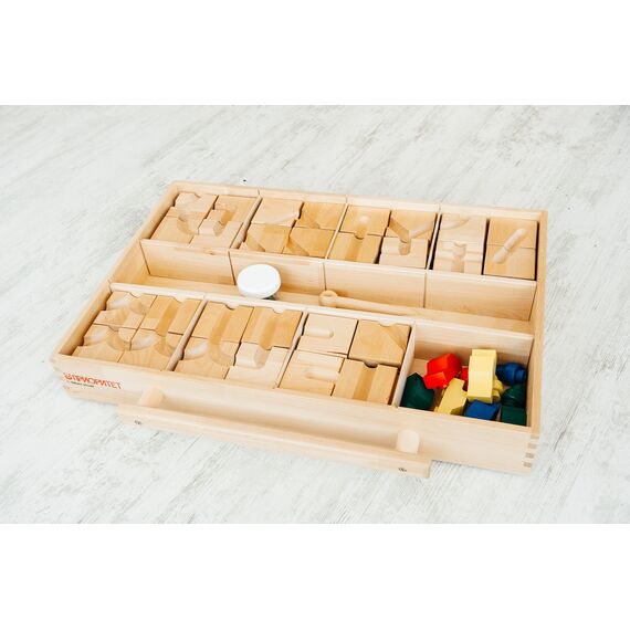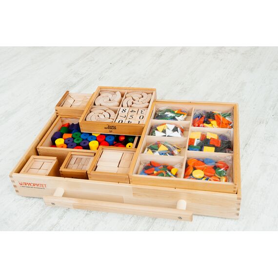 В комплекте содержится множество материалов, в том числе ящички из натурального дерева, которые используются для развития мелкой моторики, внимания, пространственного и логического мышления, творческих способностей и памяти. Комплект систематизирован и аксессуары разложены по тематическим ящичкам, что позволяет комбинировать их между собой. Кроме того, в комплекте есть детальная инструкция с методическими рекомендациями от специалистов.