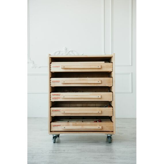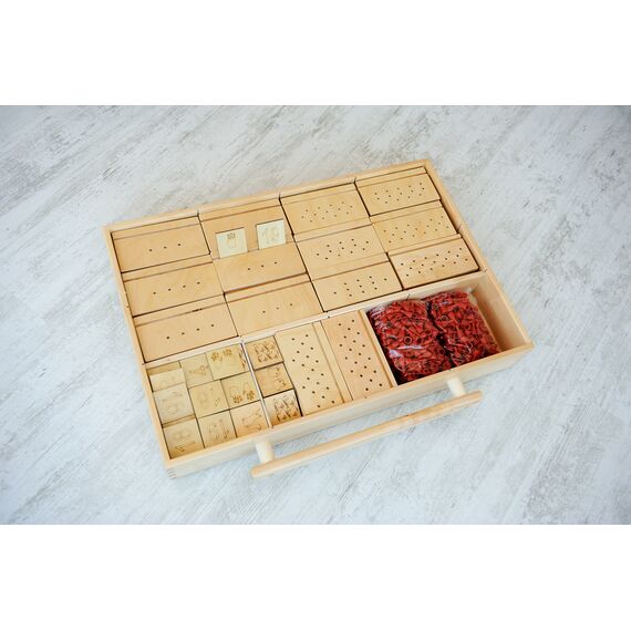 В комплект входит пять модулей, которые хранятся в мобильной тумбе, позволяющей быстро найти нужный материал для занятий с ребенком.
