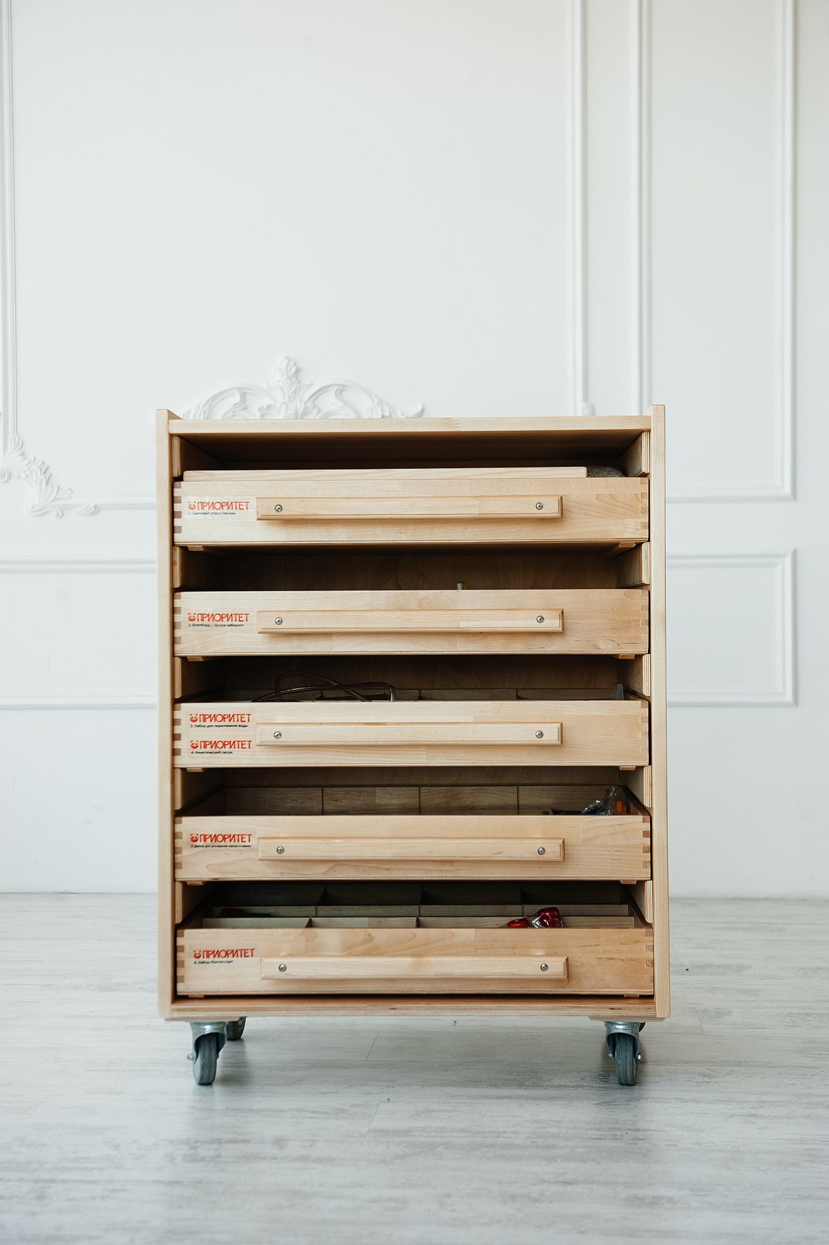 В комплект входит пять модулей, которые хранятся в мобильной тумбе, позволяющей быстро найти нужный материал для занятий с ребенком.