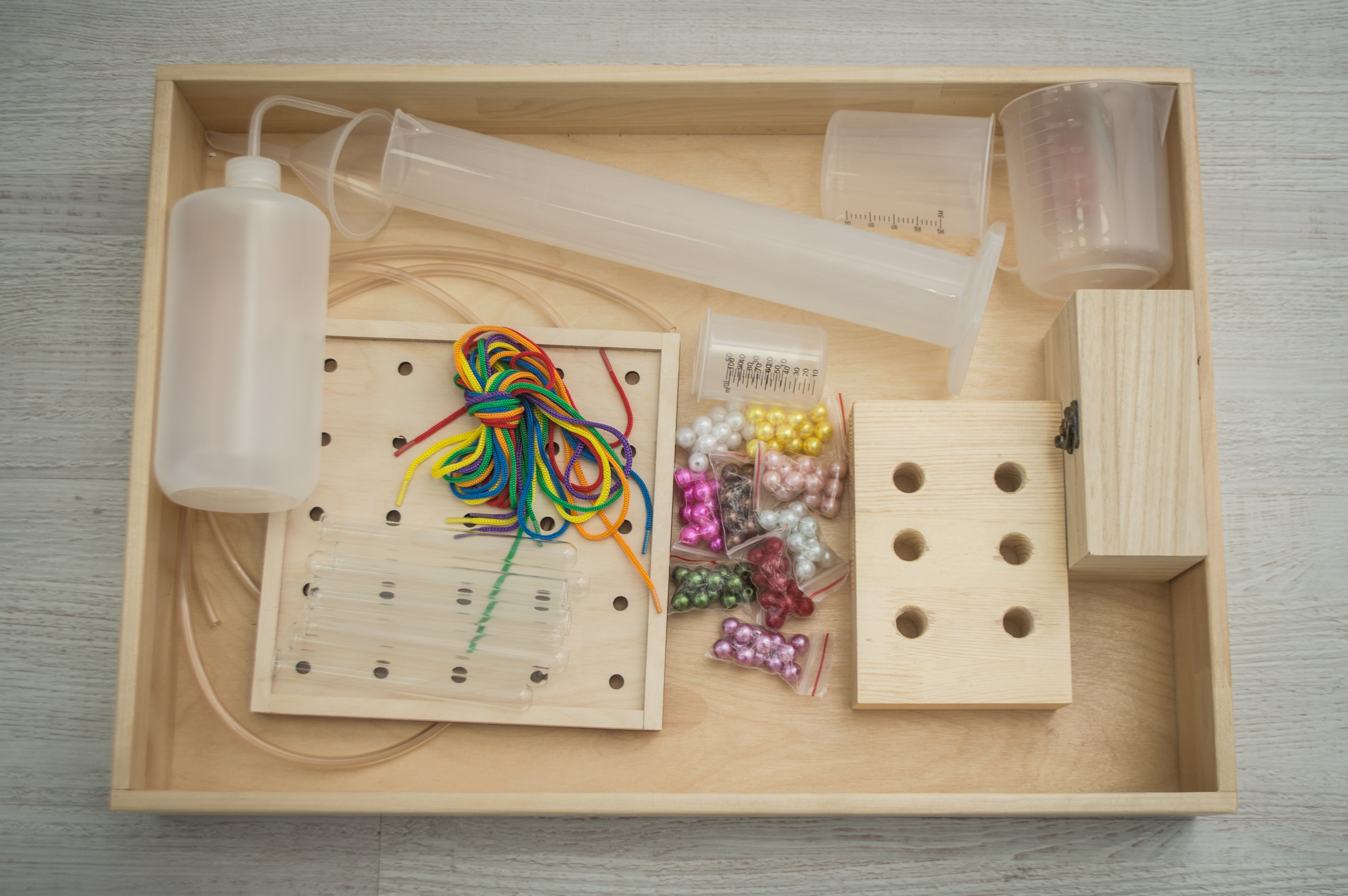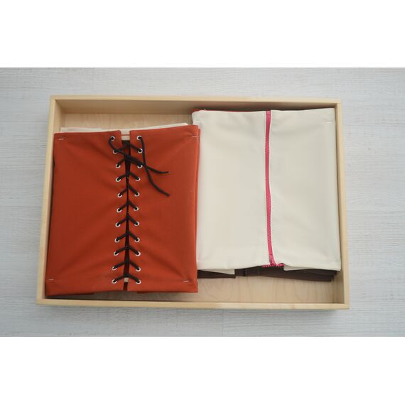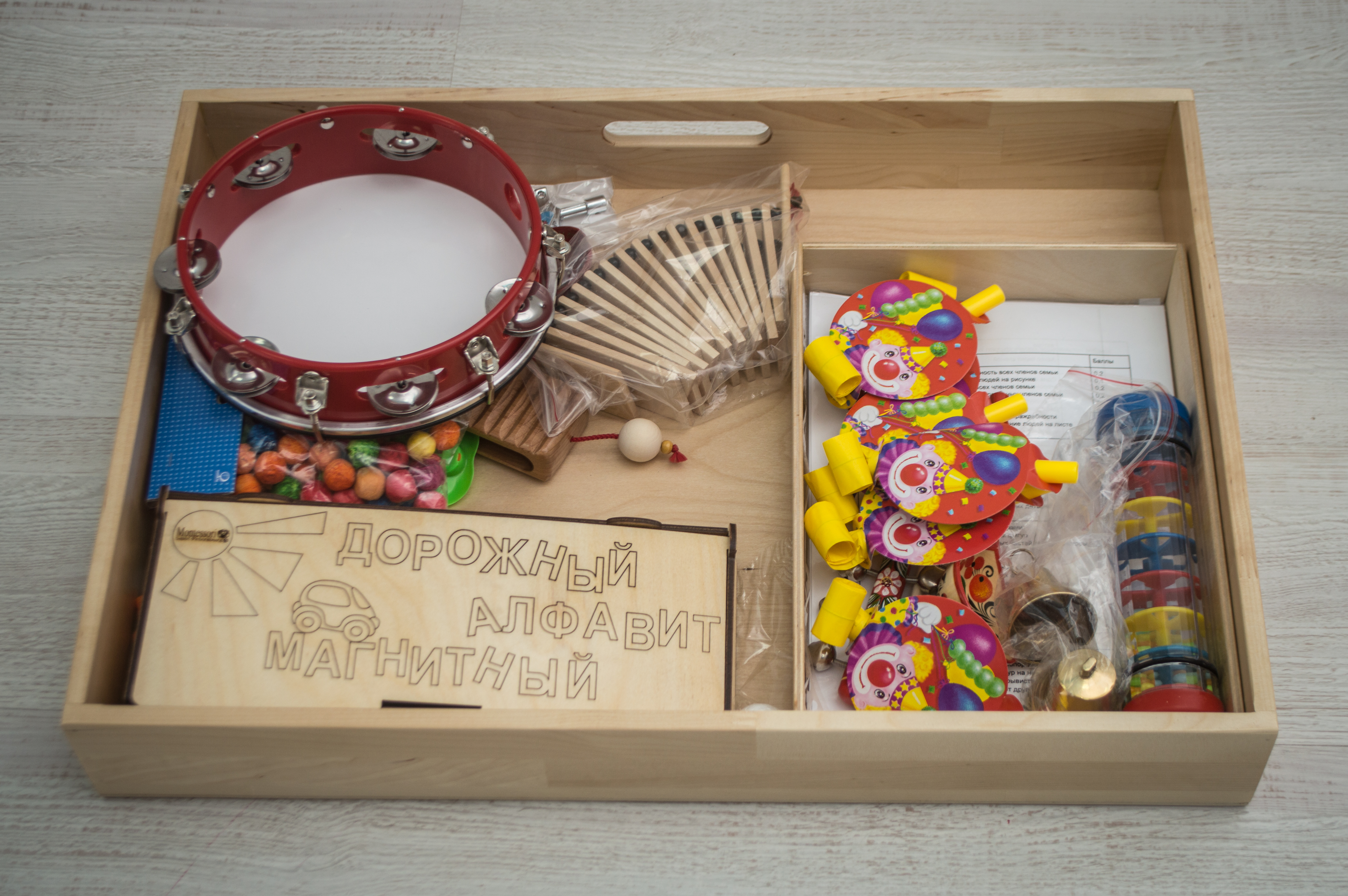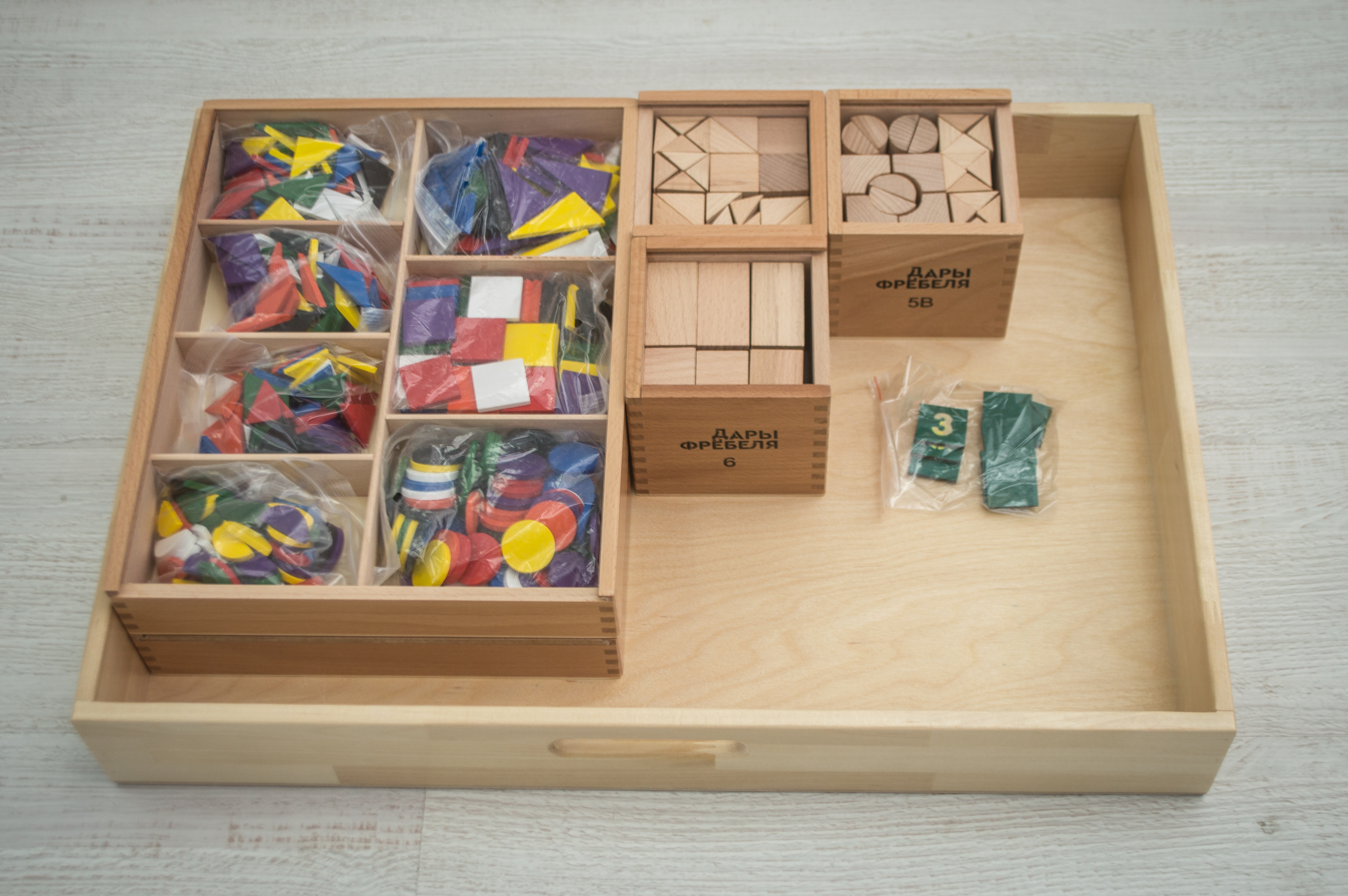 Основной материал, используемый в наборе, - древесина. Поверхности тщательно отшлифованы, некоторые детали окрашены в яркие цвета.