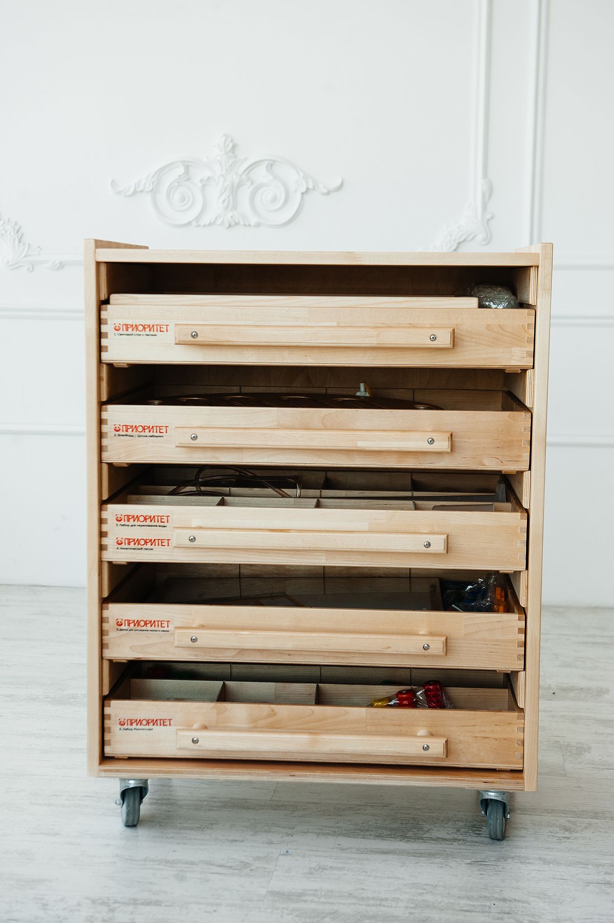- Встроенные колеса делают комод портативным, что облегчает перемещение его по комнатам. Выдвижные ящики позволяют удобно хранить все модули на одном месте.