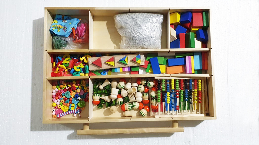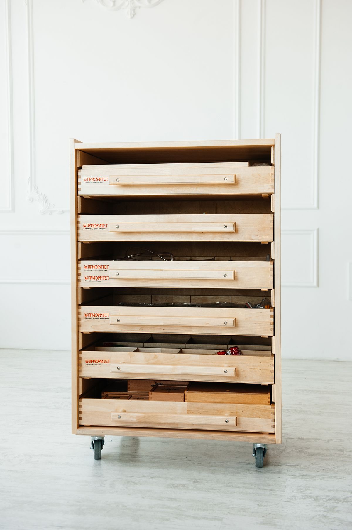 - Комод оборудован колесами и выдвижными ящиками, что упрощает хранение модулей и делает процесс более организованным. Материалы находятся в одном месте и педагогам не нужно искать их по всей комнате.