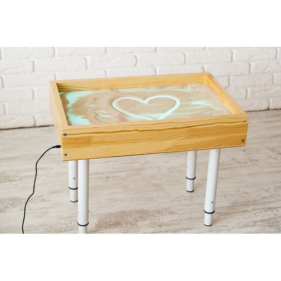 - Световой стол представляет собой прямоугольный стол на высоких ножках, в который встроен резервуар с песком и светодиодный механизм, подсвечивающий песок разноцветным светом.