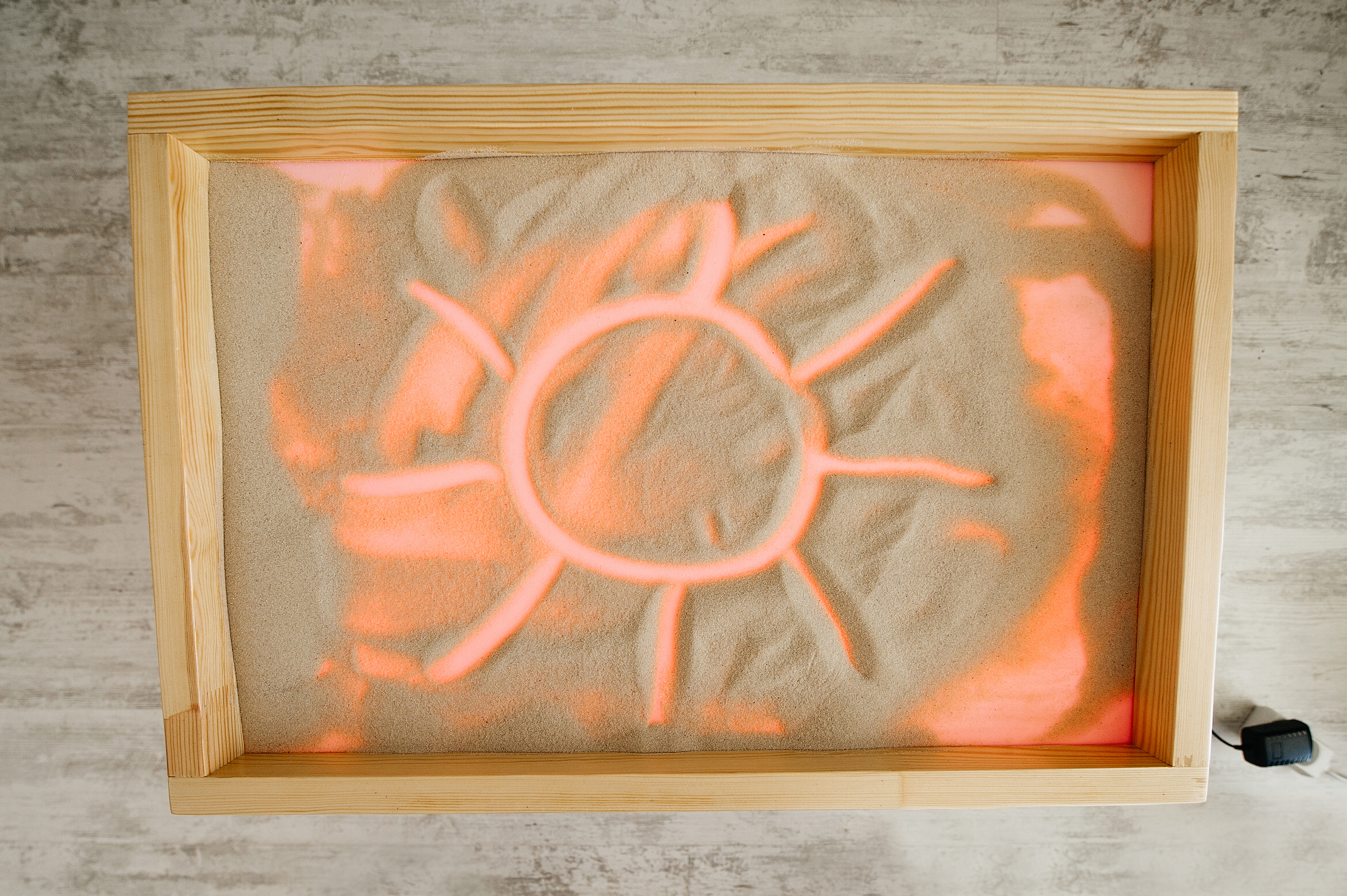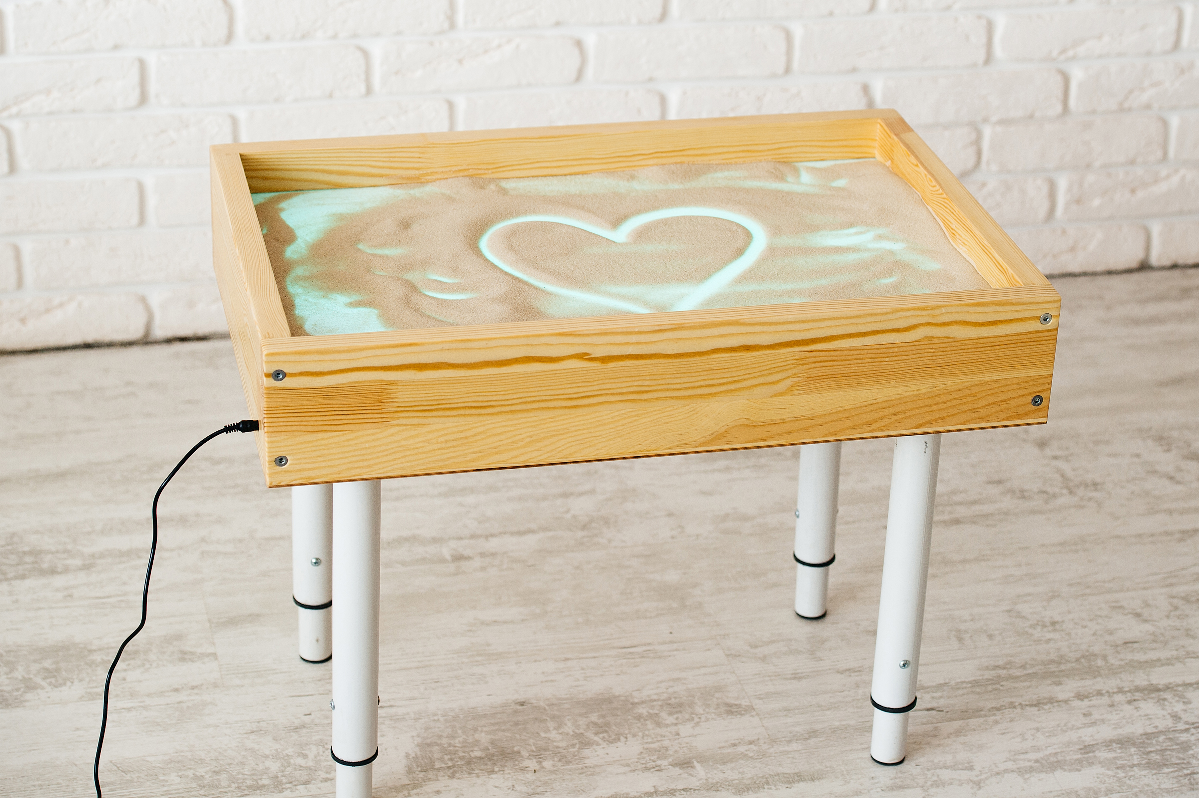 - Световой стол представляет собой прямоугольный стол на высоких ножках, в который встроен резервуар с песком и светодиодный механизм, подсвечивающий песок разноцветным светом.