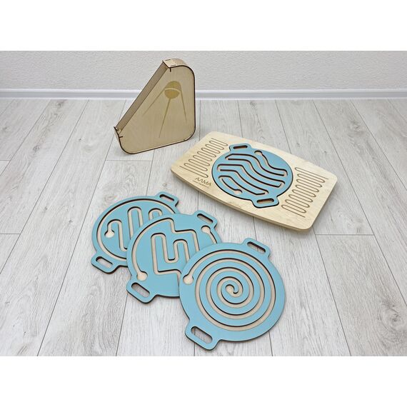 Благодаря заменяемости лабиринтов, игрушка просто универсальна! Дети могут играть отдельно с ручными лабиринтами или вставить их в балансир для ног и соревноваться в ловкости и скорости прохождения.
