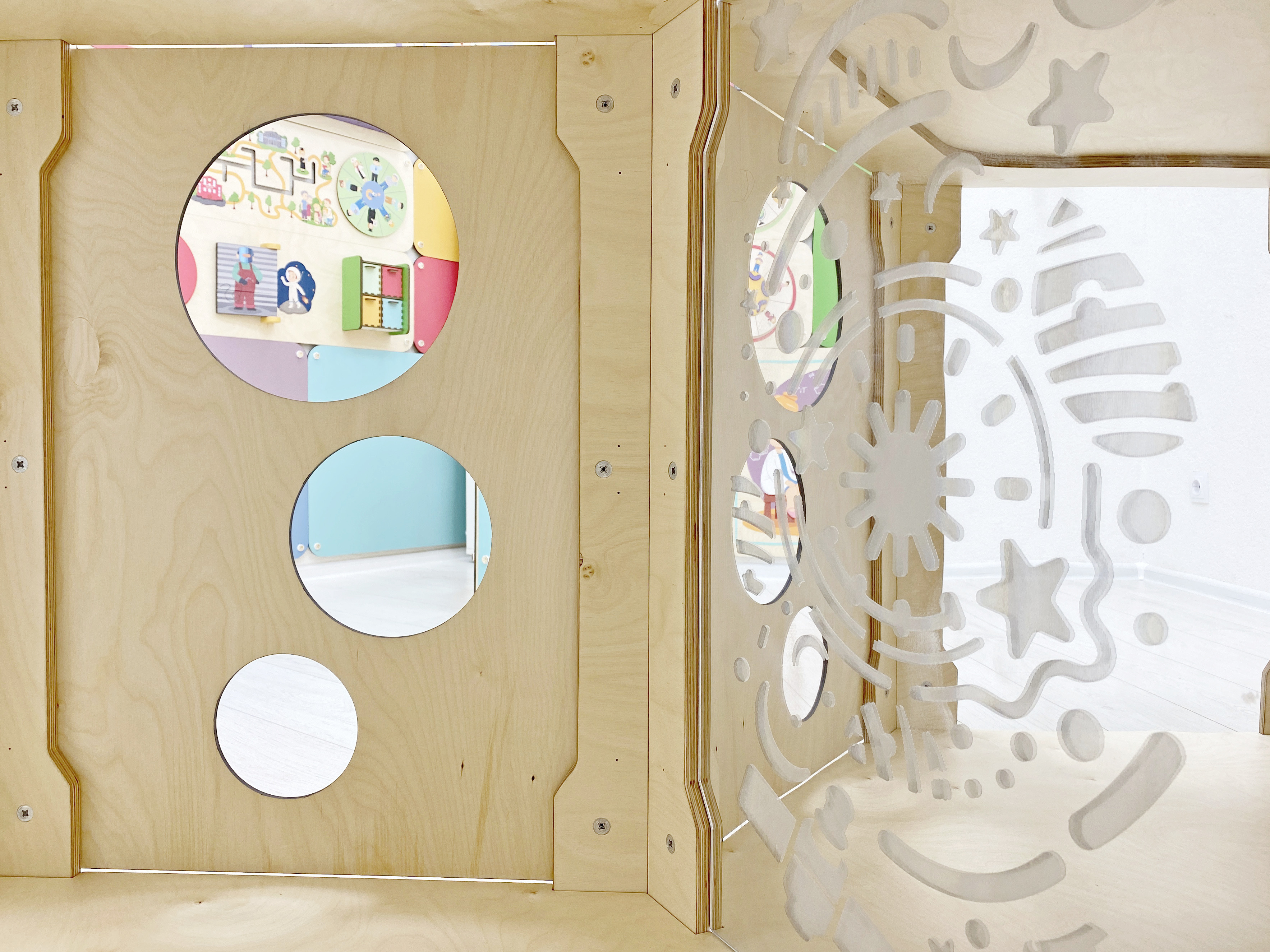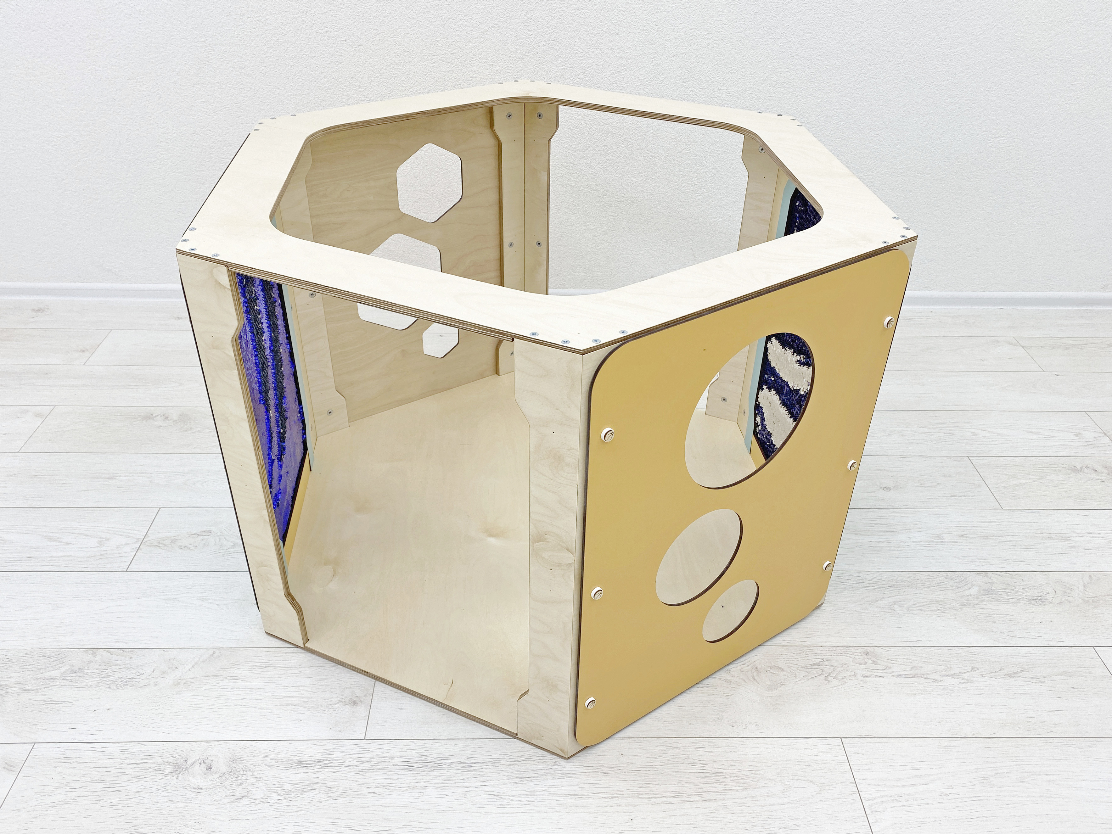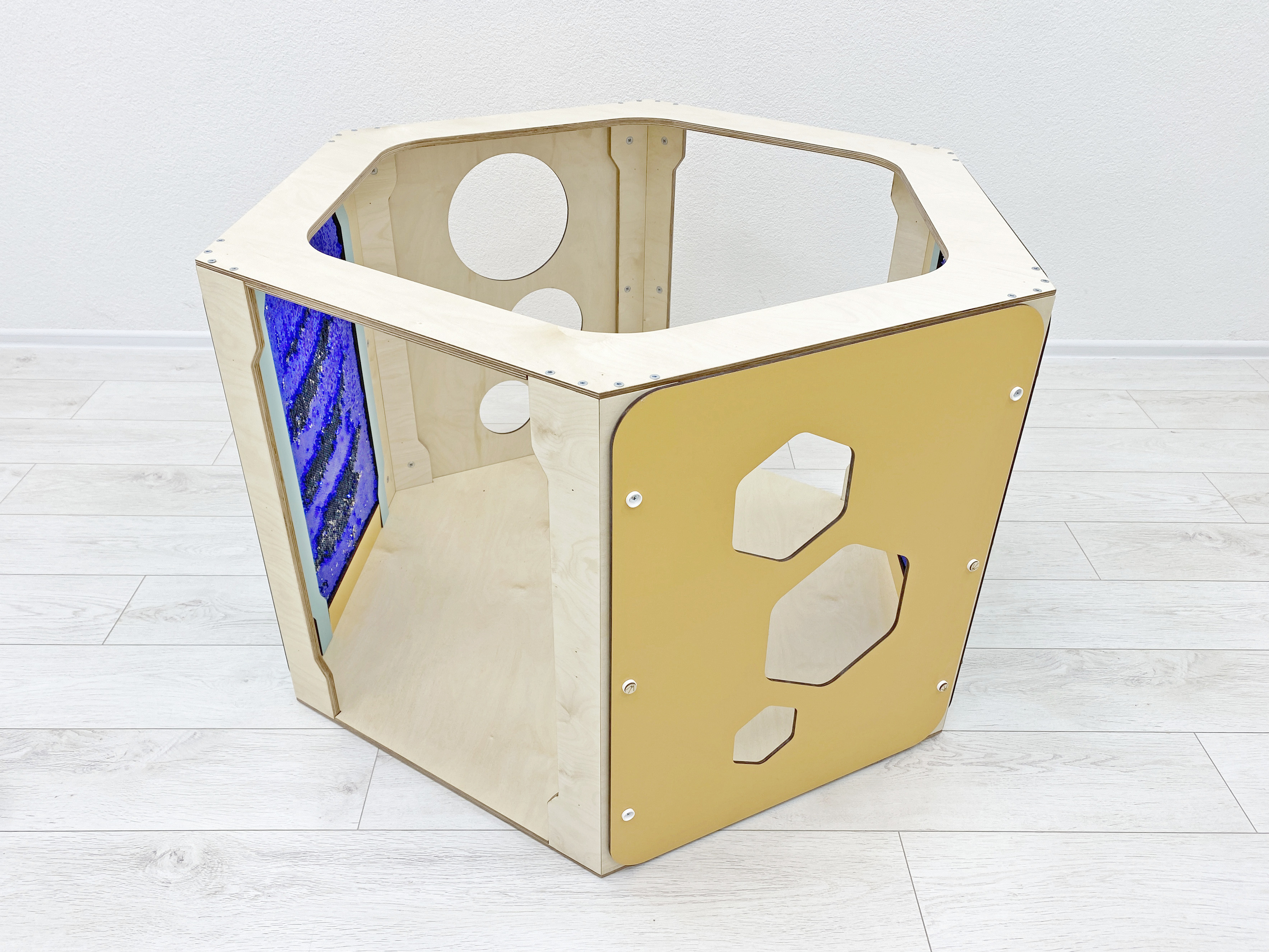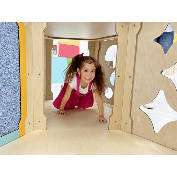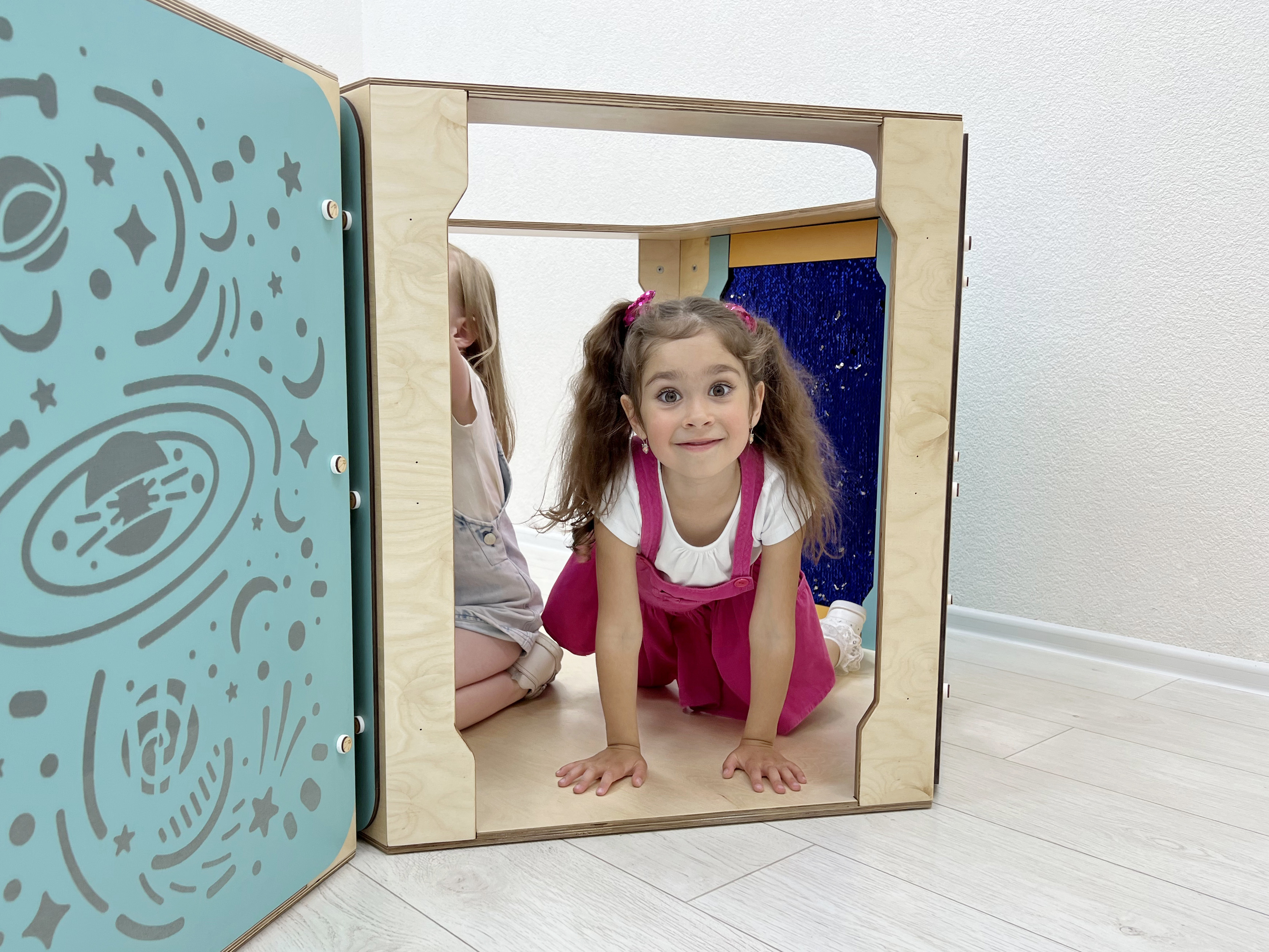 Внутри модули украшены тактильными панелями для развития сенсорной чувствительности, а снаружи – лазерной гравировкой и фигурными окошками. Они идеально стыкуются между собой и позволяют конструировать из них замки и лабиринты для маленьких непосед.
