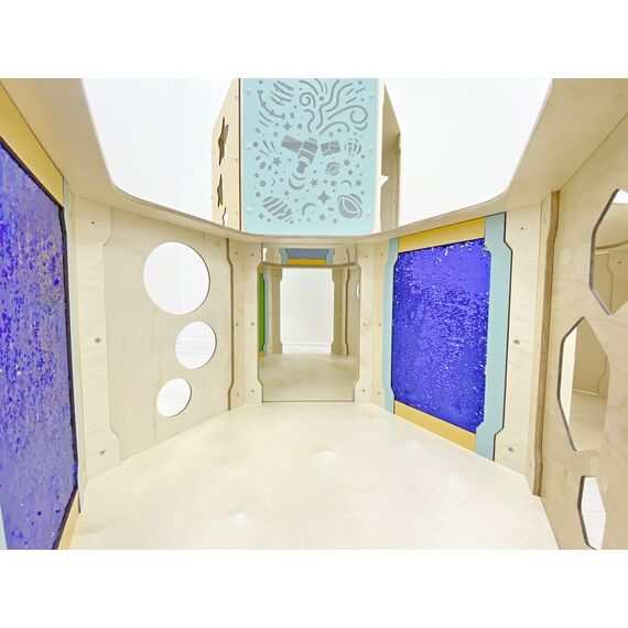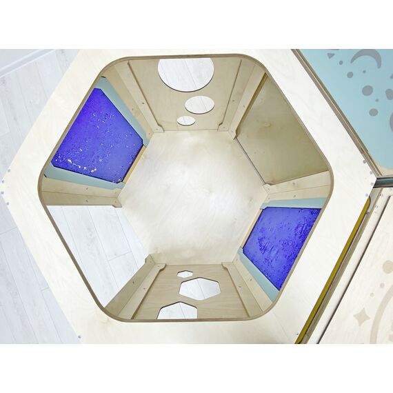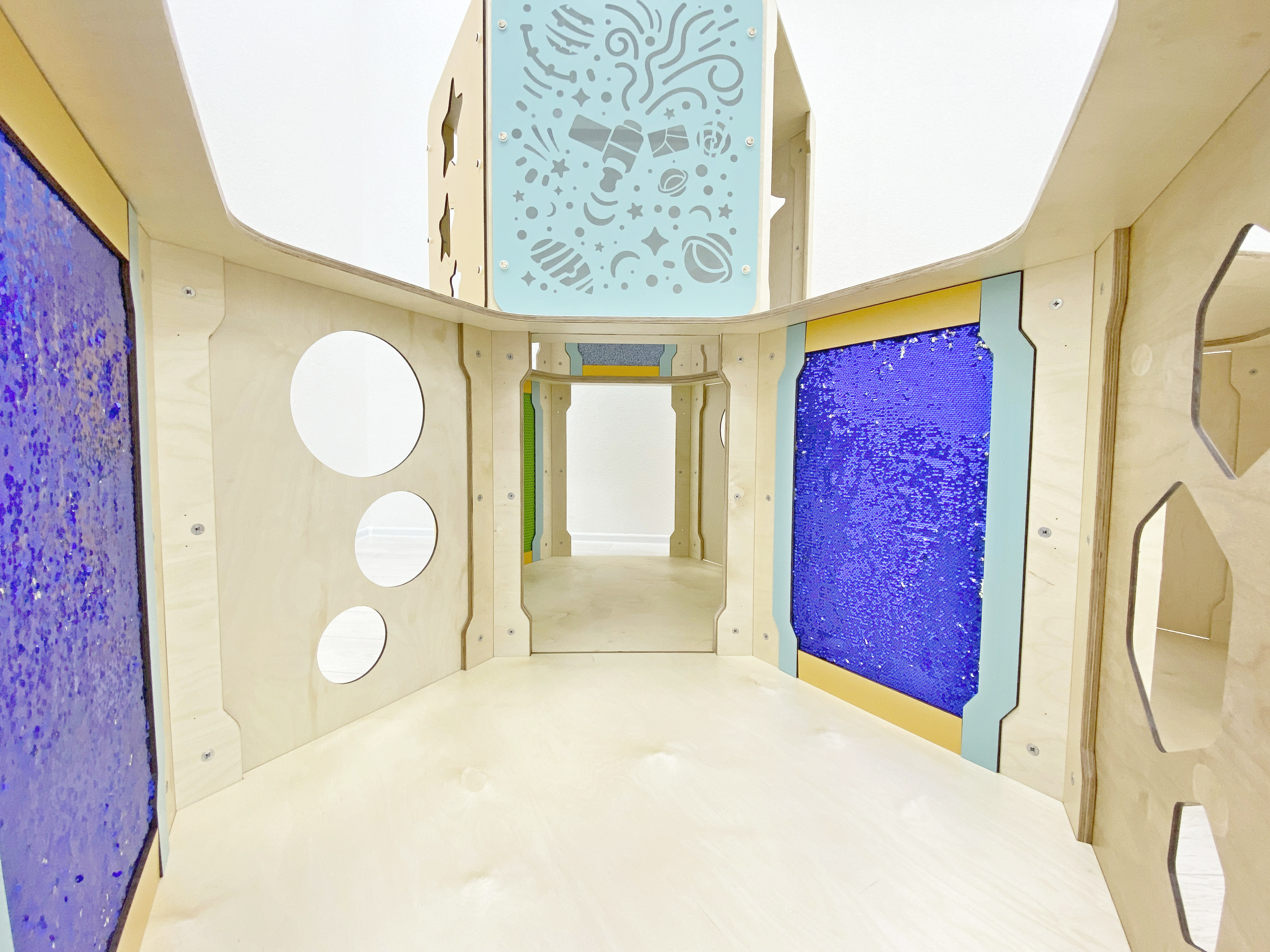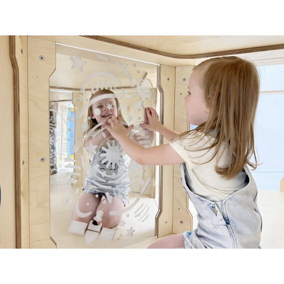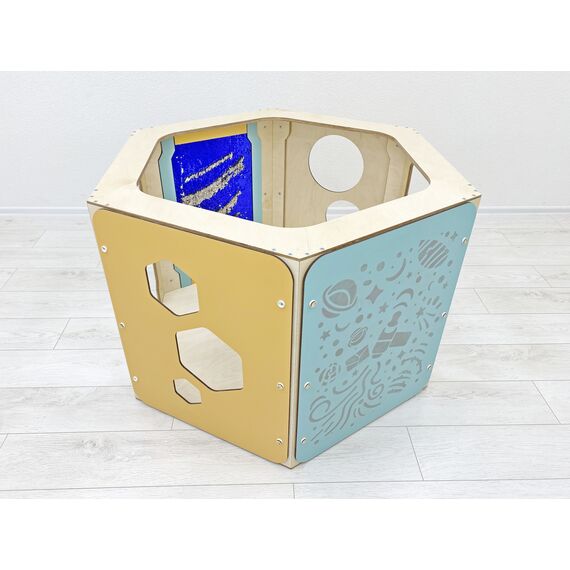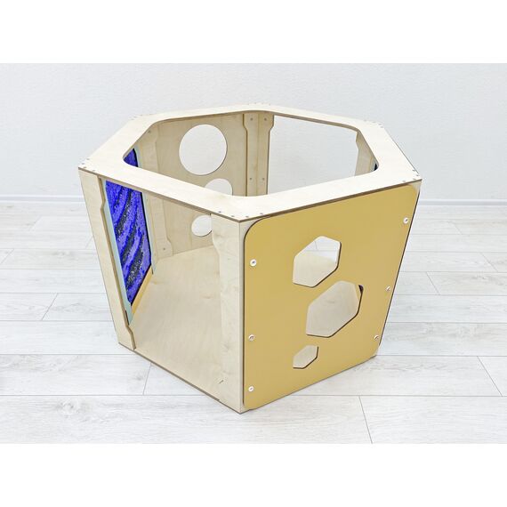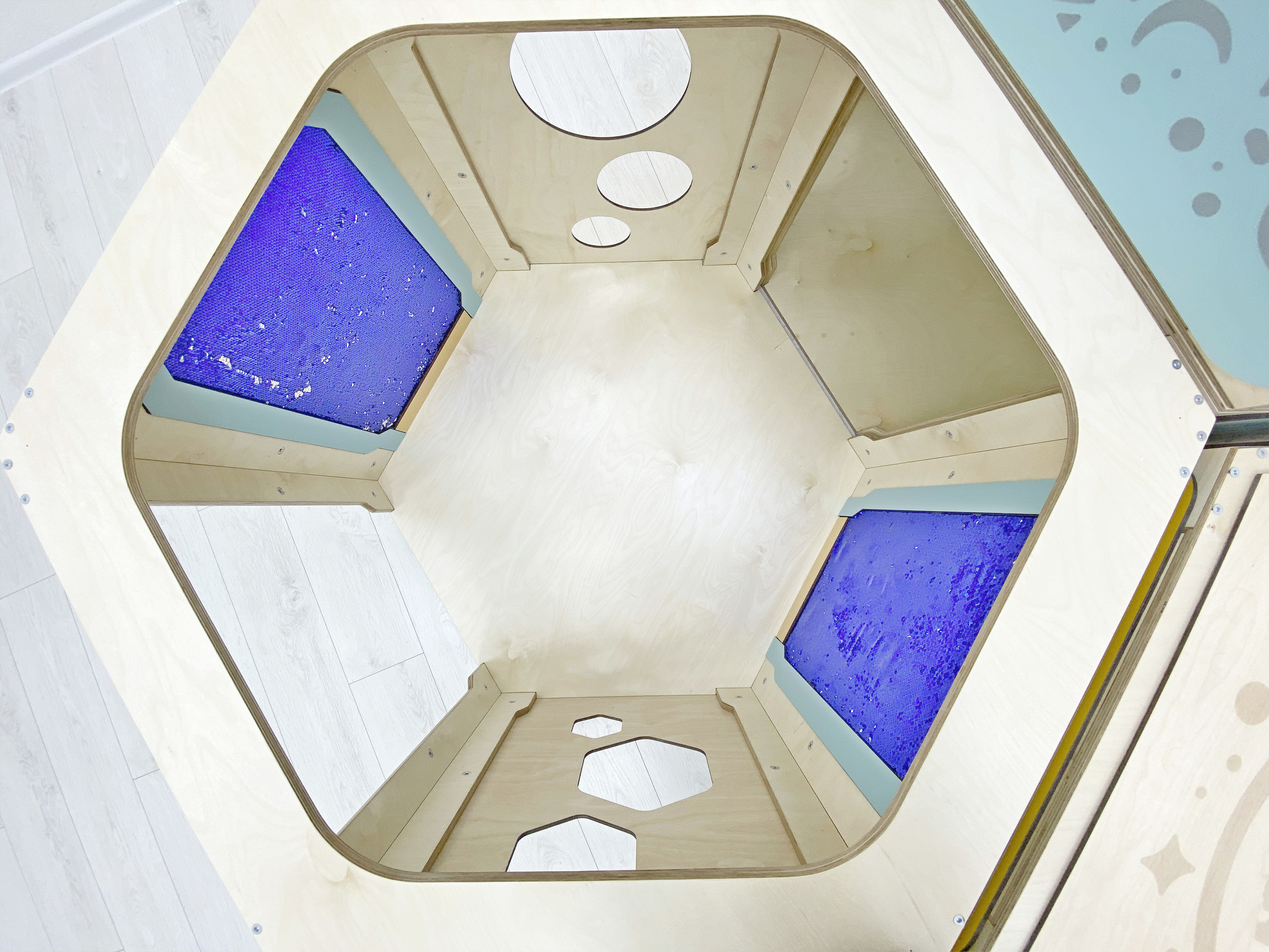 Внутри модули украшены тактильными панелями для развития сенсорной чувствительности, а снаружи – лазерной гравировкой и фигурными окошками. Они идеально стыкуются между собой и позволяют конструировать из них замки и лабиринты для маленьких непосед.