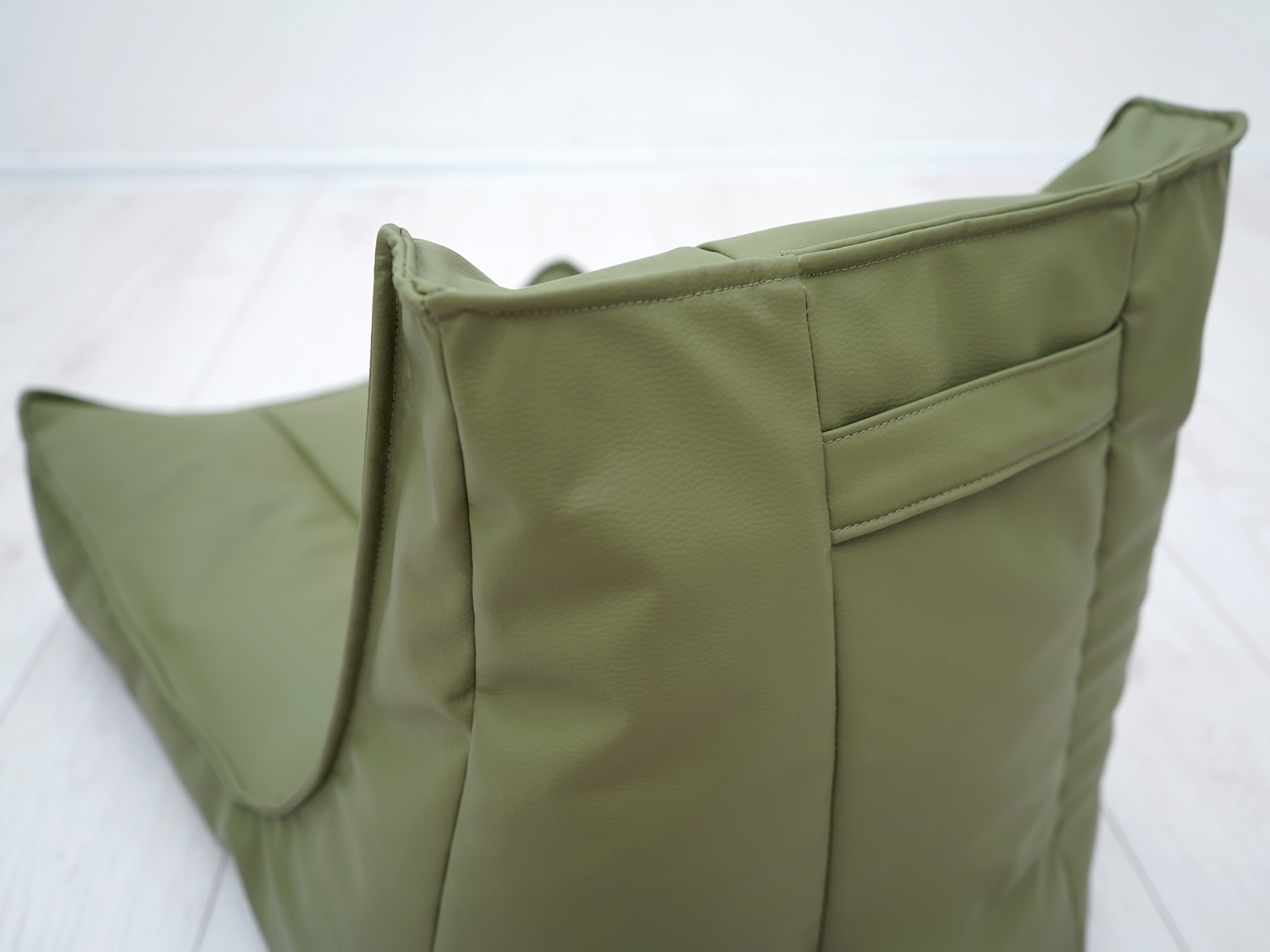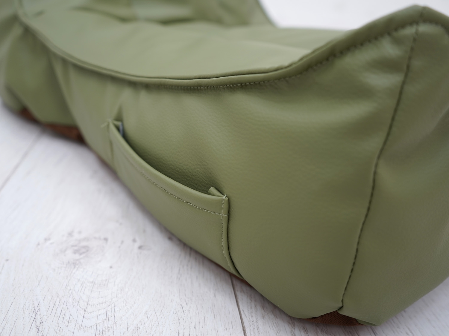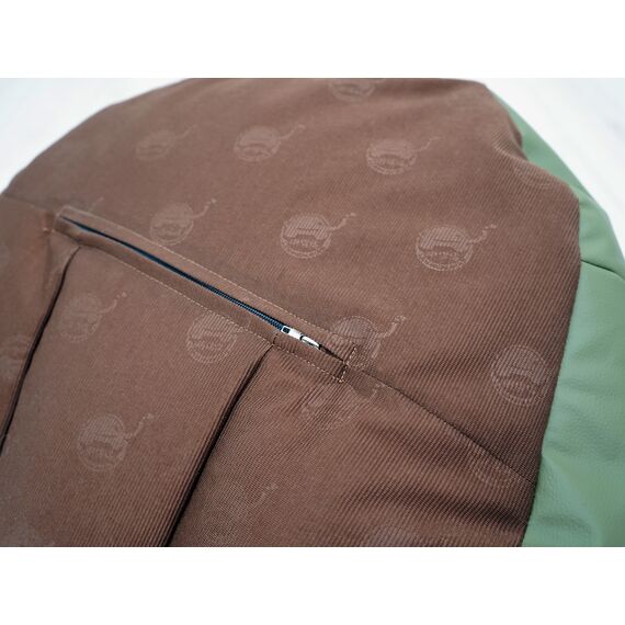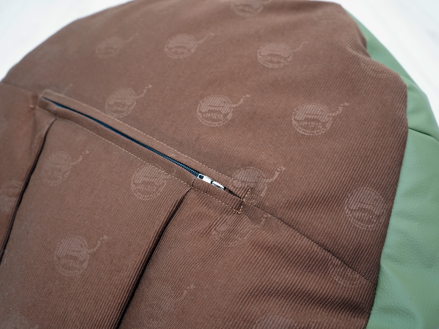 Отсутствие твердых поверхностей и углов обеспечивает безопасное взаимодействие детей с пуфом. Конструкция дополнена ручкой для удобства транспортировки и кармашком на правой стороне. На нижней части пуфа находится потайная молния для контроля количества наполнителя.