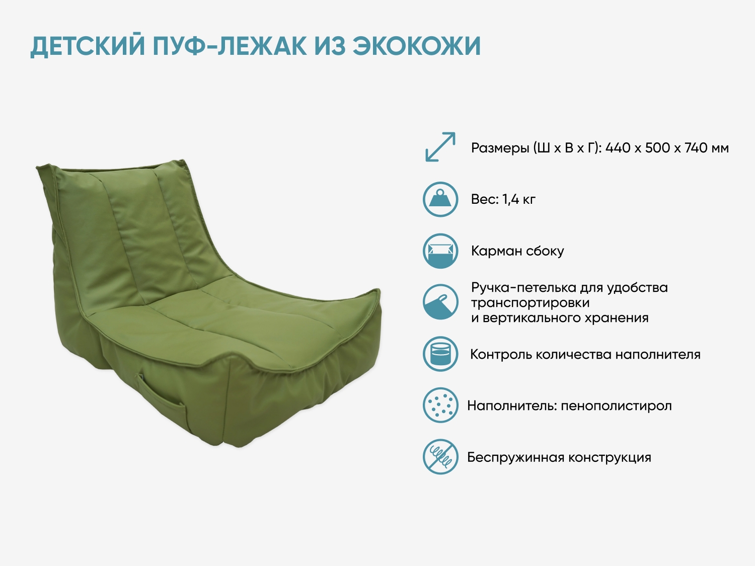 Легкий и удобный бескаркасный пуф для детей. Изготовлен из износостойкой экокожи и наполнен пенополистиролом, что обеспечивает его прочность и легкость.