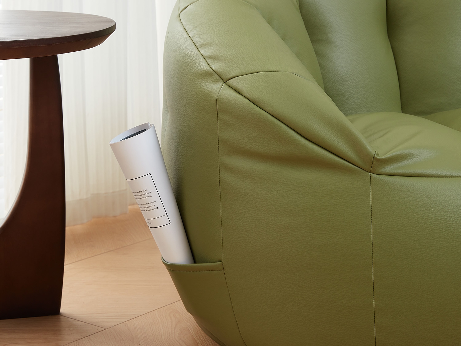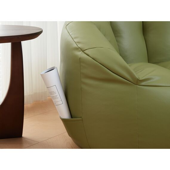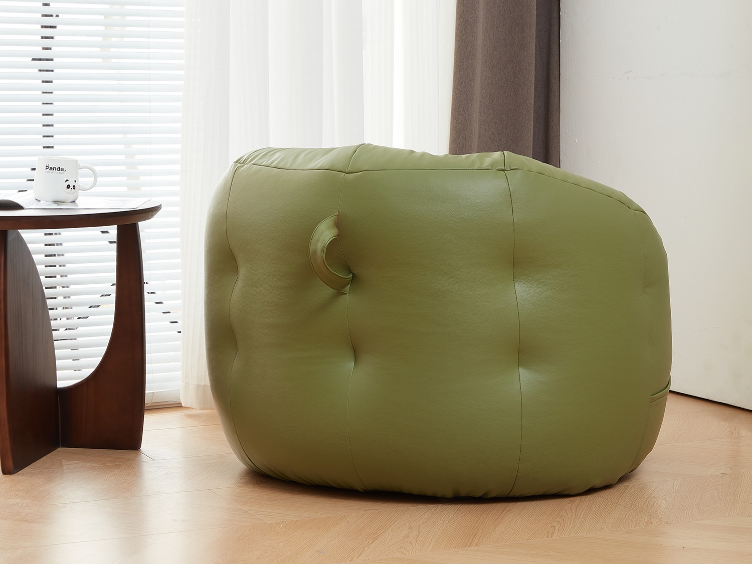 Отсутствие твердых поверхностей и углов обеспечивает безопасное взаимодействие детей с пуфом. Конструкция дополнена ручкой для удобства транспортировки и карманом на правой стороне. На нижней части пуфа находится потайная молния для контроля количества наполнителя.