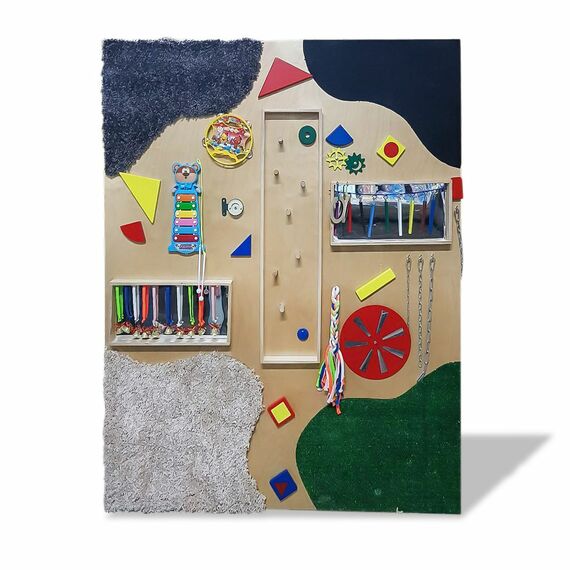 Панель выполнена из прочной высококачественной фанеры с разнообразными текстурами и поверхностями, привлекающих детей яркими цветами и расцветками. Она содержит множество элементов, которые помогают развивать мелкую моторику и интеллект ребенка, и позволяют ему не только потрогать элементы панели, но и создавать мелодии, играя на металлофоне и других приложенных элементах.