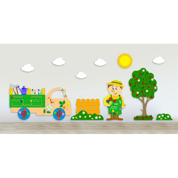 Комплексное настенное решение В саду является универсальной игрушкой, которая способствует всестороннему развитию малыша, а также обеспечивает ему много времени увлекательной игры и развлечения. Все компоненты изготовлены из экологически чистых материалов. Они не имеют никакого токсичного запаха, не вызывают раздражения или аллергических реакций, что являются безопасными для здоровья малыша.