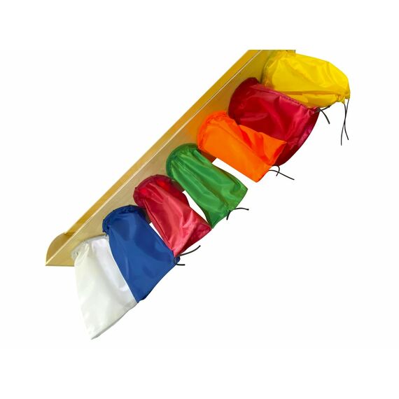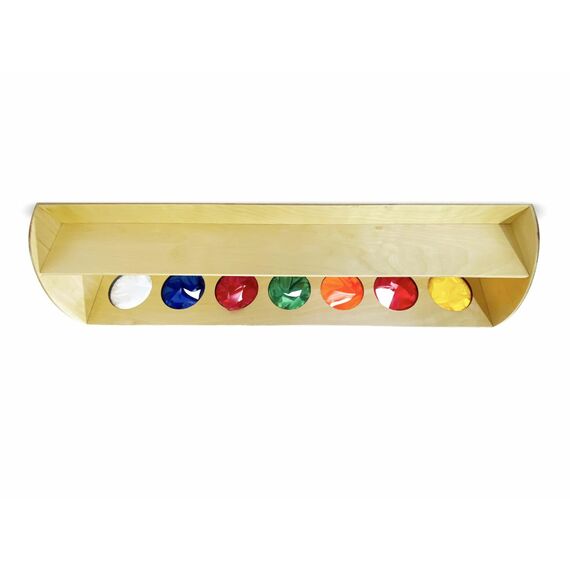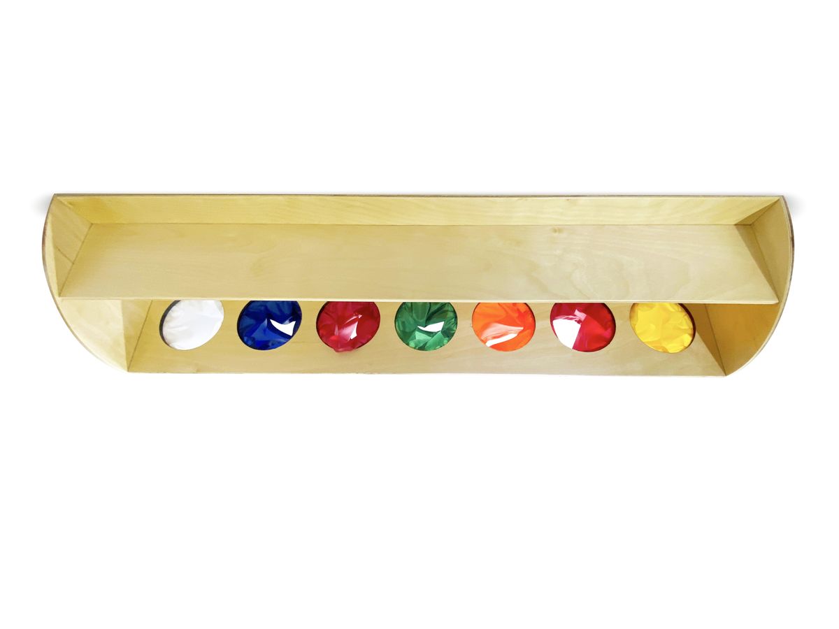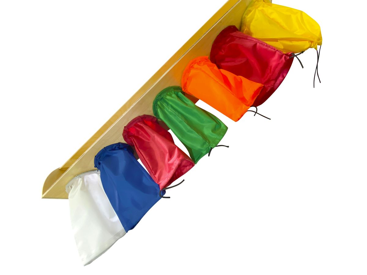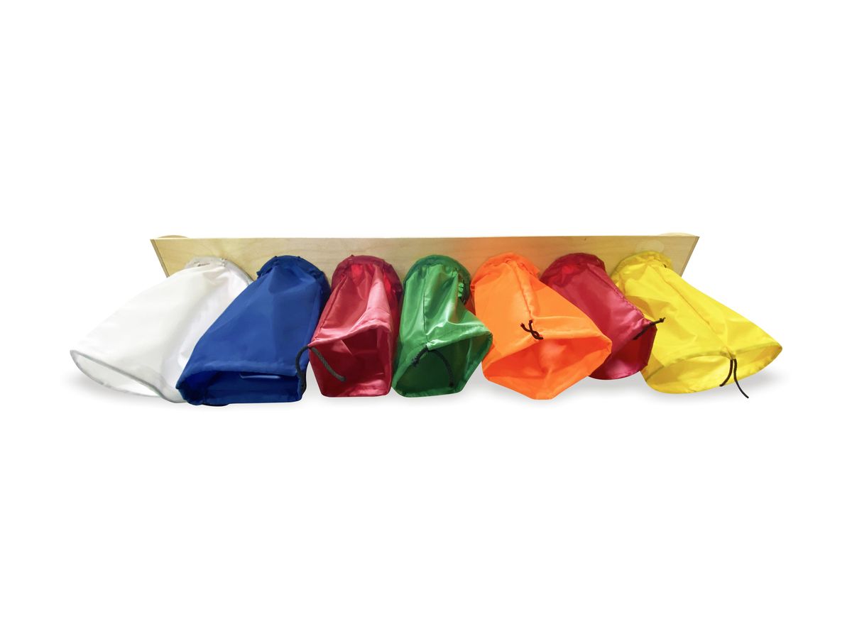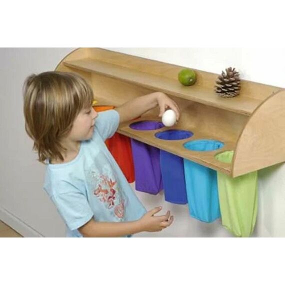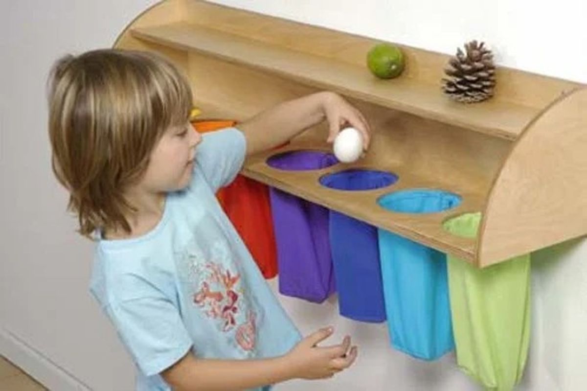 Модуль крепится на стене, что делает его удобным для детской комнаты, он не занимает много места и привлекательно смотрится. Конструкция выполнена из натуральной фанеры, а углы максимально скруглены для безопасности ребенка. Мешочки имеют вытянутую форму, чтобы предметы были скрыты от глаза, а яркие цвета помогают детям узнать цветовую палитру.
