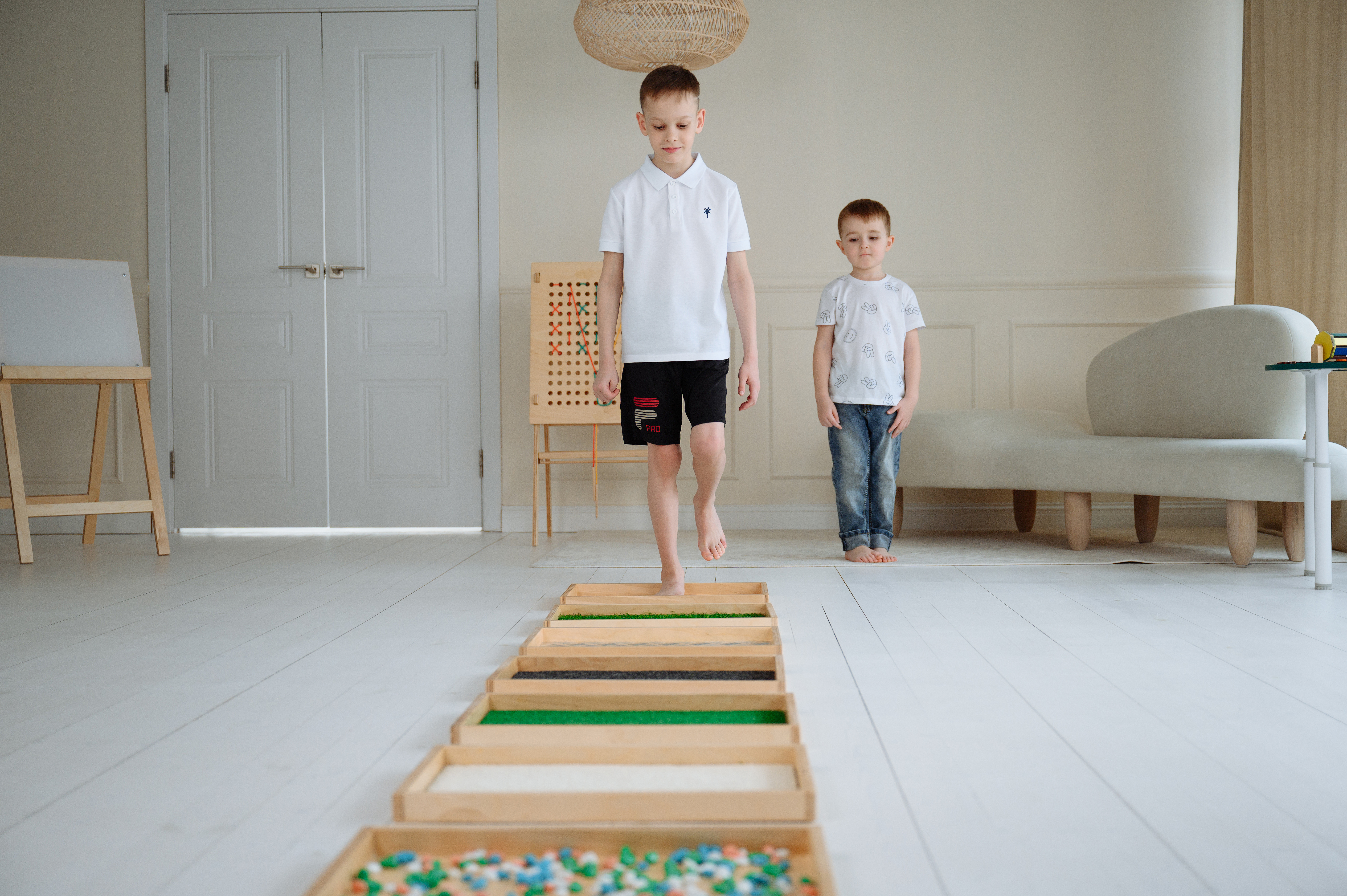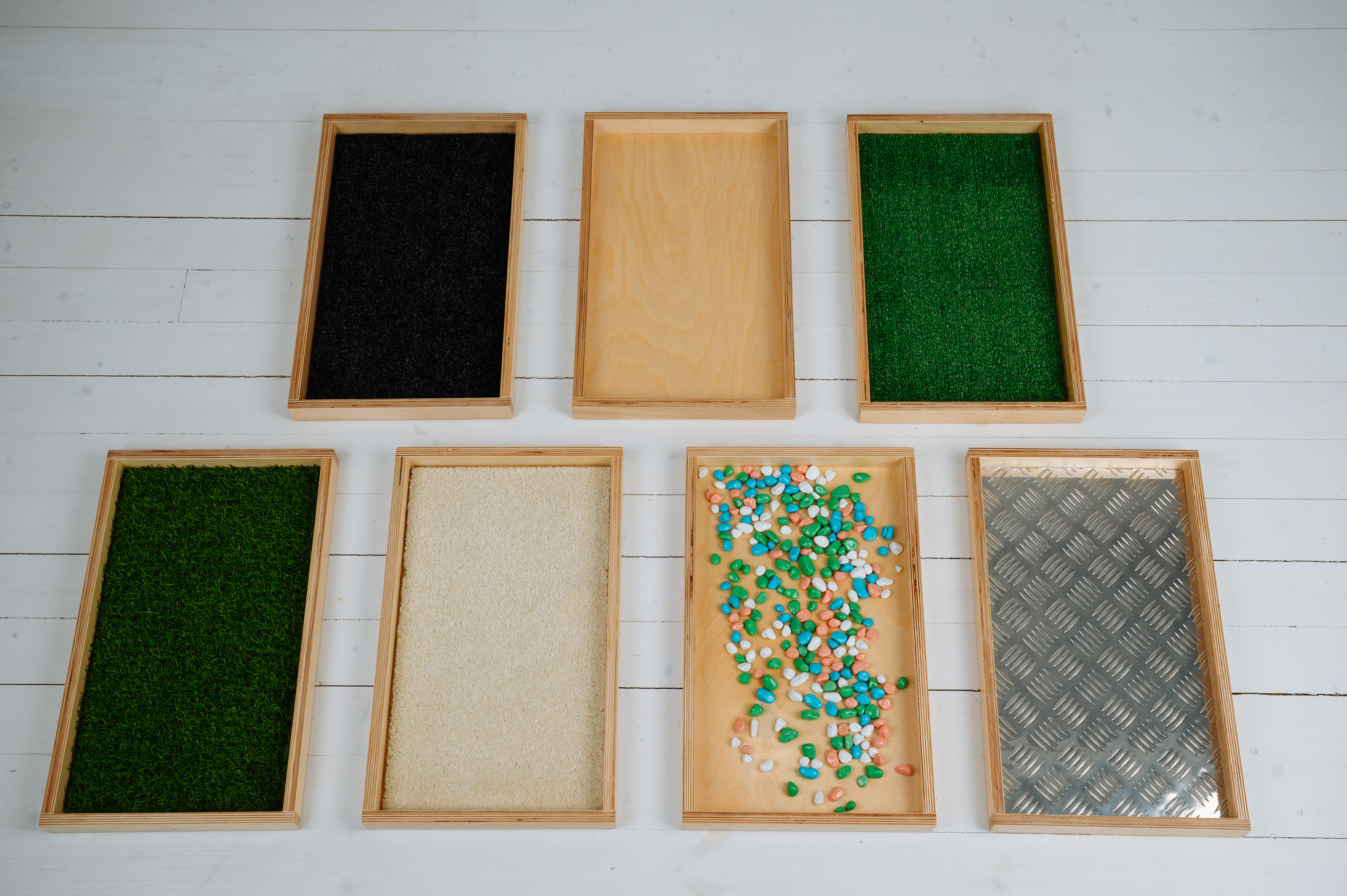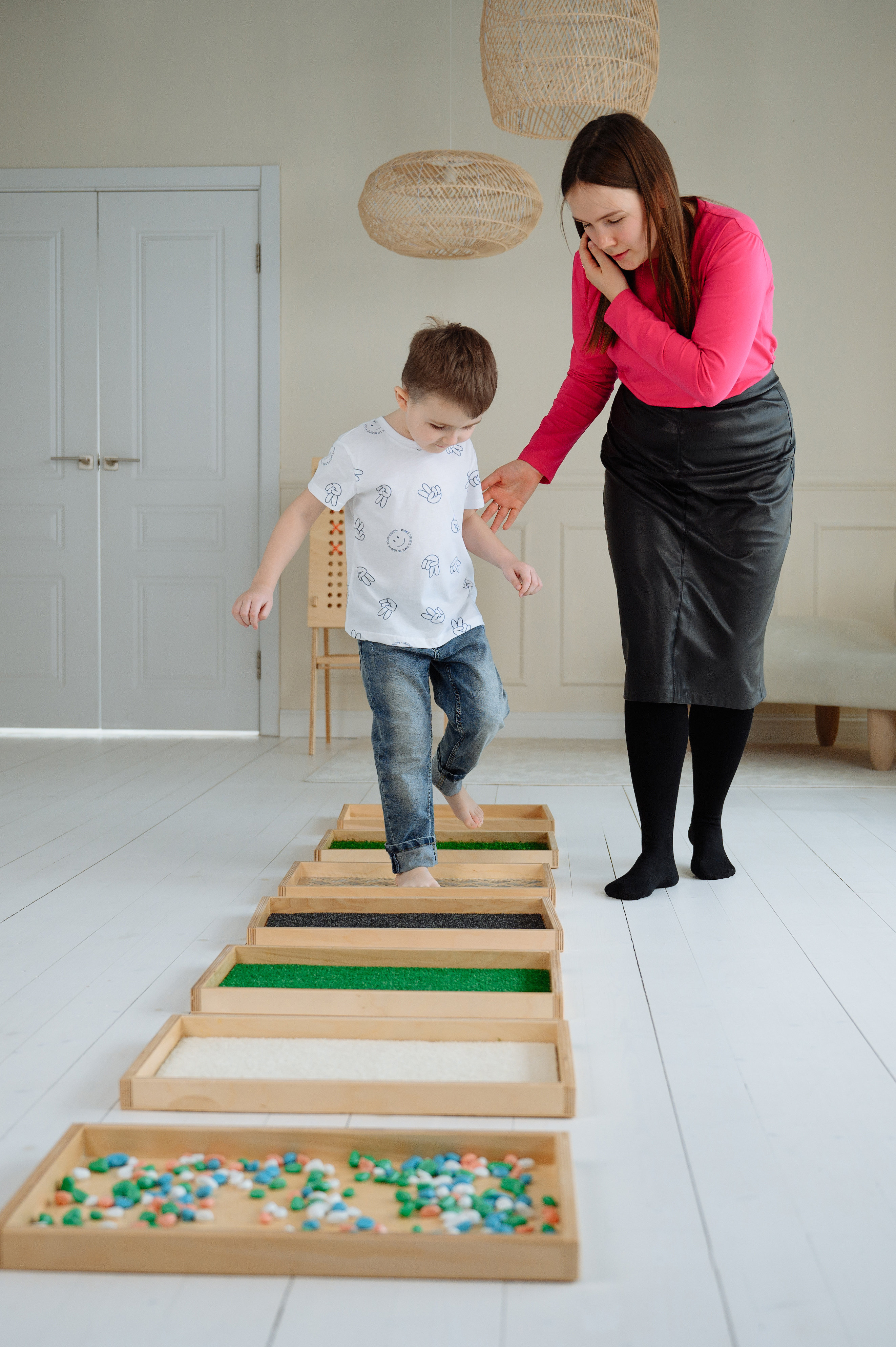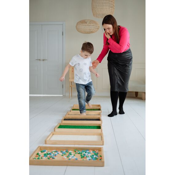 Тактильная дорожка из 7 модулей очень полезна для развития осязания у детей. Этот тренажер используется педагогами в детских учреждениях и позволяет малышам потрогать предметы разных форм, текстур и цветов, а затем на ощупь назвать их с закрытыми глазами.
