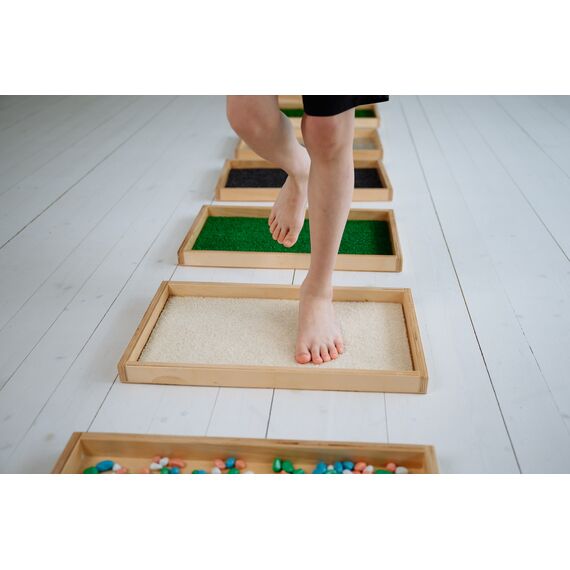 Тактильная дорожка имеет несколько особенностей. Она содержит семь небольших ящиков с предметами разных текстур, таких как трава, галька, ковролин, и другие. Этот продукт имеет компактное хранение и состоит из легких ящиков, которые можно установить друг на друга. Дорожка является идеальным продуктом для развития тактильных ощущений у малышей. Они будут проводить пальчиками и ладонями по поверхностям ящиков, изучать новые текстуры и находить похожие предметы среди различных вещей.