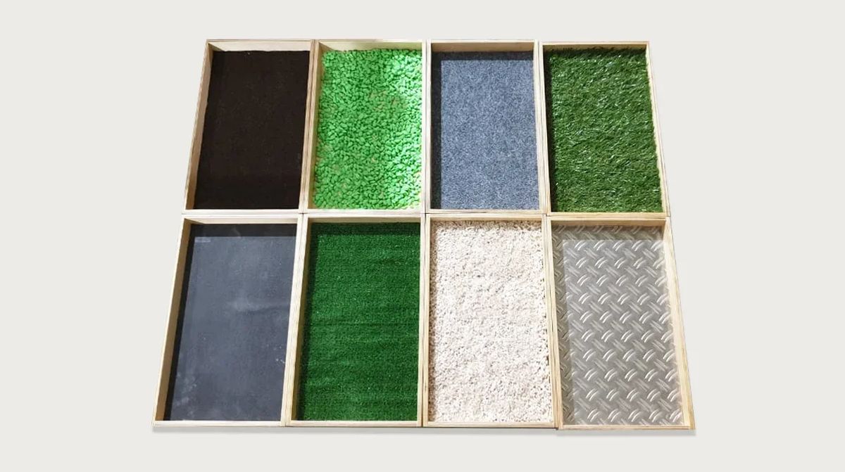 В состав данного тренажера входят материалы, такие как короткая и длинная искусственная трава, ковролин с мягкими и жесткими ворсинками, мягкий ковер, бархатная ткань, лист металла, лист с шероховатой поверхностью.