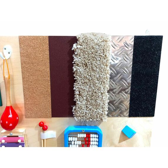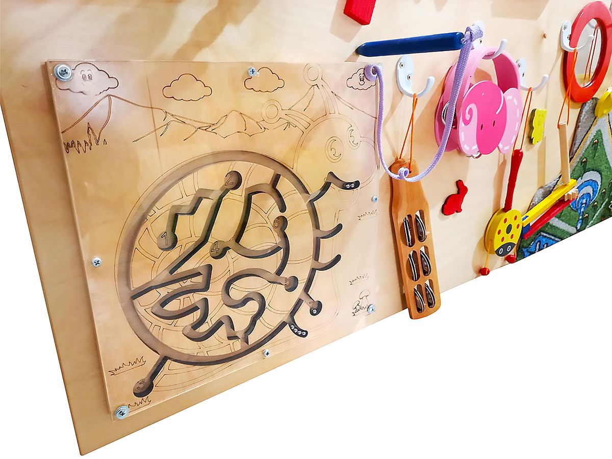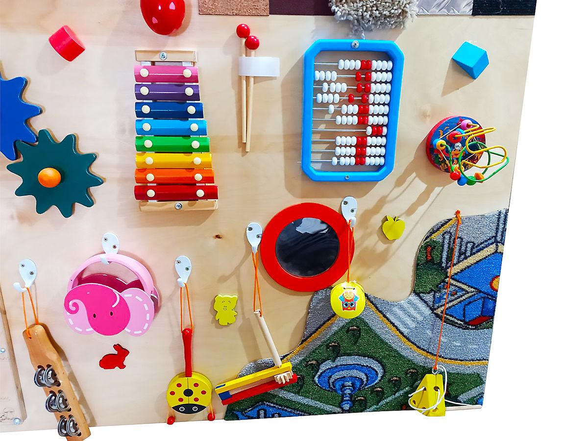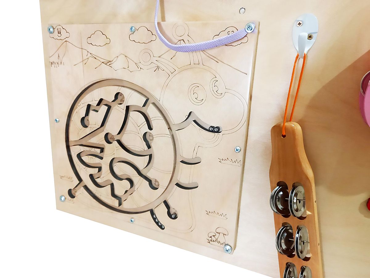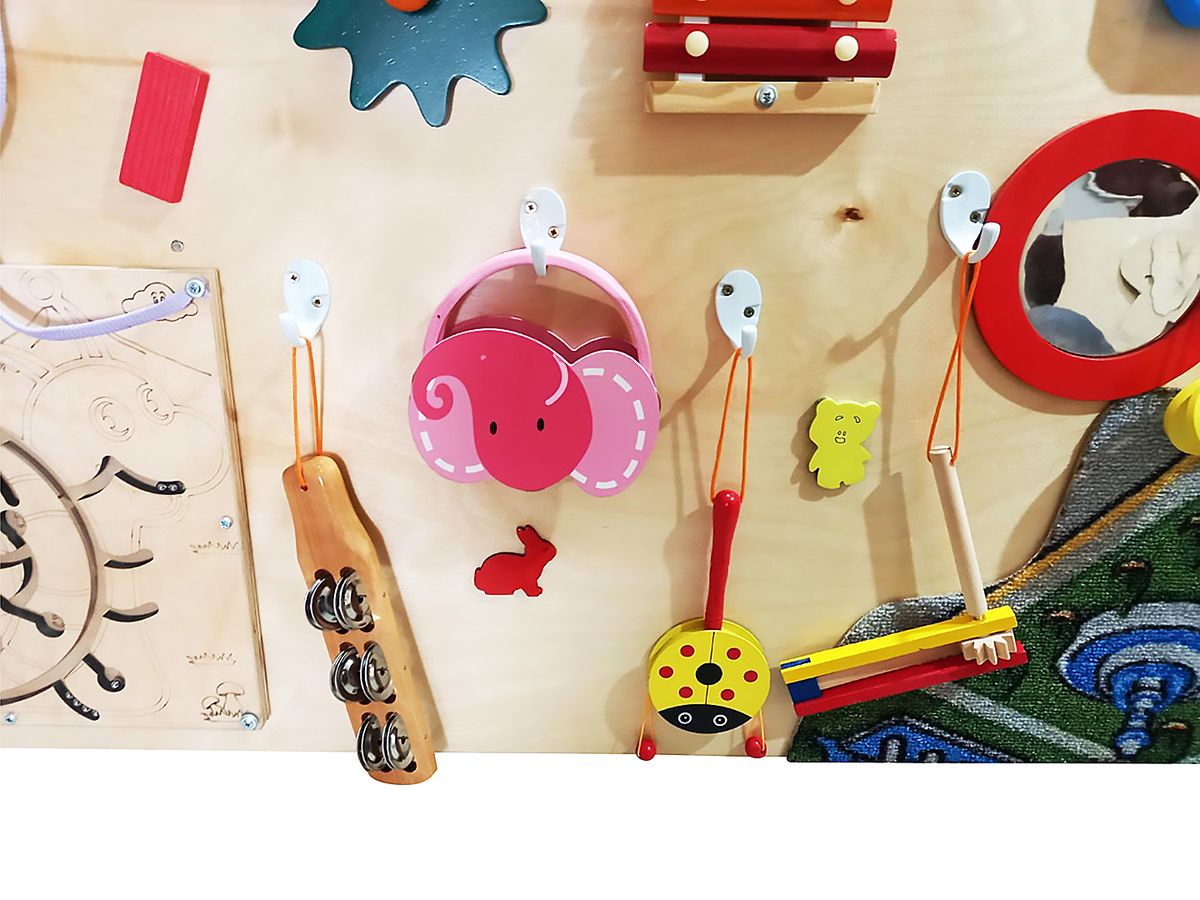 Тактильная панель "Мелодия счастья" содержит разнообразные элементы, предназначенные для развития слуха, речи, мелкой моторики, а также для обогащения тактильных ощущений и социальных навыков детей. На панели находятся различные материалы, такие как металл, пробка, ковролин, искусственная трава, а также разнообразные игрушки и инструменты, зеркала, счеты, лабиринты и другие элементы. Панель выполнена из фанеры, а все детали тщательно закреплены и безопасны для детей.
