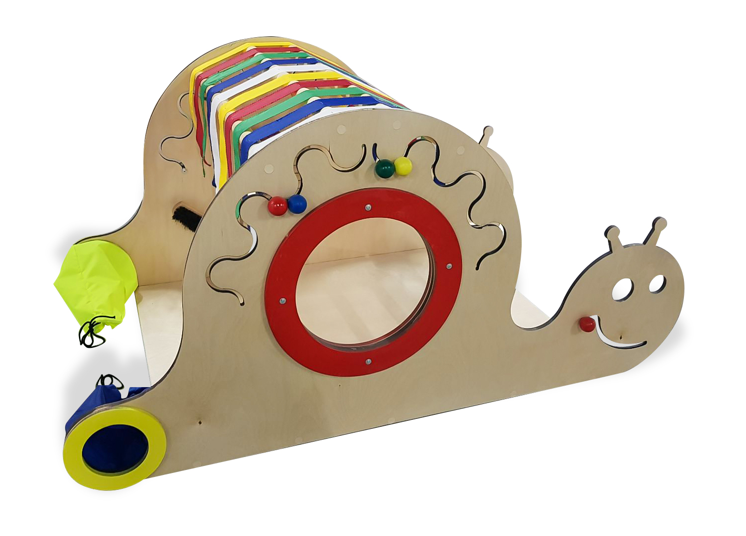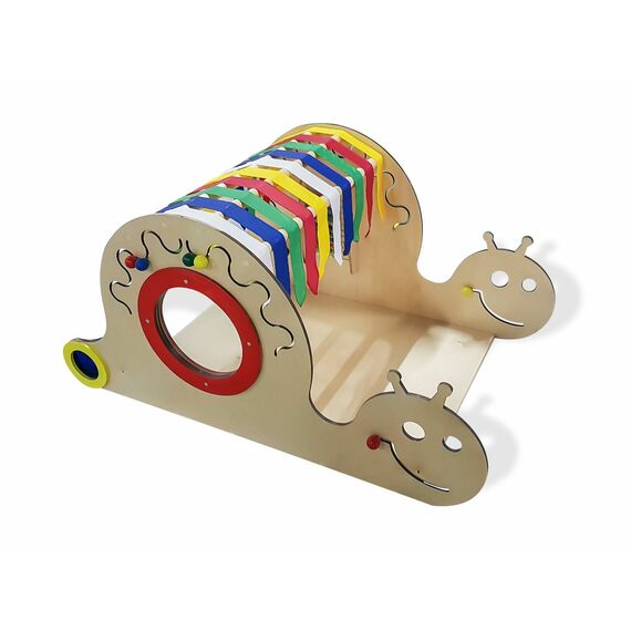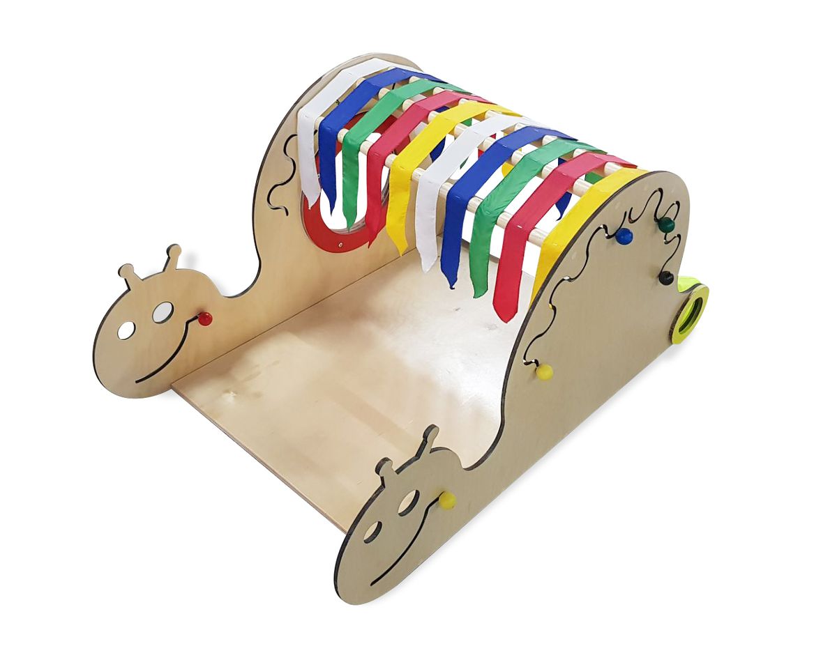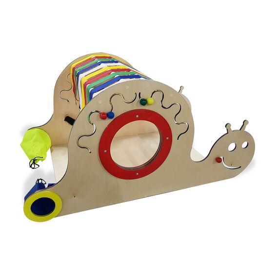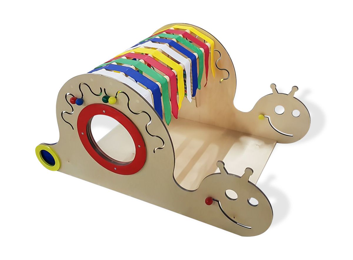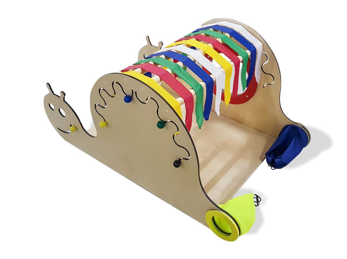 Комплекс имеет окно-иллюминатор, которое защищено специальной накладкой по краям. Он также содержит разноцветные флажки основных цветов изготовленные из качественного текстиля, а также контрастные вставки. Рот улитки, выполненный из лабиринта с передвижной деталью, находится с двух сторон. Такие же элемента размещены в разных частях комплекса. Также имеются мешочки, в которые можно положить предметы и предложить ребенку на ощупь отпределить их.