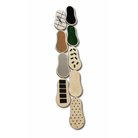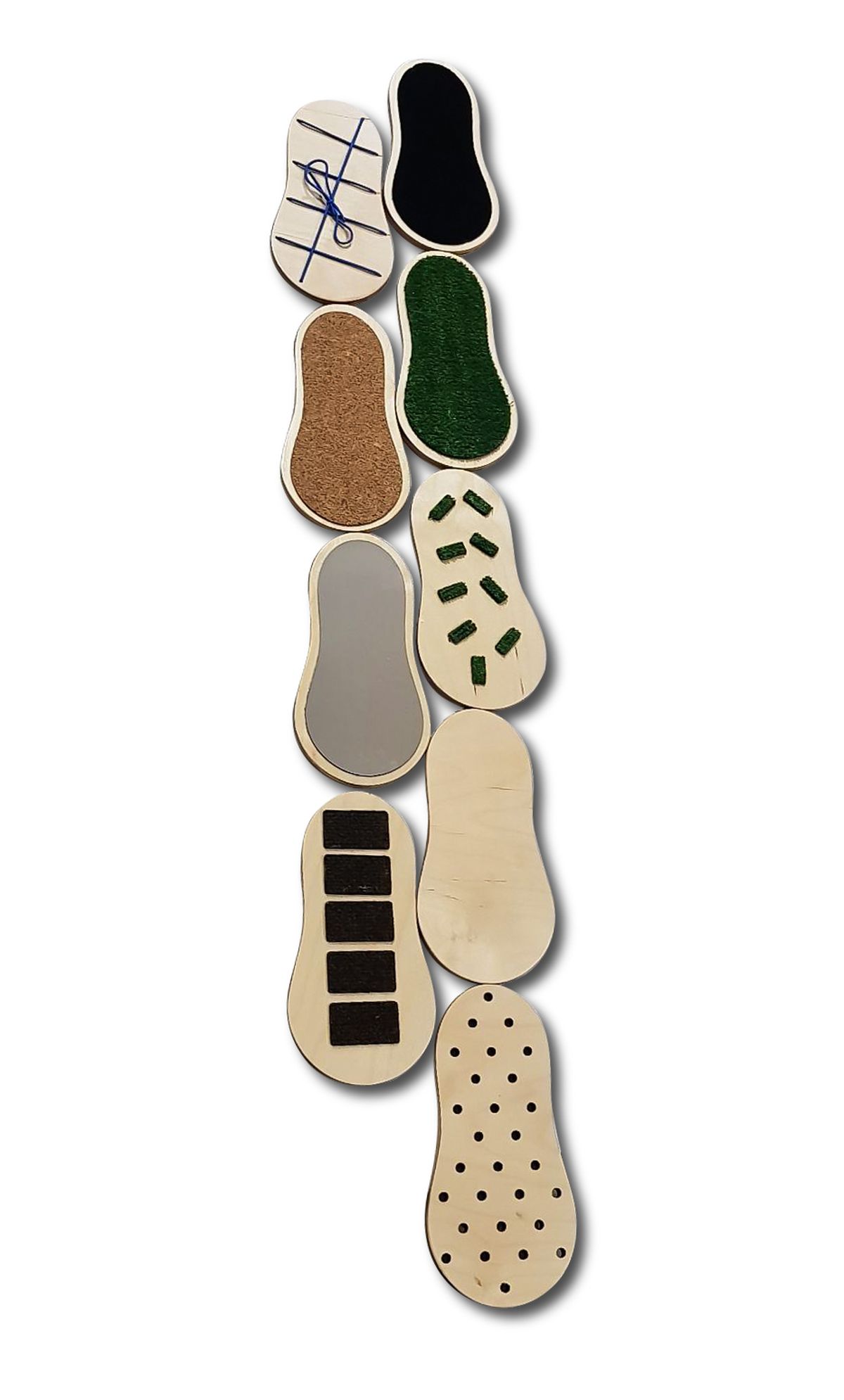 Тактильные следы включают 9 модулей с различными покрытиями, такими как краска, выпуклые точки, веревки, пробка, наждачная бумага, искусственная трава и дерево. Модули выполнены из прочной, гладкой фанеры.