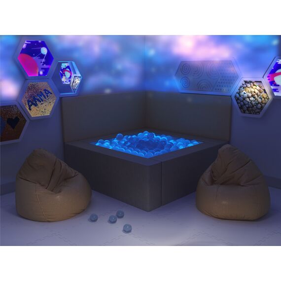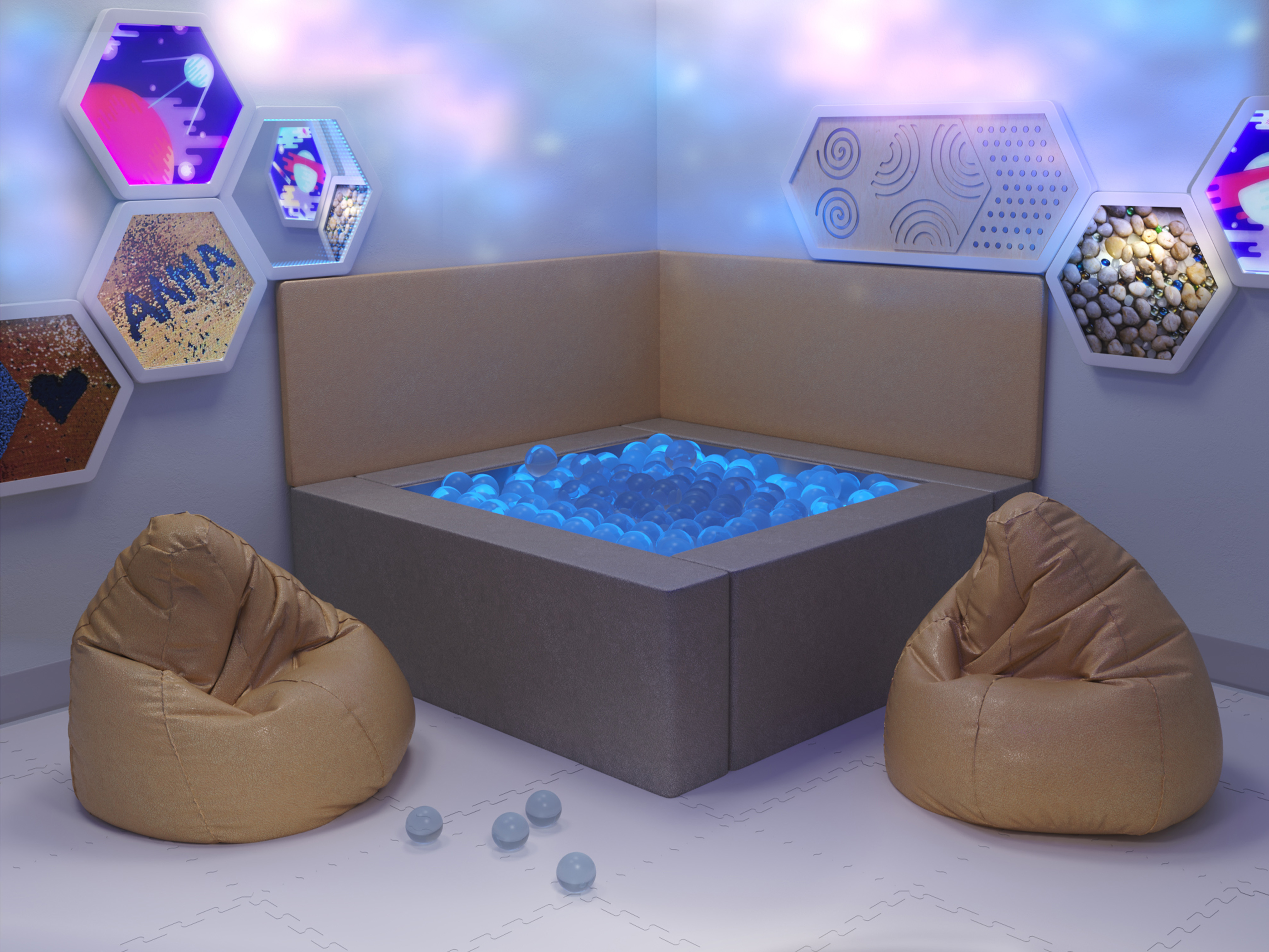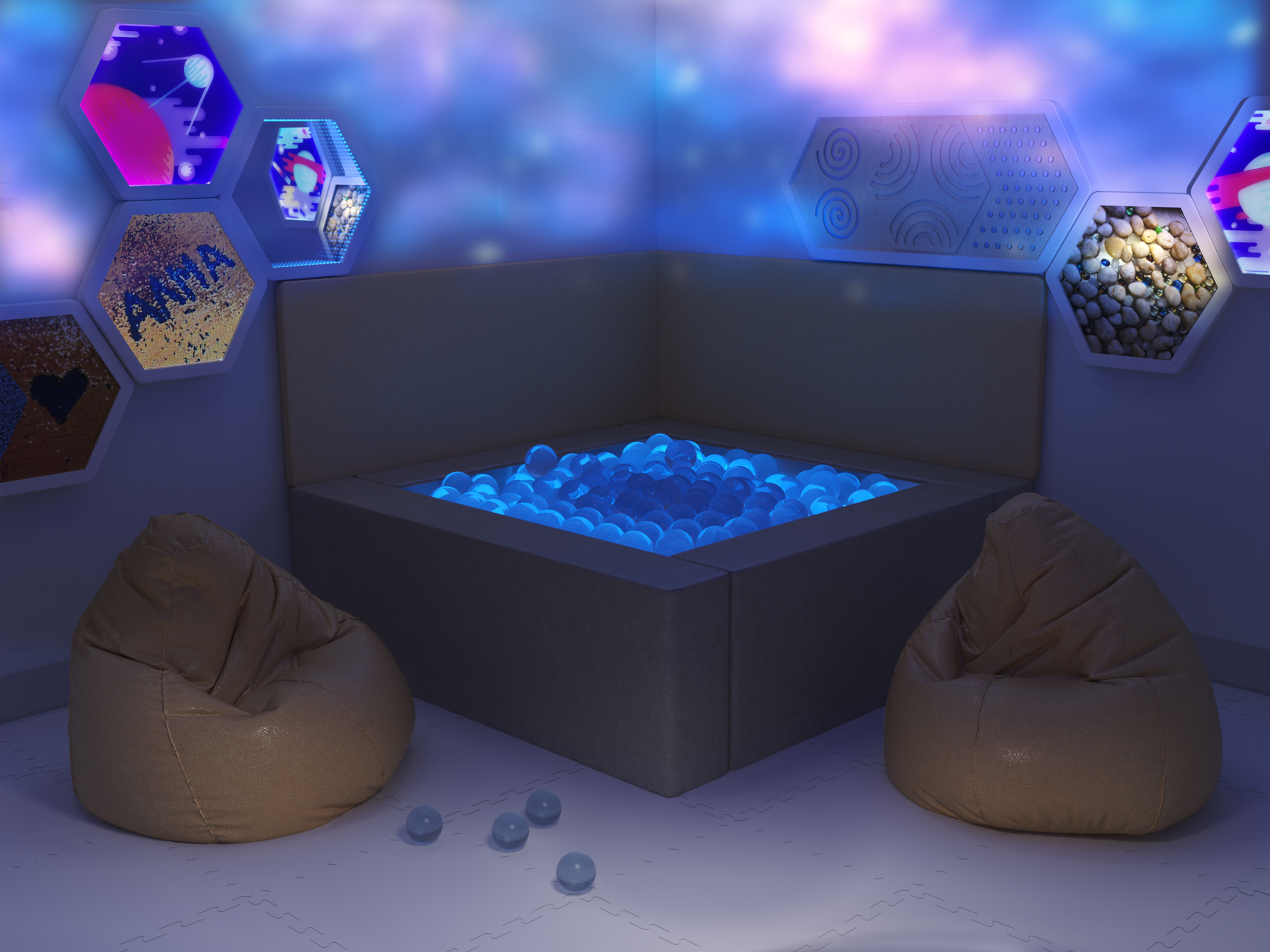 Сухой бассейн с шариками – это универсальное оснащение для сенсорной комнаты, в нём можно как играть и веселиться, так и расслабляться под тихую, спокойную музыку, чувствуя успокаивающее давление шариков на кожу. Подходит для активационной и релаксационной практики.