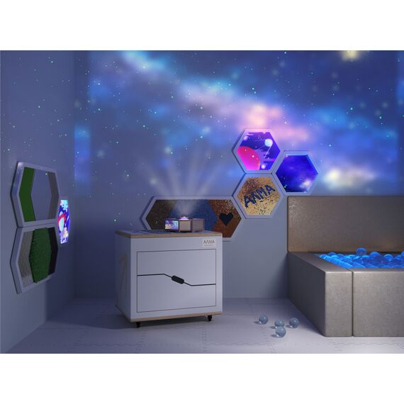 Проектор звёздного неба «Галактон» также служит для расслабления, ощущения покоя и безопасности. Он погружает комнату в атмосферу летней ночи с волшебным сиянием созвездий и тихой умиротворяющей музыкой. В нём есть 10 режимов, таймер отключения и возможность добавлять любое музыкальное сопровождение.