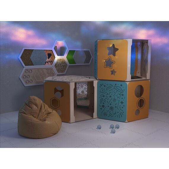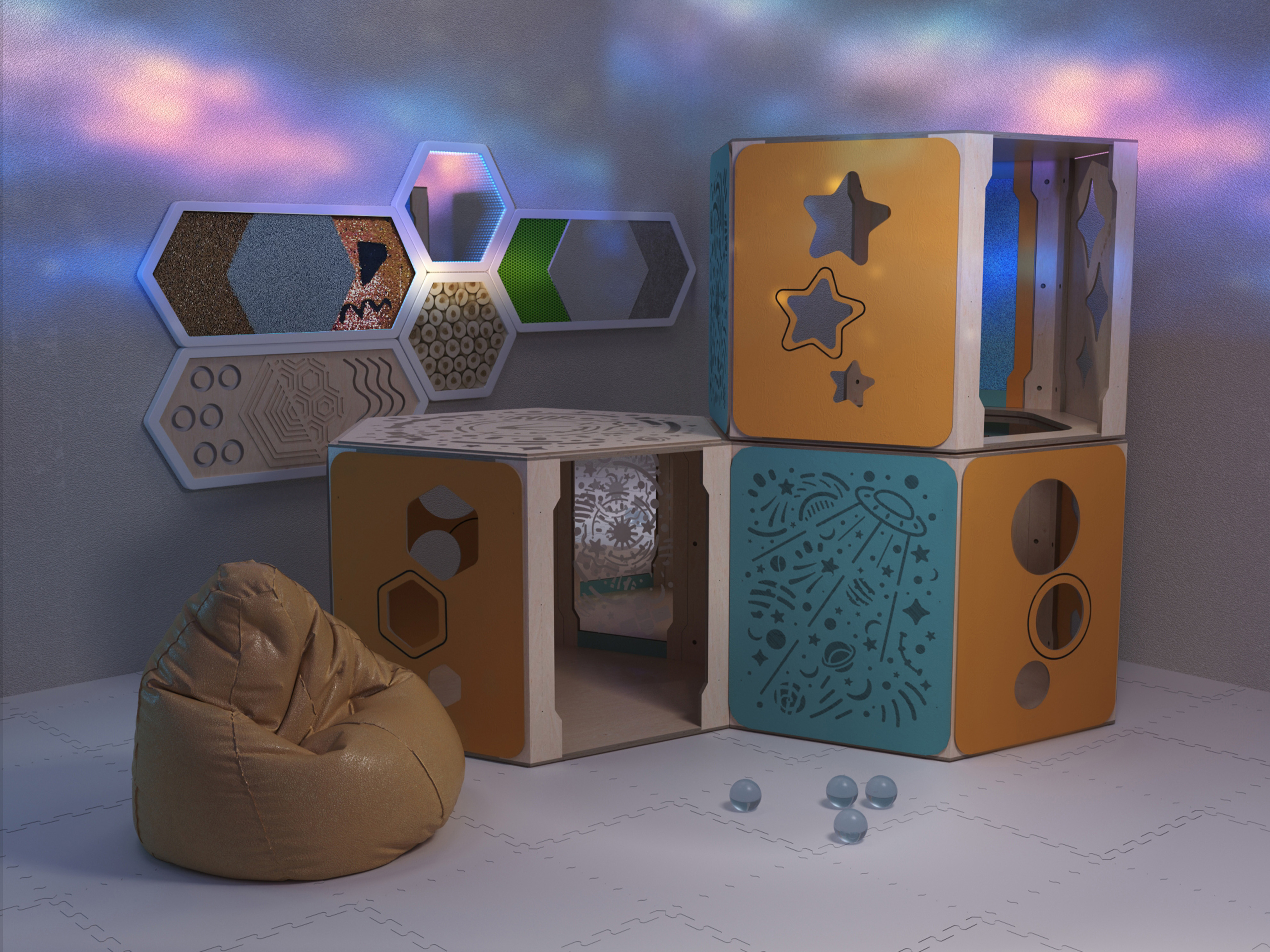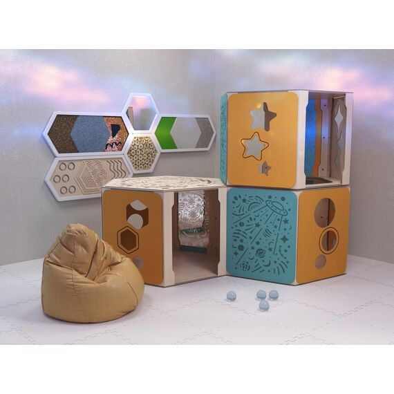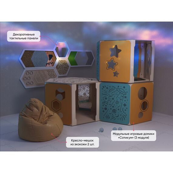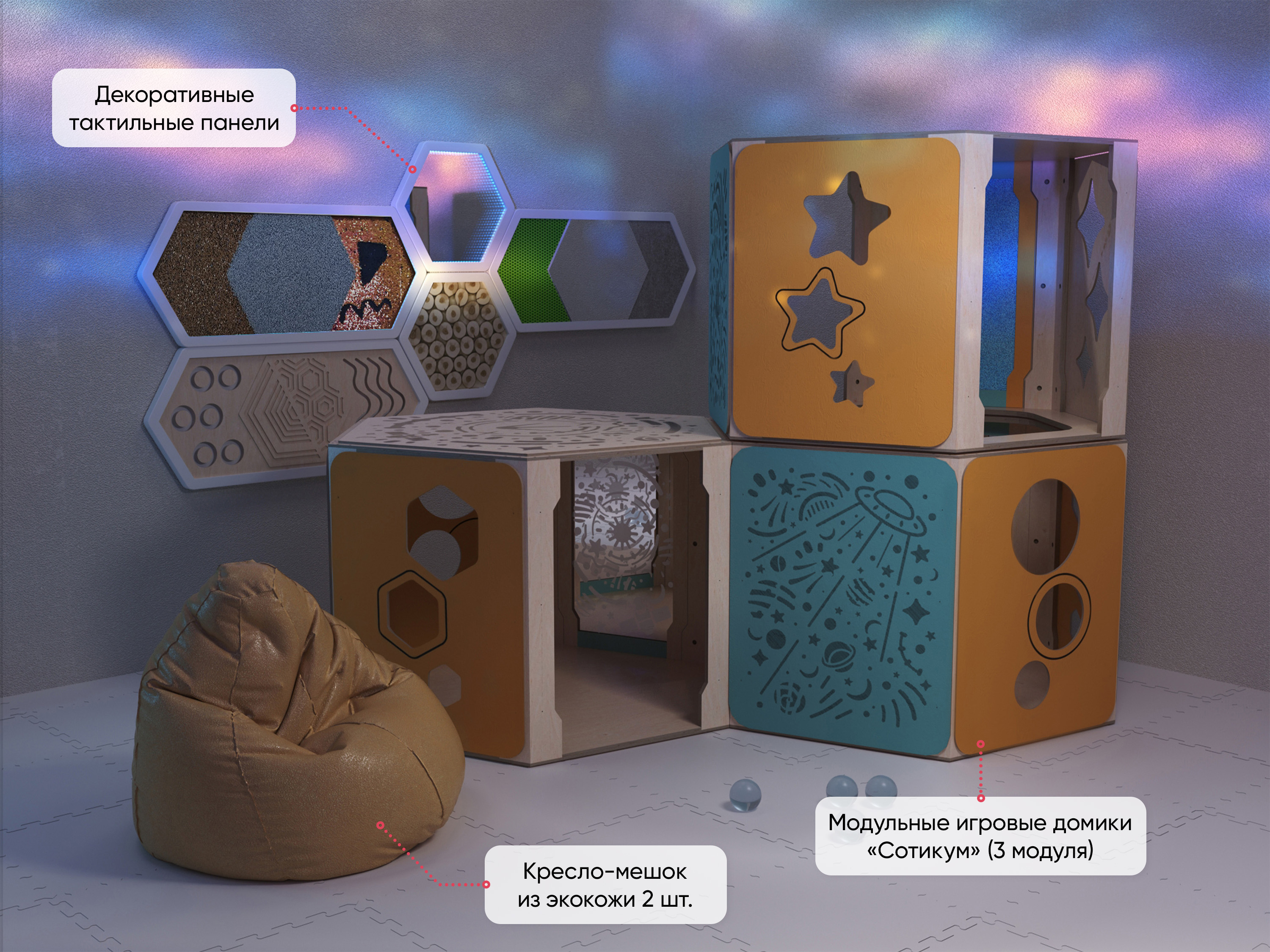 Модульные игровые домики «Сотикум» – трансформируемые игровые модули, в которых легко спрятаться и представить себя в уютном гнёздышке или укромной норке. Это важно для создания безопасного пространства для ребёнка, установления с ним доверительного контакта. Дополнительно домики оформлены развивающими тактильными панелями.