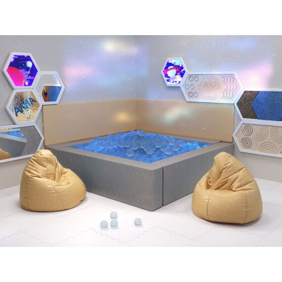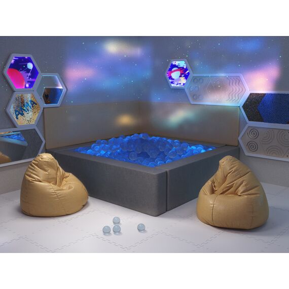 Сухой бассейн с шариками – это универсальное оснащение для сенсорной комнаты, в нём можно как играть и веселиться, так и расслабляться под тихую, спокойную музыку, чувствуя успокаивающее давление шариков на кожу. Подходит для активационной и релаксационной практики.