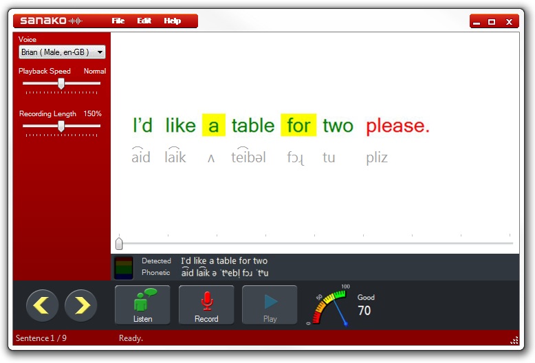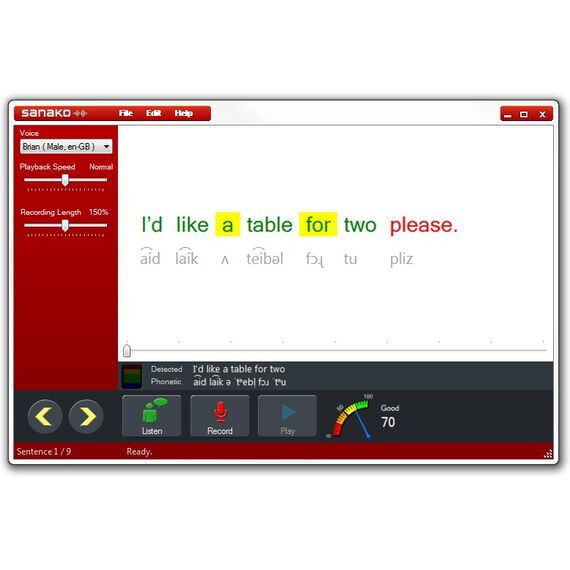 - Разработанный специально для совершенствования произношения, мультимедийный плеер Sanako Pronounce работает по технологии Text to Speech. В его функционал входит голосовая обработка текста и тренировка произношения. Читая текст отображенный в плеере, обучающийся может прослушать голосовой образец произношения текста и записать свое собственное произношение.