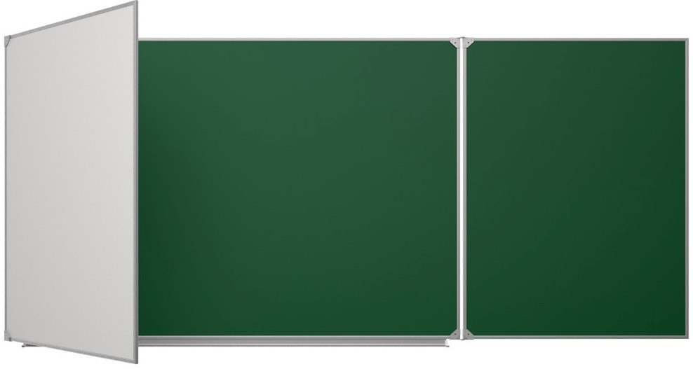Доска школьная настенная 3-хэлементная для письма мелом и маркером, 5 рабочих поверхностей. В качестве рабочих полотен используются только высокопрочные материалы, специально предназначенные для школьных досок.