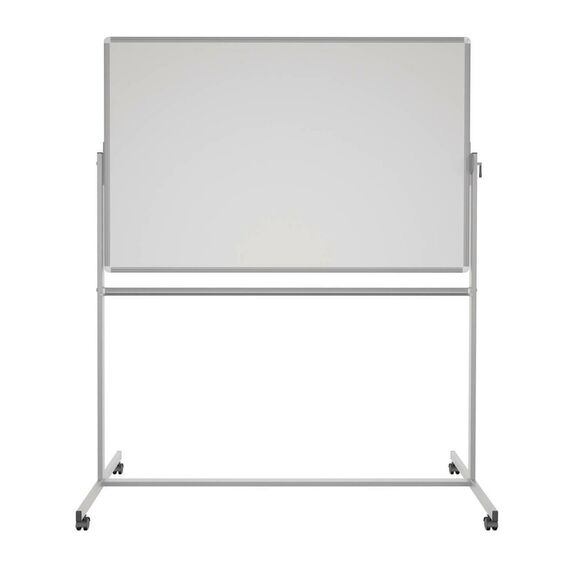 Передвижная поворотная доска установлена на металлической стойке, позволяющей ей поворачиваться вокруг горизонтальной оси. Две рабочие поверхности — из стального полимерного листа с антибликовым покрытие. Обрамление доски — высокопрочный алюминиевый профиль, благодаря чему имеет высокую износоустойчивость и прочность. Вы также можете размещать дополнительные наглядные материалы, плакаты и использовать доску в качестве экрана для проектора. Имеется лоток для мела/маркеров и принадлежностей.