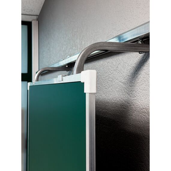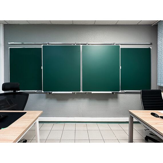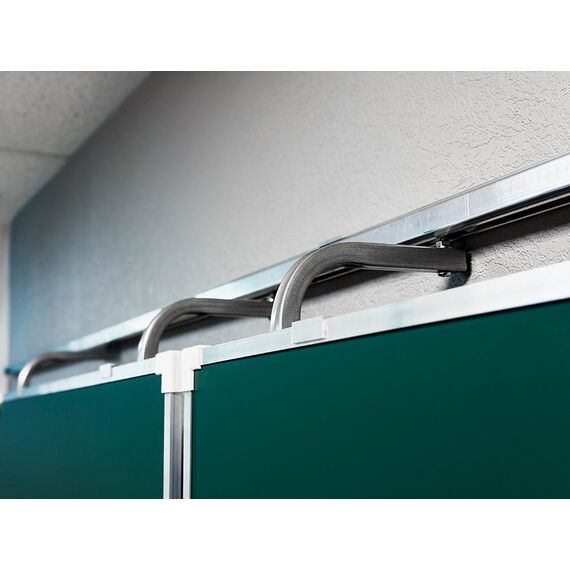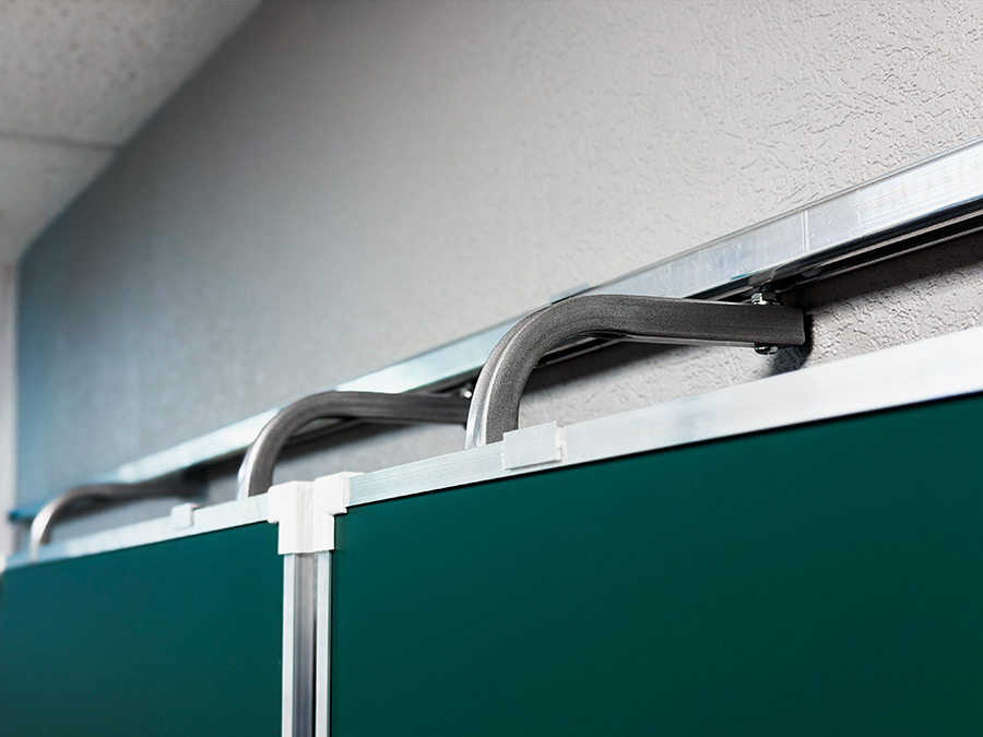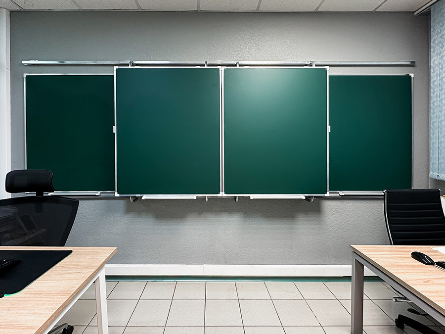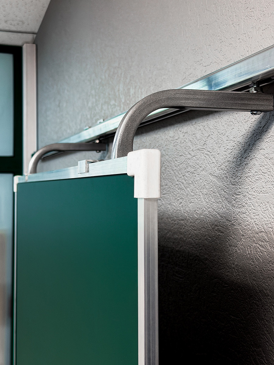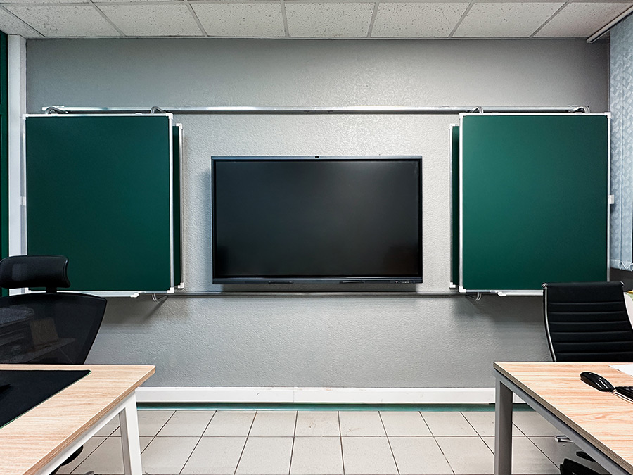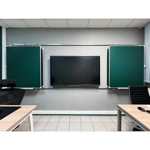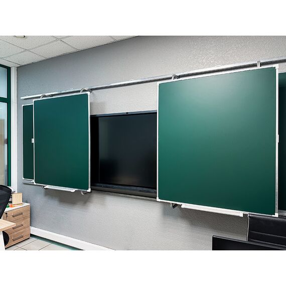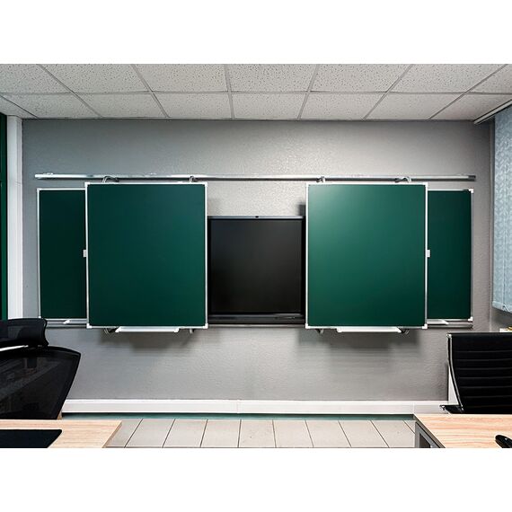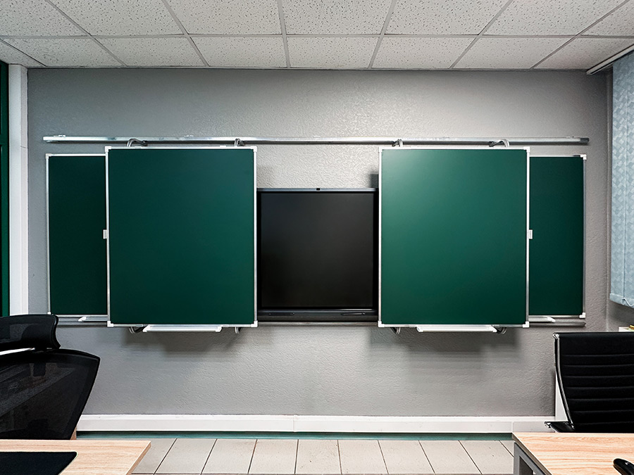 «Эврика» — это рельсовая система с несколькими подвижными и стационарными досками, позволяющая максимально задействовать фронтальную стену аудитории и комбинировать классические доски с интерактивным оборудованием.