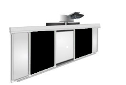Слева и справа от интерактивной доски стационарно в стену крепятся две аудиторные доски. Еще две аудиторные доски крепятся в направляющий верхний профиль через систему кареток и имеют свободный ход. При необходимости преподаватель может закрыть интерактивную доску сдвинув их к центру либо раздвинуть их и работать на интерактивной доске.