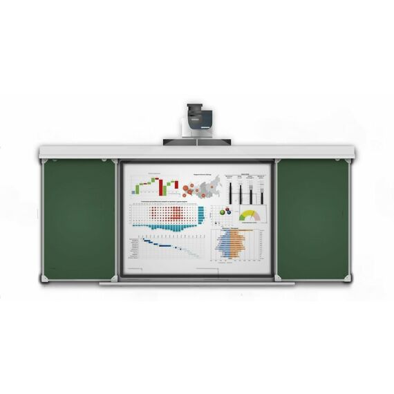 Функционально состоит из 4-х поверхностей для писания мелом, две из которых свободно перемещаются по рельсовой системе, закрывая интерактивную доску, встроенную в центр рельсовой системы.