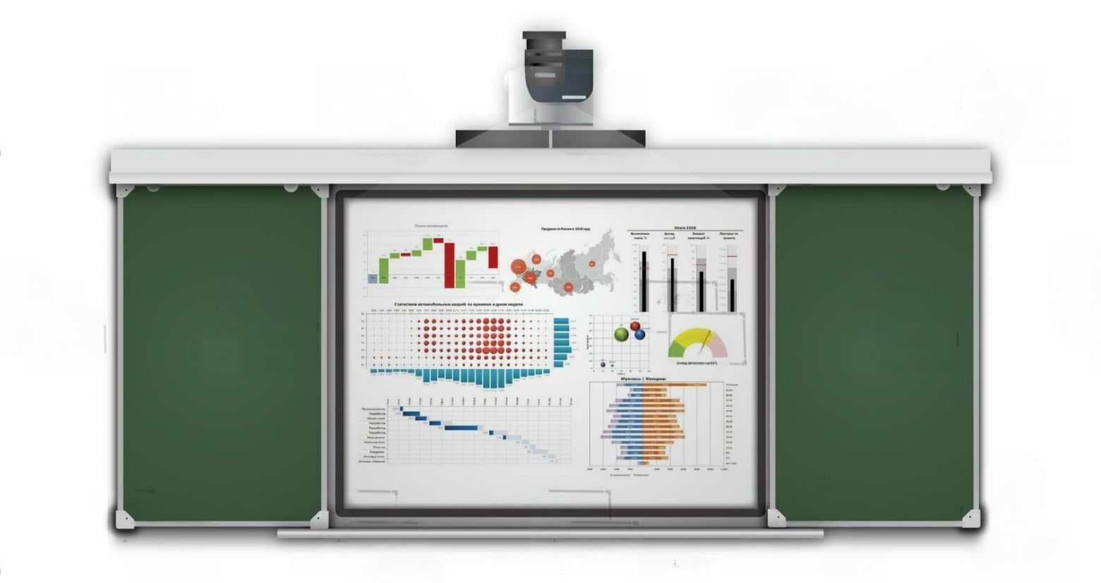 Функционально состоит из 4-х поверхностей для писания мелом, две из которых свободно перемещаются по рельсовой системе, закрывая интерактивную доску, встроенную в центр рельсовой системы.