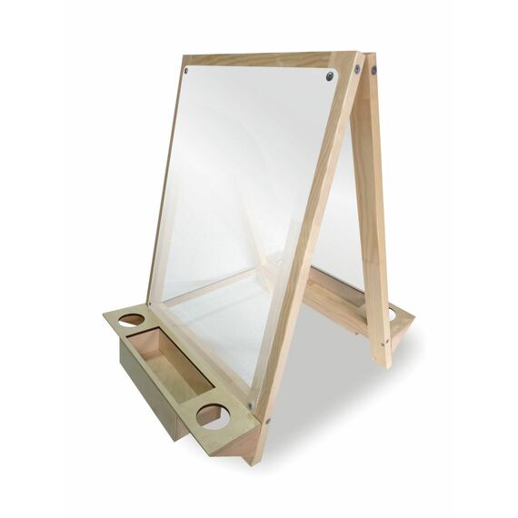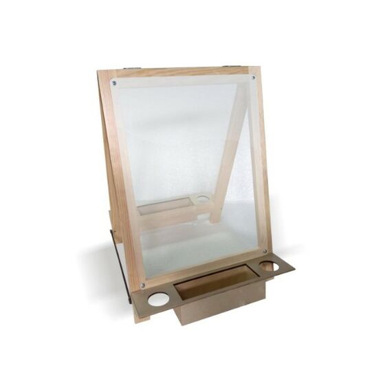 - Каркас изготовлен из высококачественной фанеры, что обеспечивает устойчивость конструкции. Мольберт рекомендуется использовать на столе.