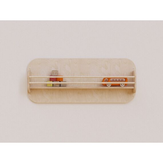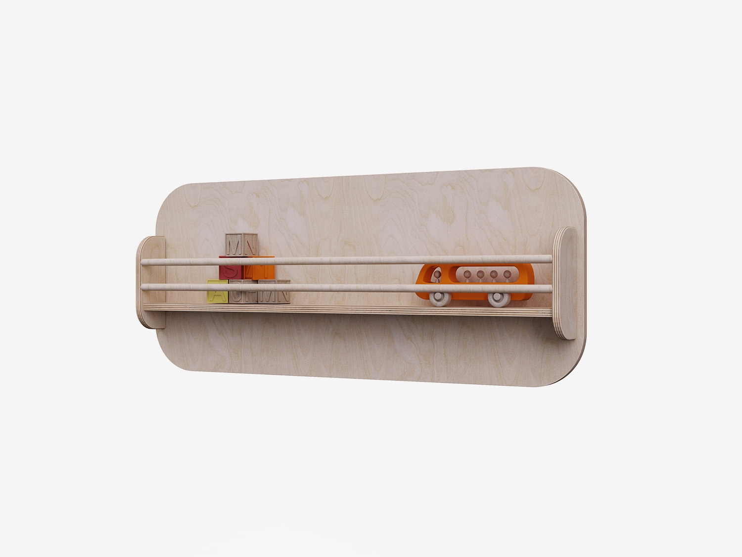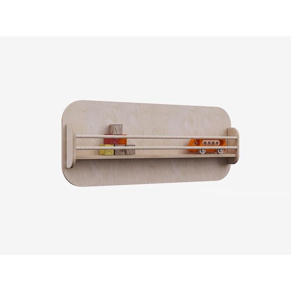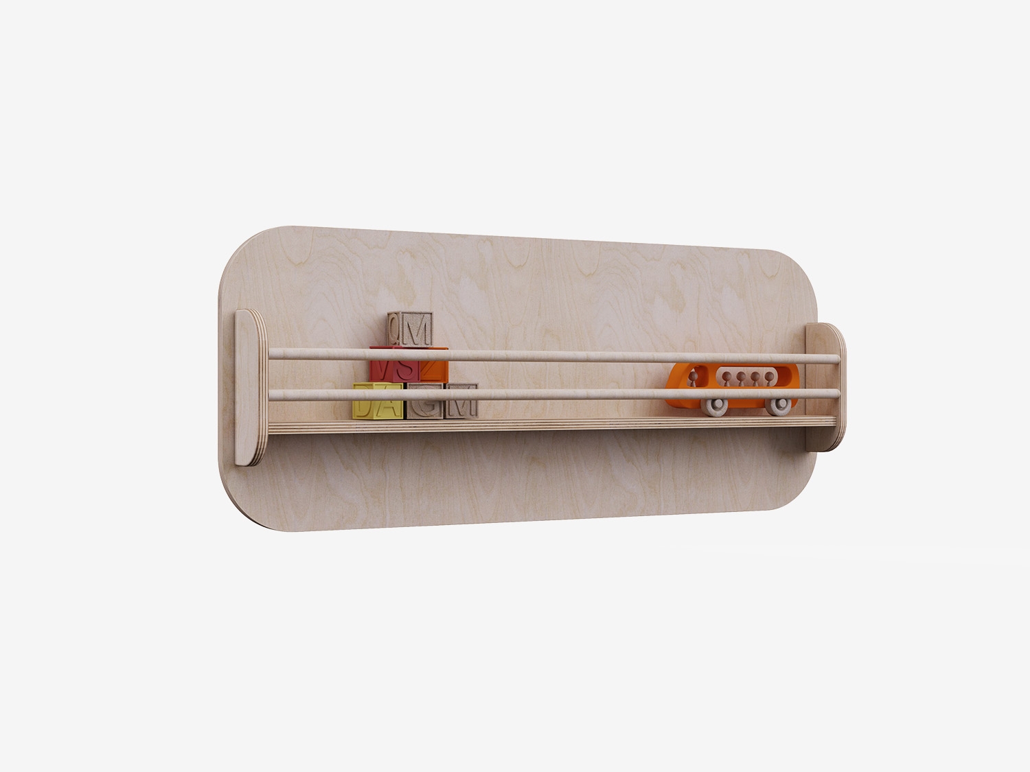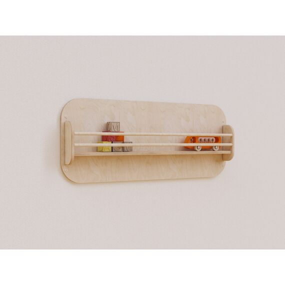 Полка для хранения дидактических, развивающих и рабочих материалов для демонстрации и обеспечения более простого и быстрого доступа. Горизонтальные перекладины препятствуют падению с полки элементов ее наполнения. Конструкция является не только практичным решением, но и стильным и экологичным украшением пространства.