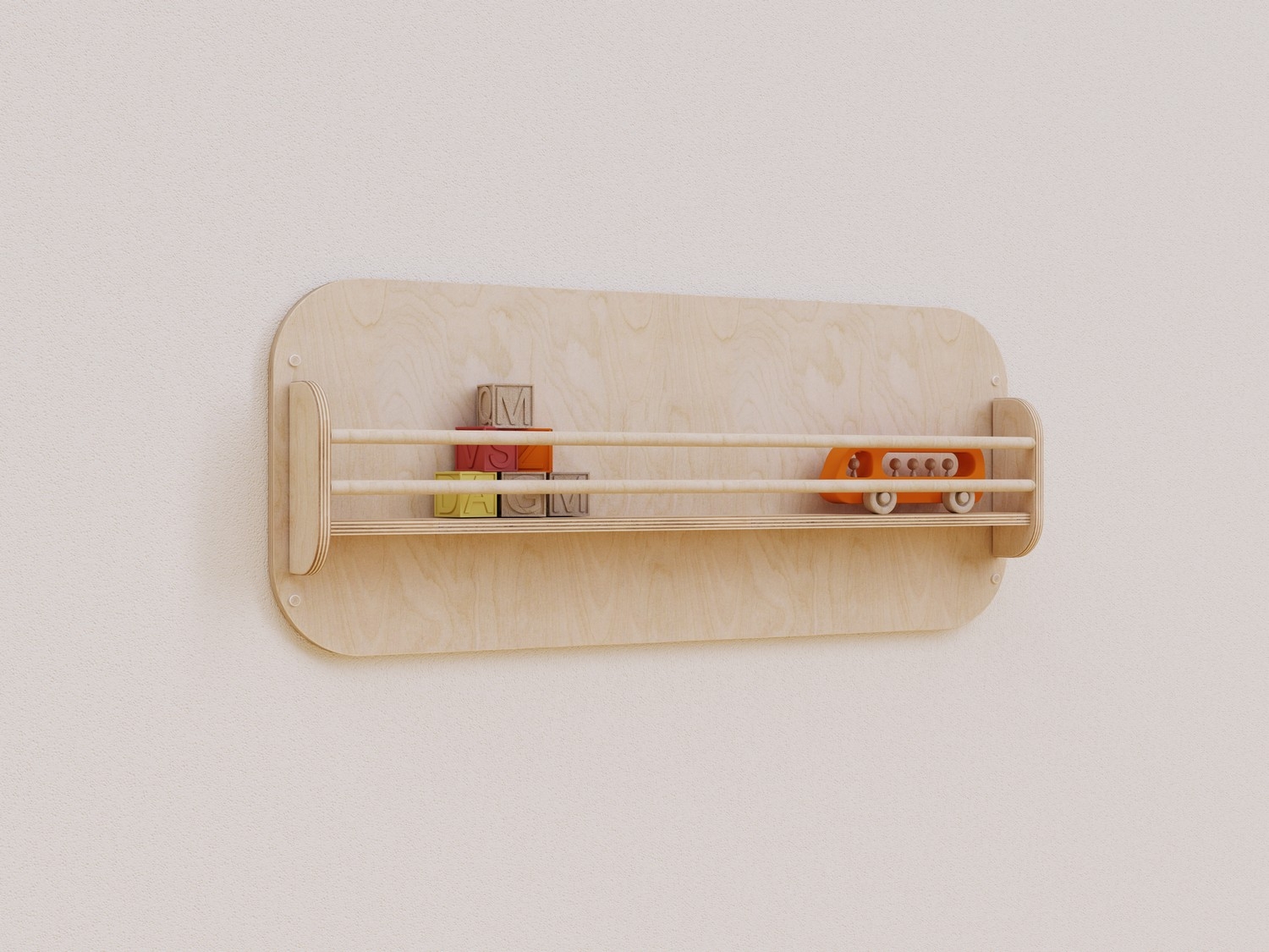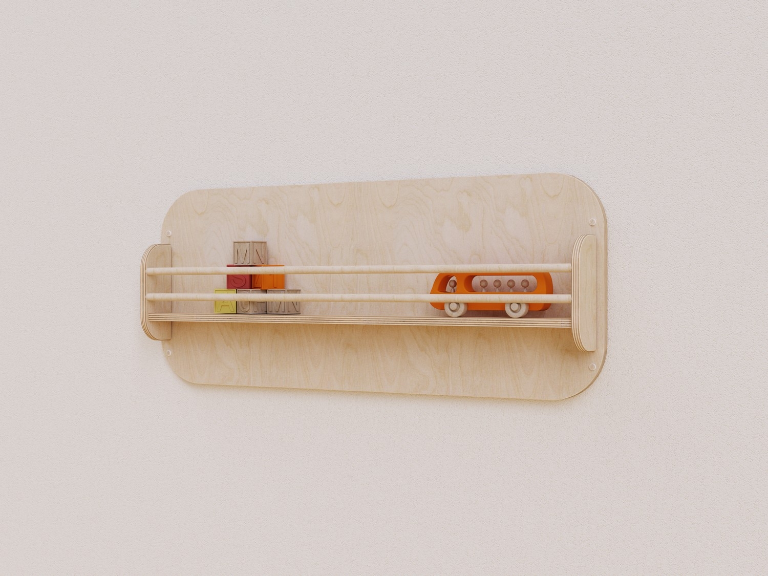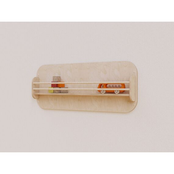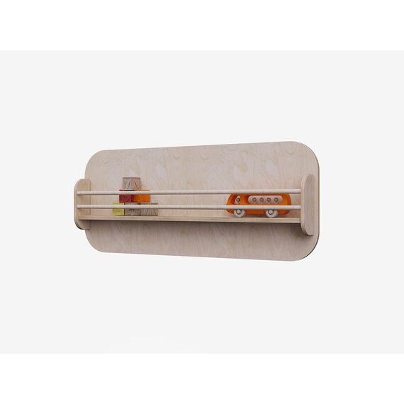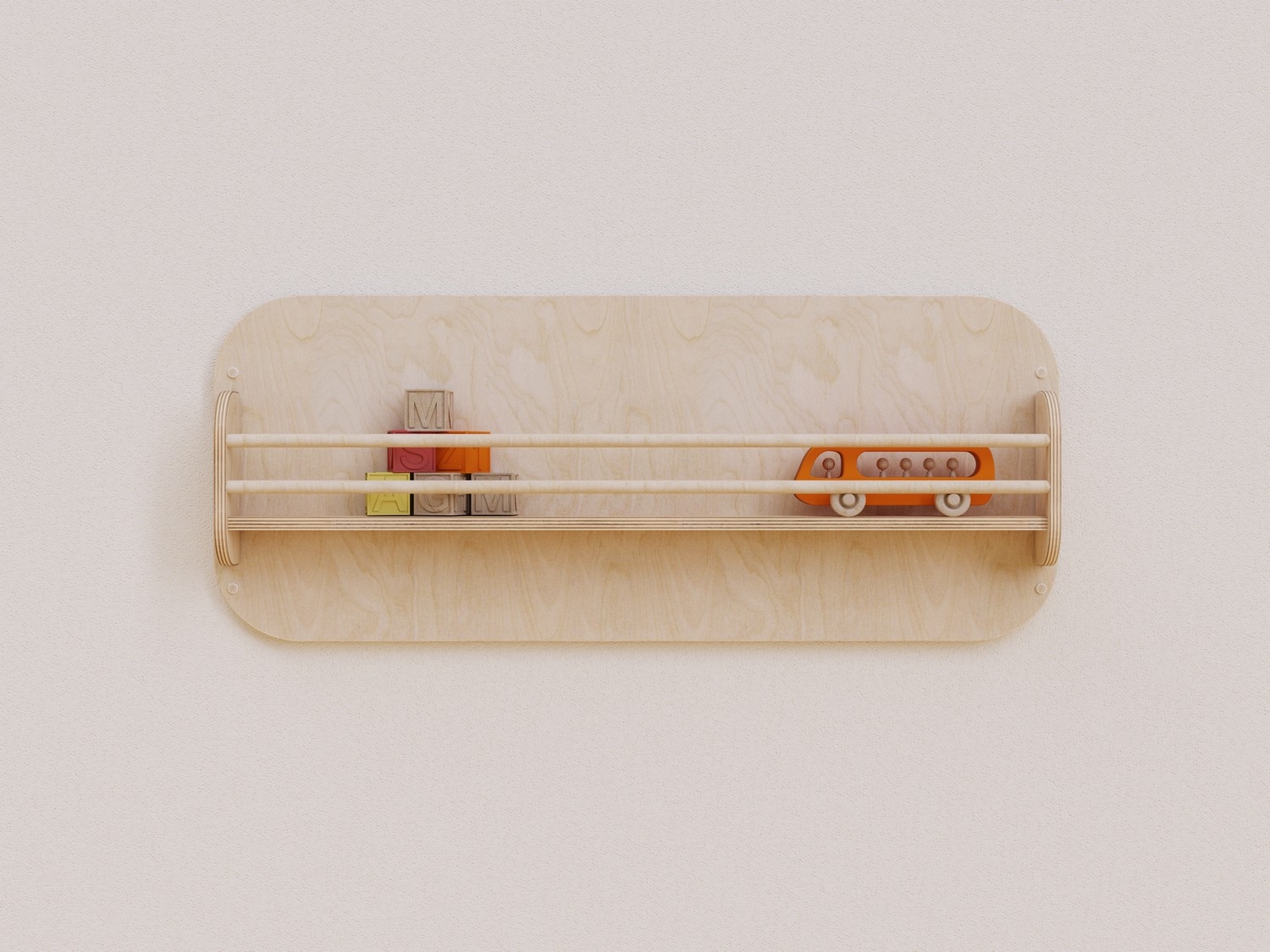 Полка для хранения дидактических, развивающих и рабочих материалов для демонстрации и обеспечения более простого и быстрого доступа. Горизонтальные перекладины препятствуют падению с полки элементов ее наполнения. Конструкция является не только практичным решением, но и стильным и экологичным украшением пространства.