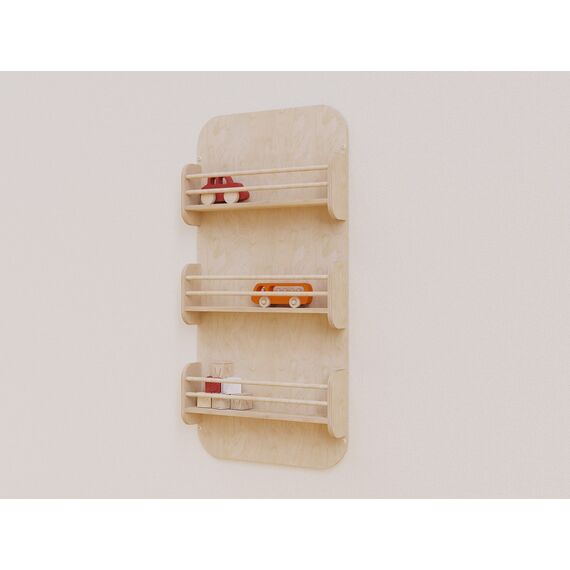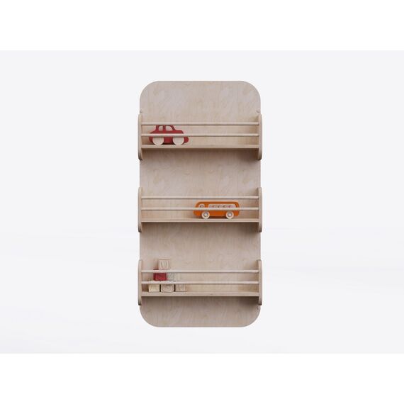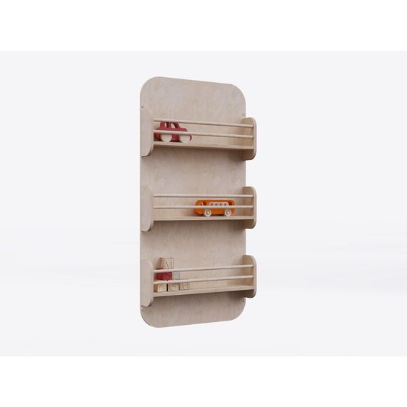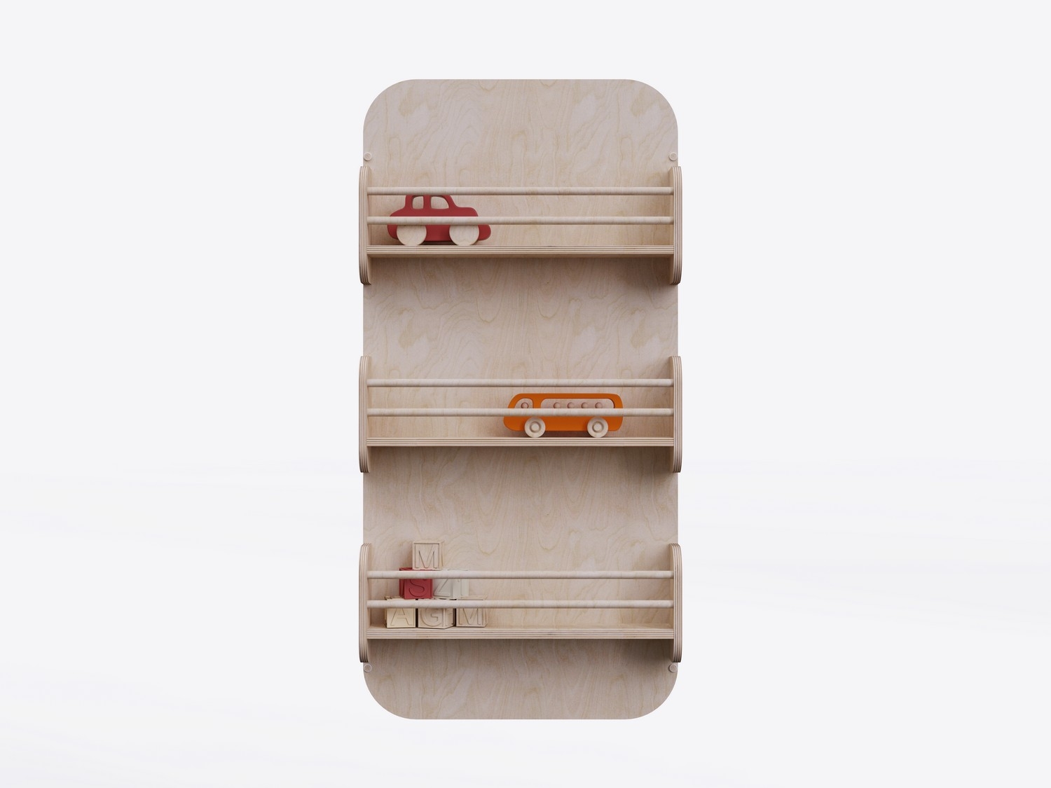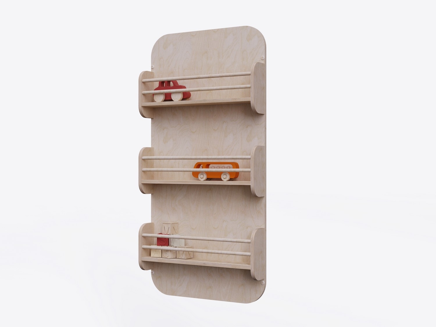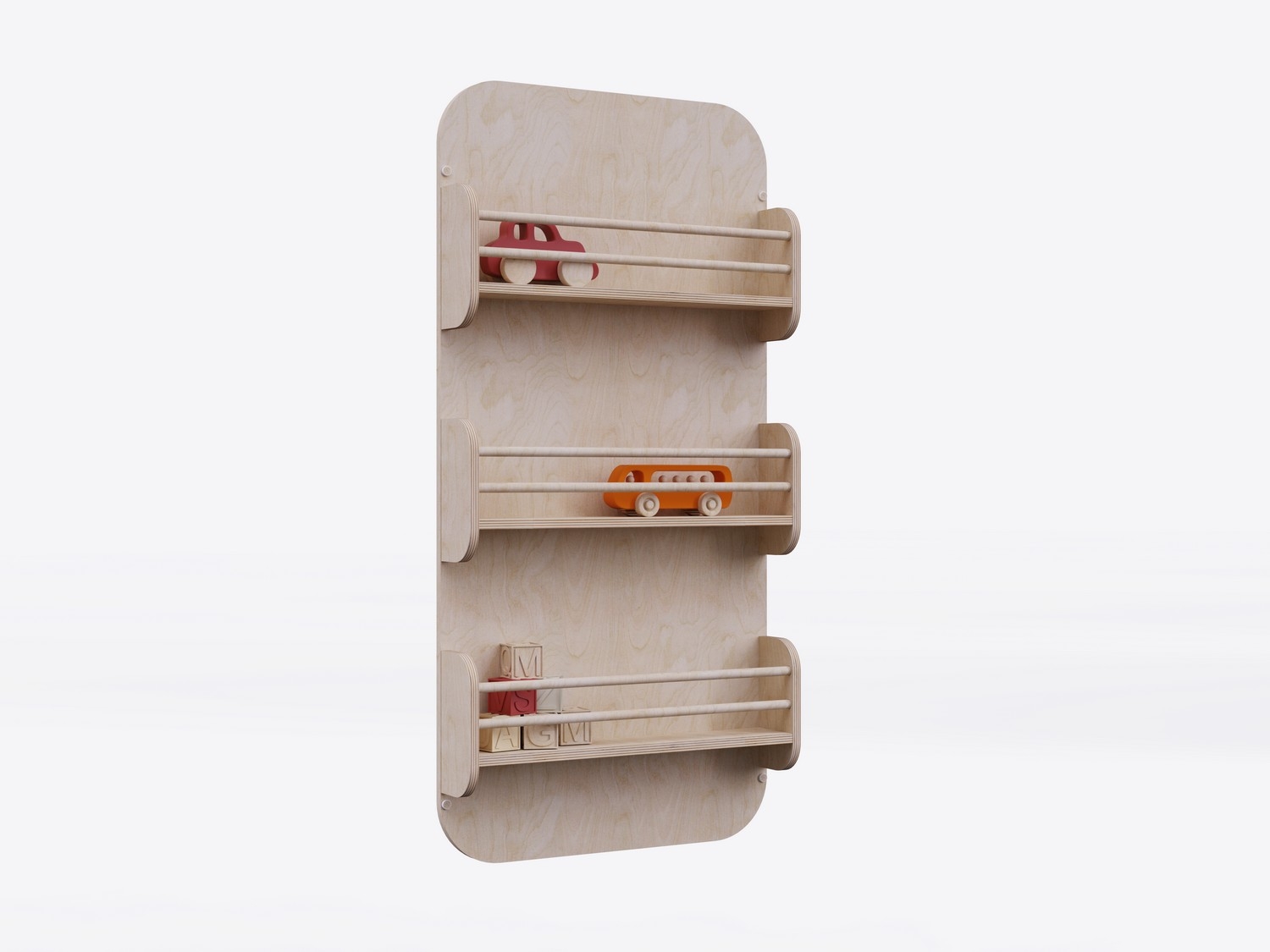 Полка для хранения дидактических, развивающих и рабочих материалов для демонстрации и обеспечения более простого и быстрого доступа. Горизонтальные перекладины препятствуют падению с полки элементов ее наполнения. Конструкция является не только практичным решением, но и стильным и экологичным украшением пространства.