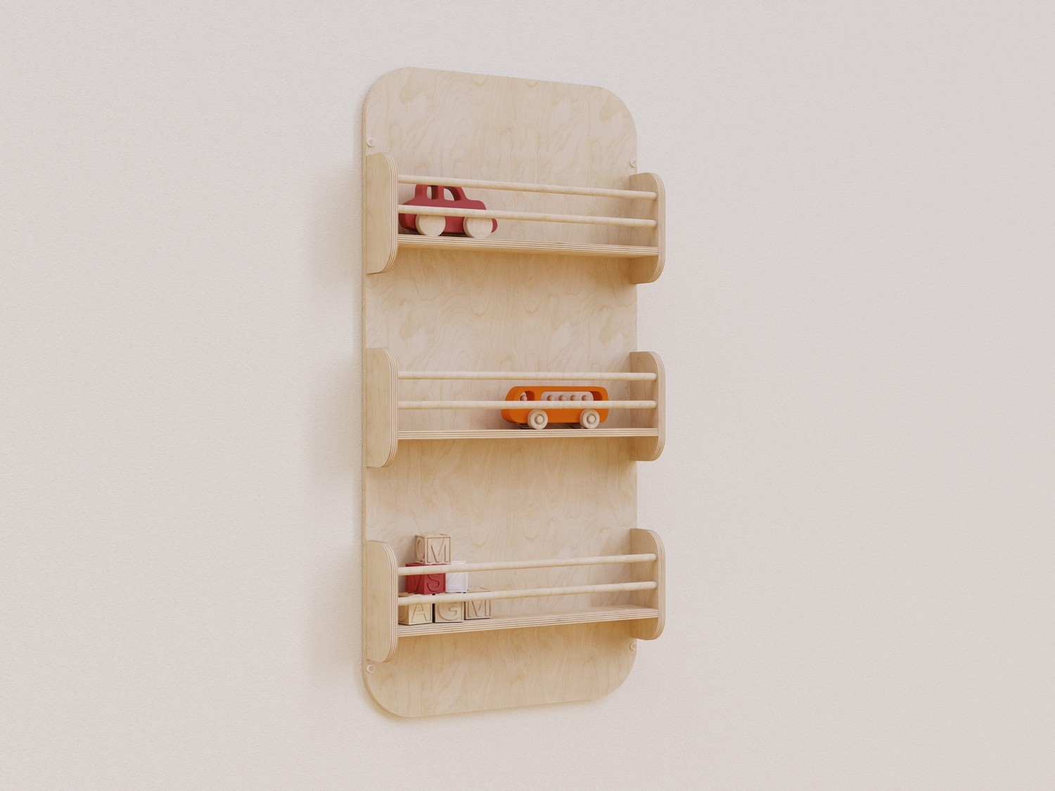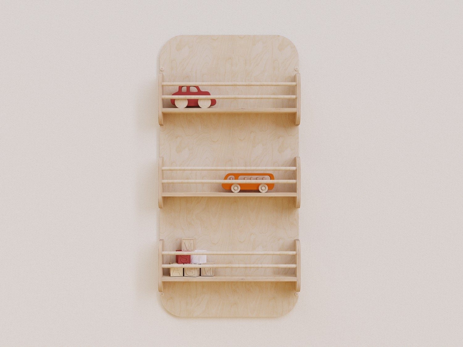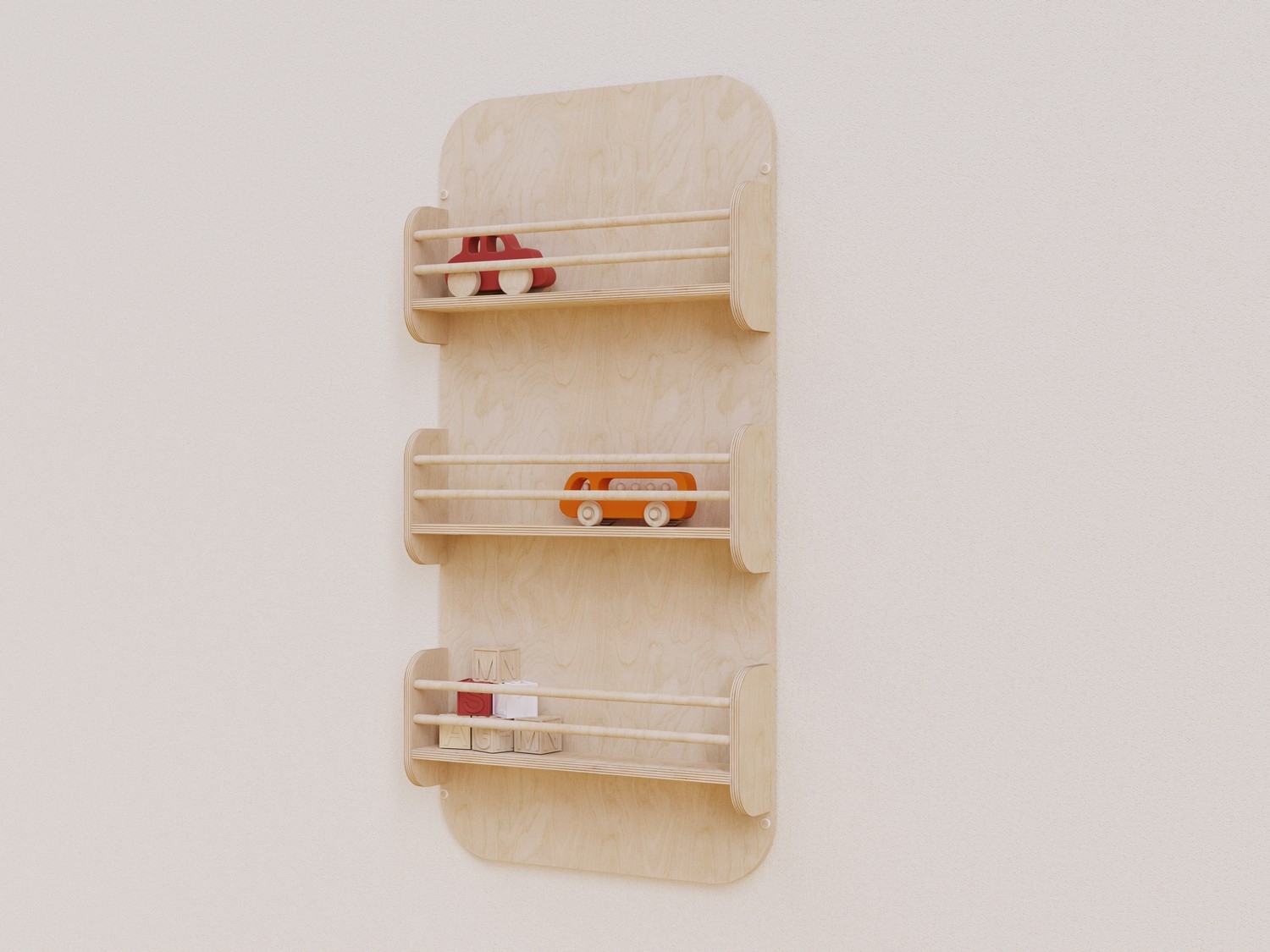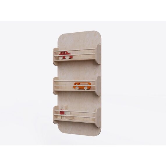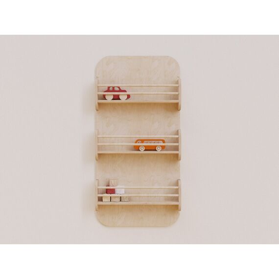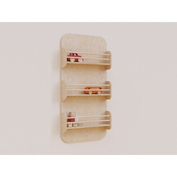 Полка для хранения дидактических, развивающих и рабочих материалов для демонстрации и обеспечения более простого и быстрого доступа. Горизонтальные перекладины препятствуют падению с полки элементов ее наполнения. Конструкция является не только практичным решением, но и стильным и экологичным украшением пространства.