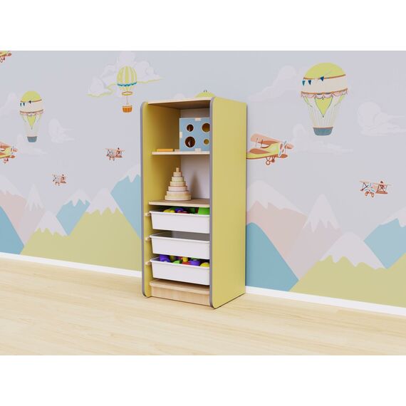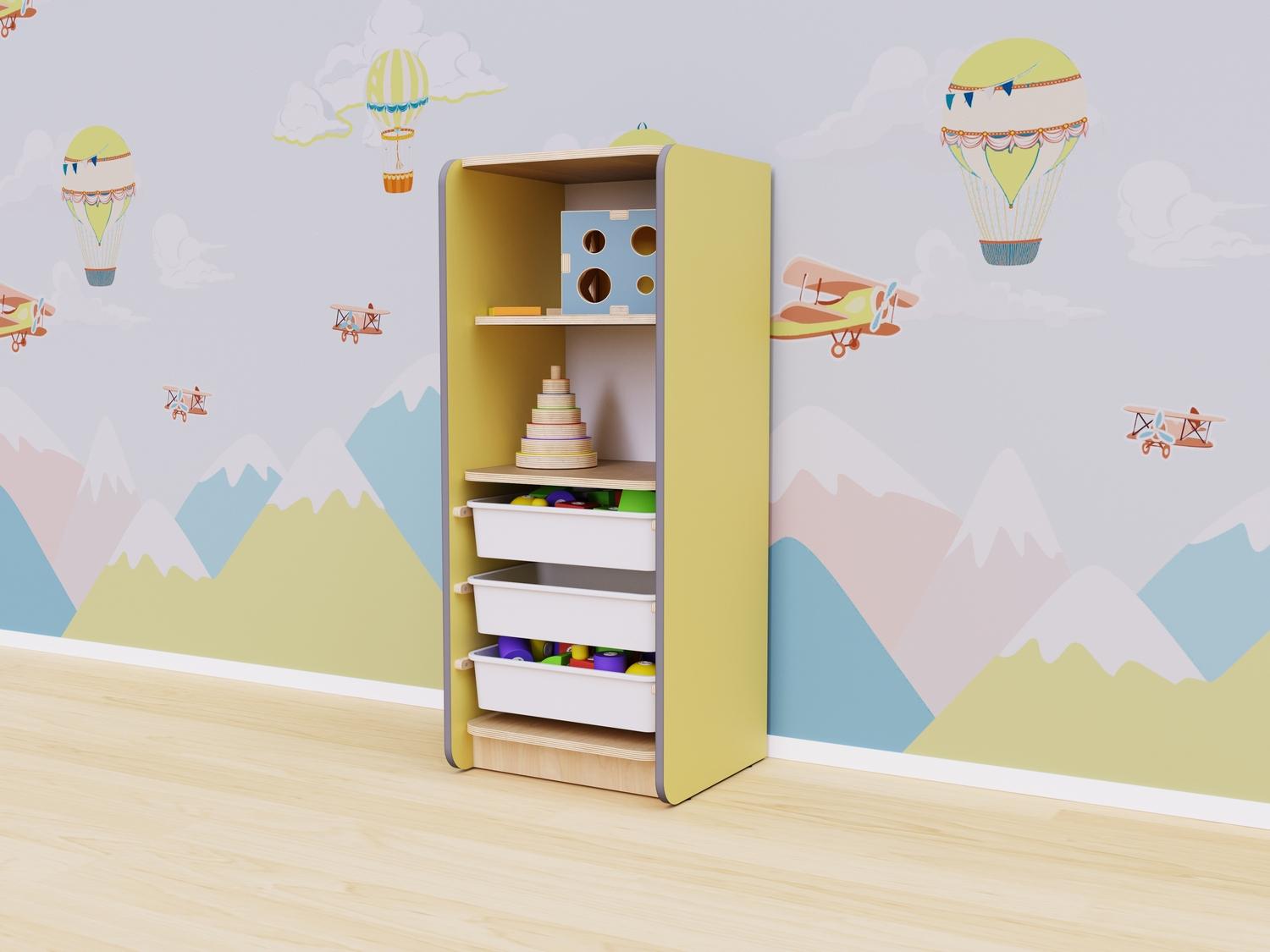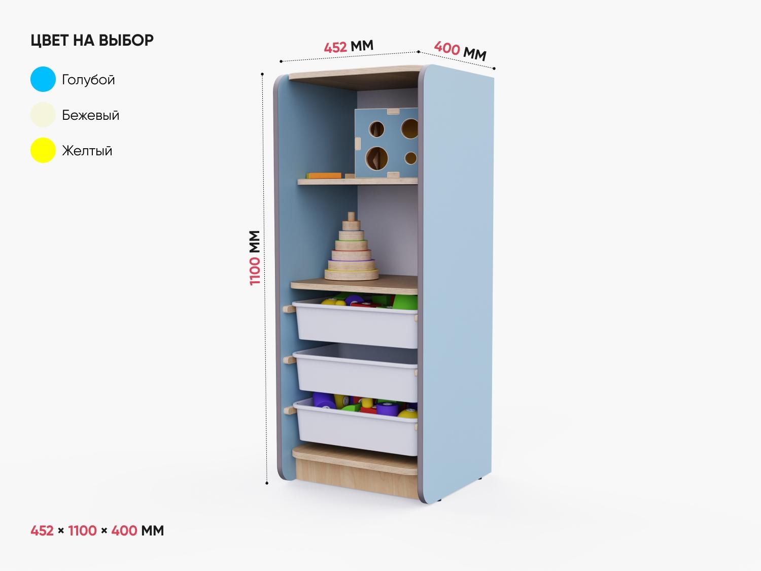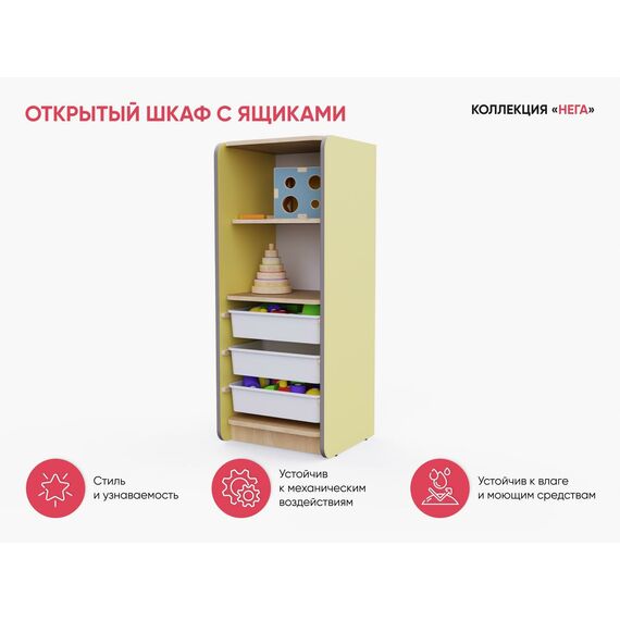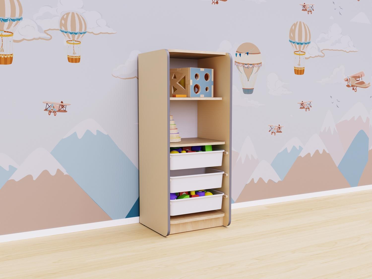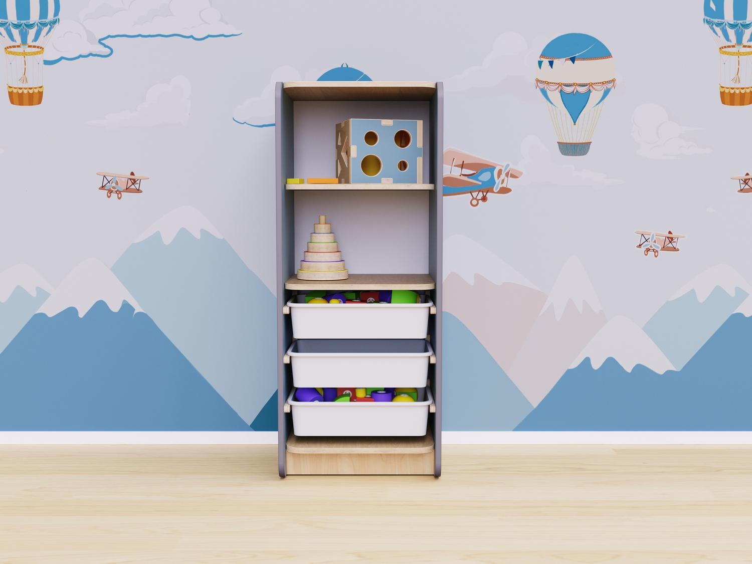 Открытый шкаф с двумя полками и тремя пластиковыми ящиками для оснащения игровых комнат в детских садах и организациях дополнительного образования. Этот открытый шкаф удобен и функционален, с ним легко создать систематизированное хранение и атмосферу порядка в ДОУ.