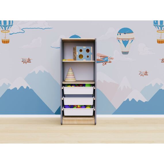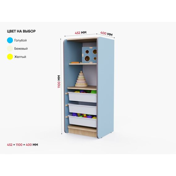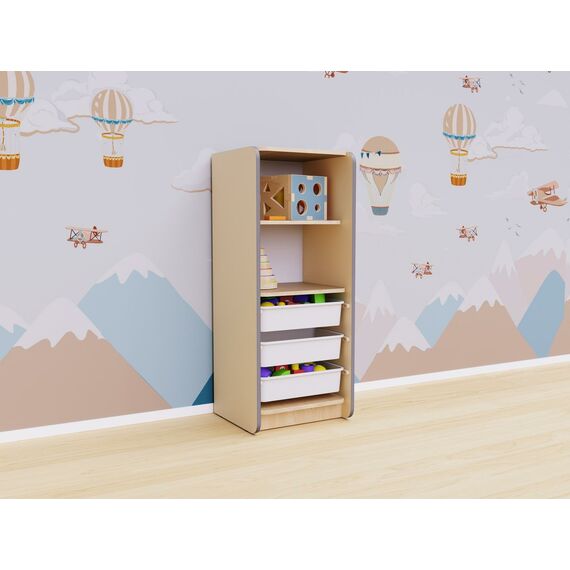 Шкаф изготовлен из берёзовой фанеры и ламинированной плиты со скруглёнными краями, что гарантирует безопасность и комфорт детей при использовании. Три пластиковых контейнера легко вынимаются для быстрой и качественной дезинфекции, обеспечивая гигиеничность и чистоту в игровой зоне.