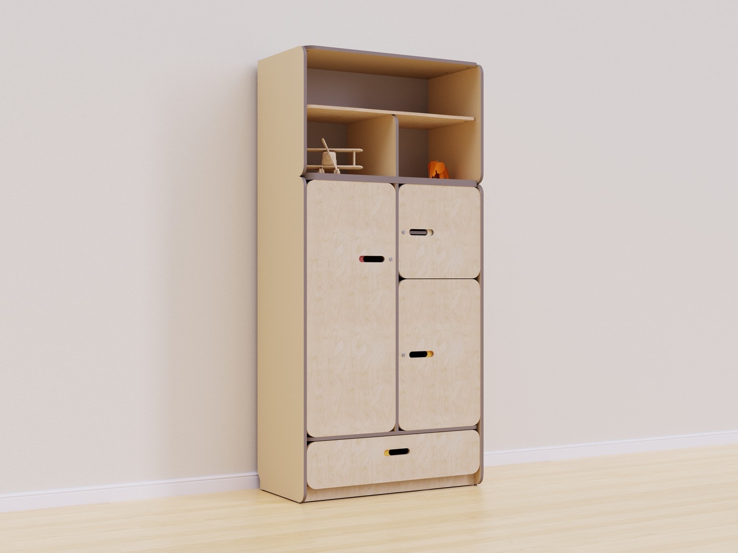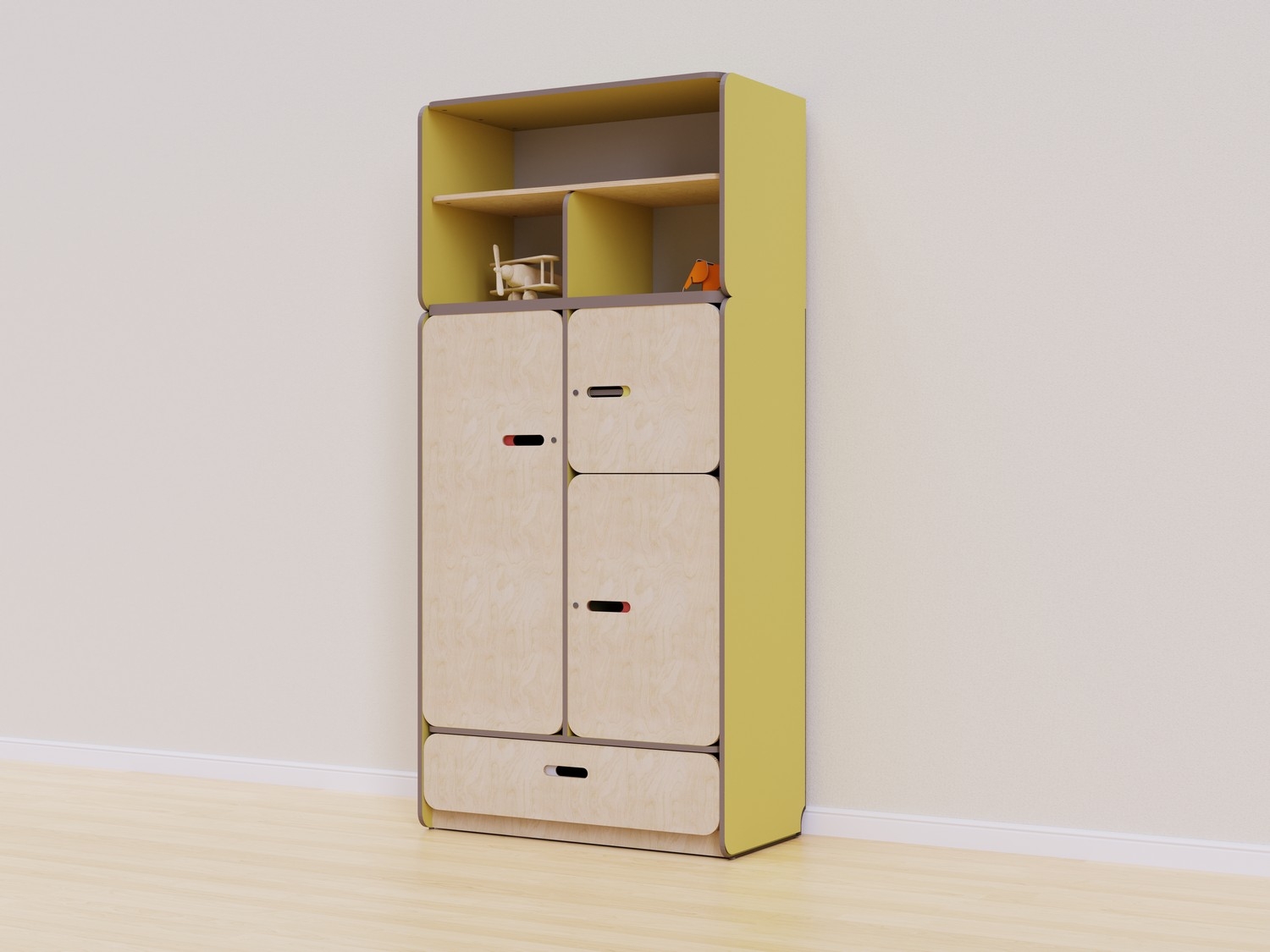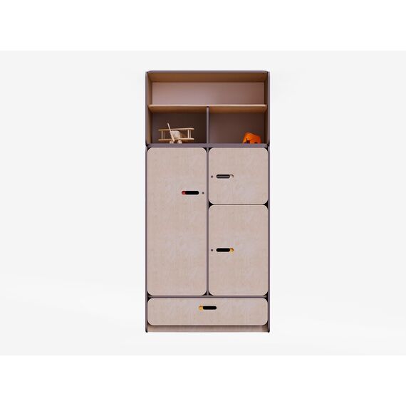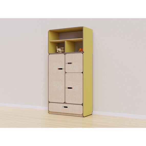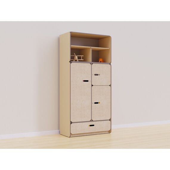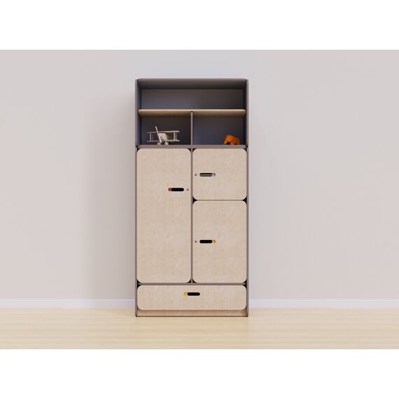 Конструкция стеллажа разработана с учетом всех стандартов безопасности. Встроенные шкафы с дверцами обеспечивают безопасное хранение мелких предметов и игрушек, предотвращая доступ к ним детей без присмотра взрослых. Три средних секции закрываются на замок для удобного размещения рабочих материалов, аптечки и других вещей, которые необходимо спрятать от детей.
