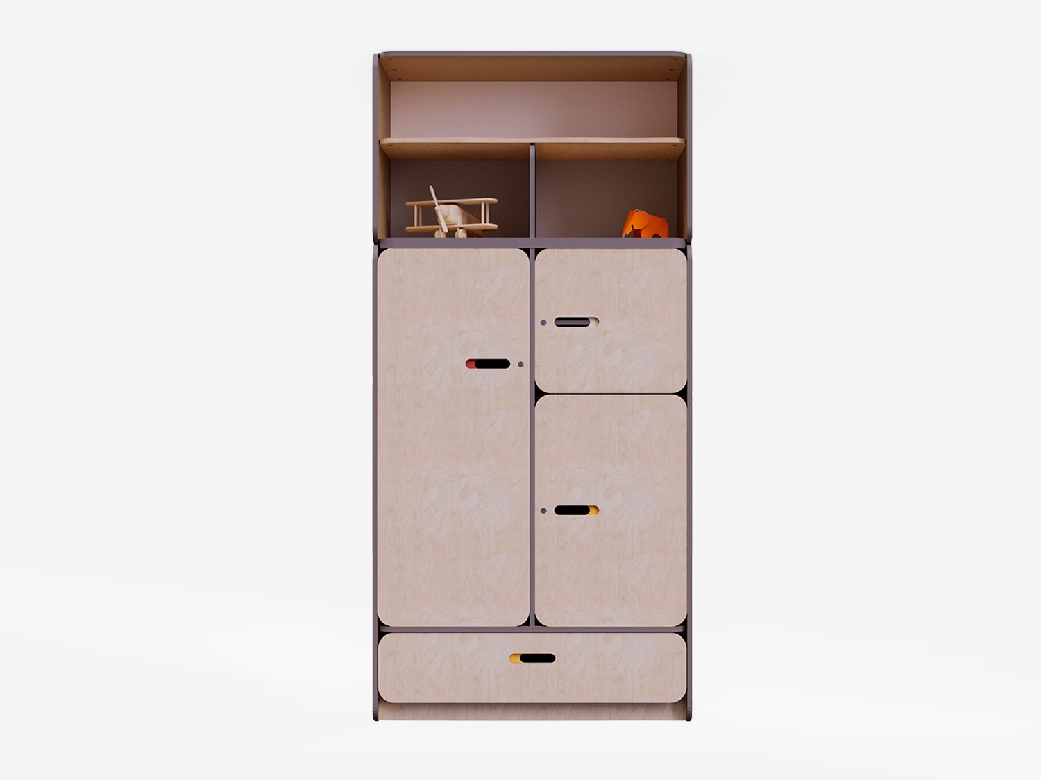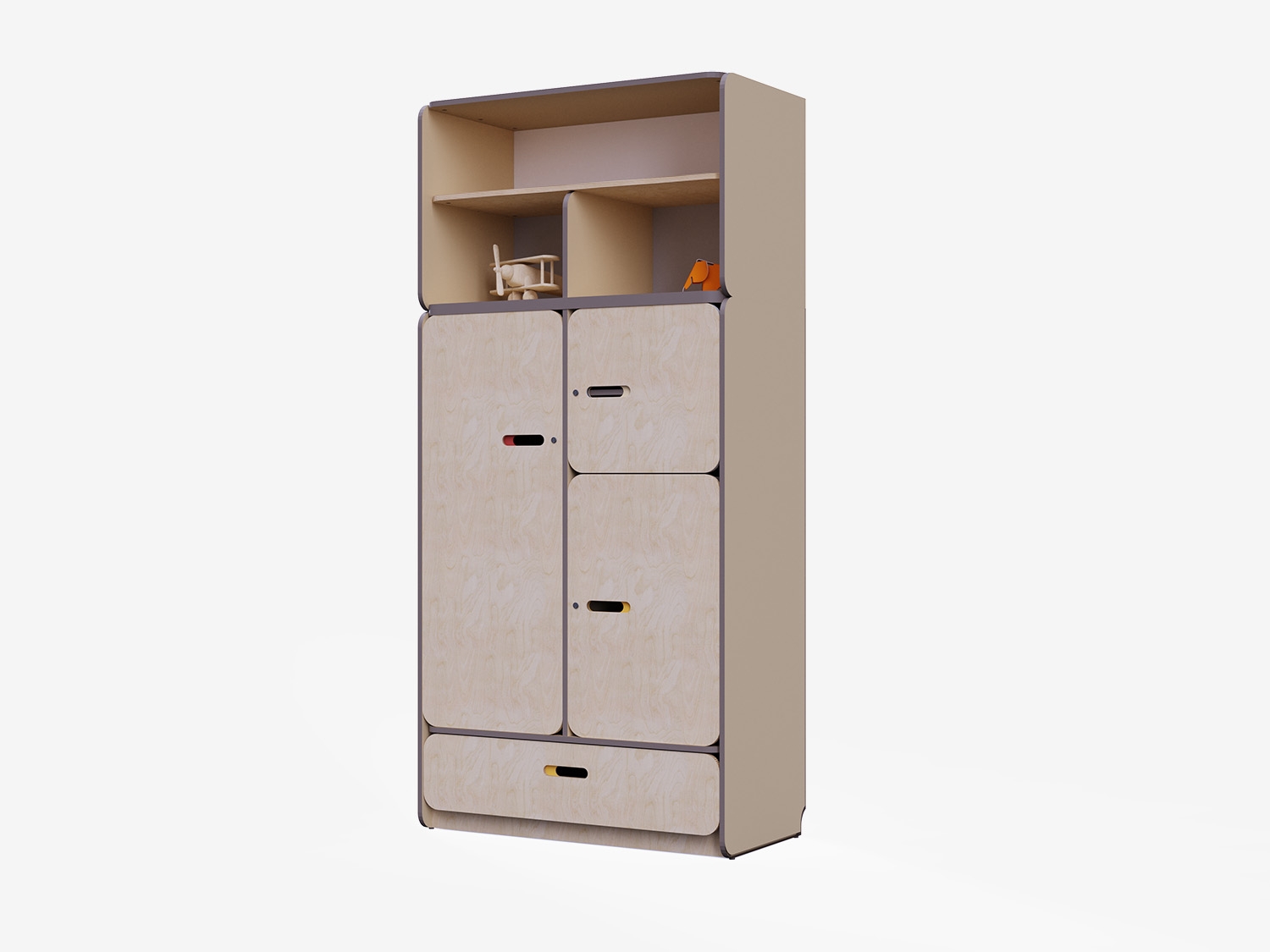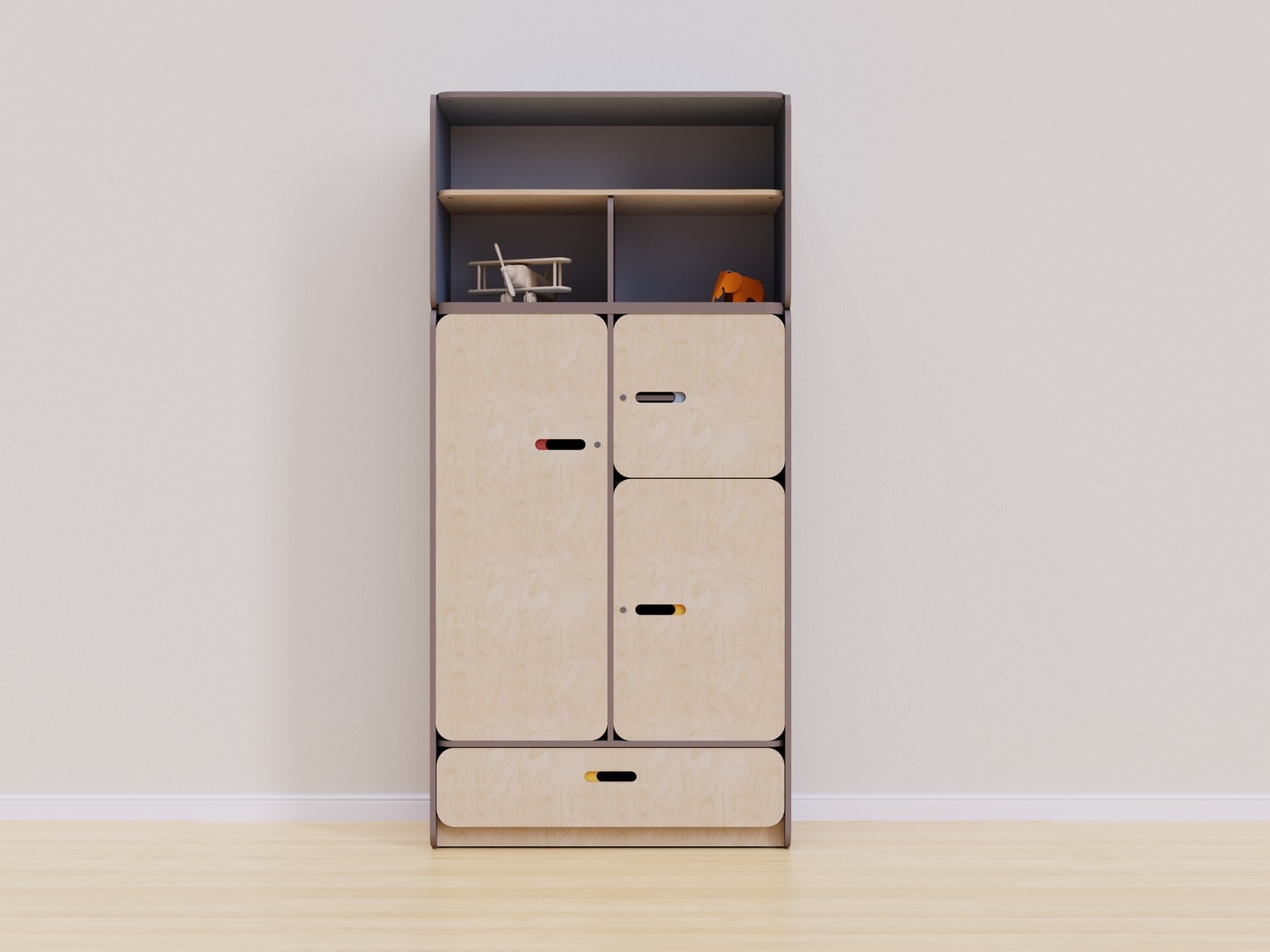 Конструкция стеллажа разработана с учетом всех стандартов безопасности. Встроенные шкафы с дверцами обеспечивают безопасное хранение мелких предметов и игрушек, предотвращая доступ к ним детей без присмотра взрослых. Три средних секции закрываются на замок для удобного размещения рабочих материалов, аптечки и других вещей, которые необходимо спрятать от детей.