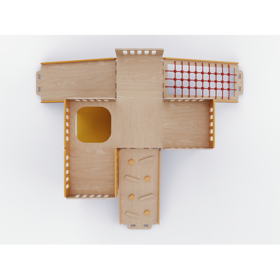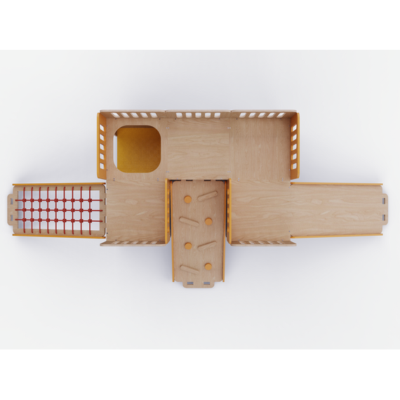 Комплекс спроектирован по типу конструктора, что позволяет менять расположение элементов и добавлять другие при необходимости. Защитный барьер можно поставить в удобное место, чтобы уберечь детей от возможного падения с комплекса.