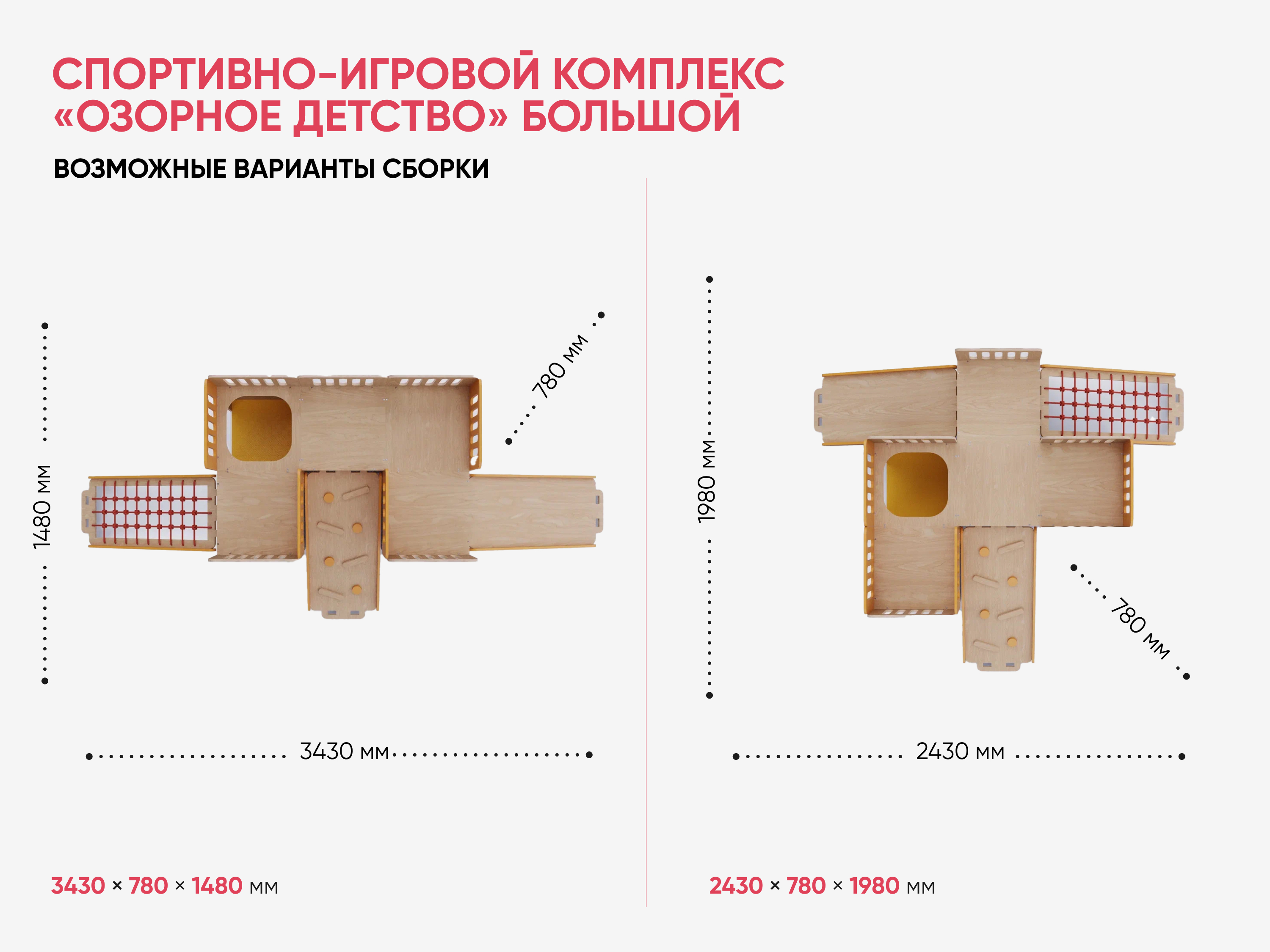 Габариты (ширина и глубина) игрового комплекса будут меняться в зависимости от ваших вариантов сборки. Высота комплекса всегда будет равна 780 мм.