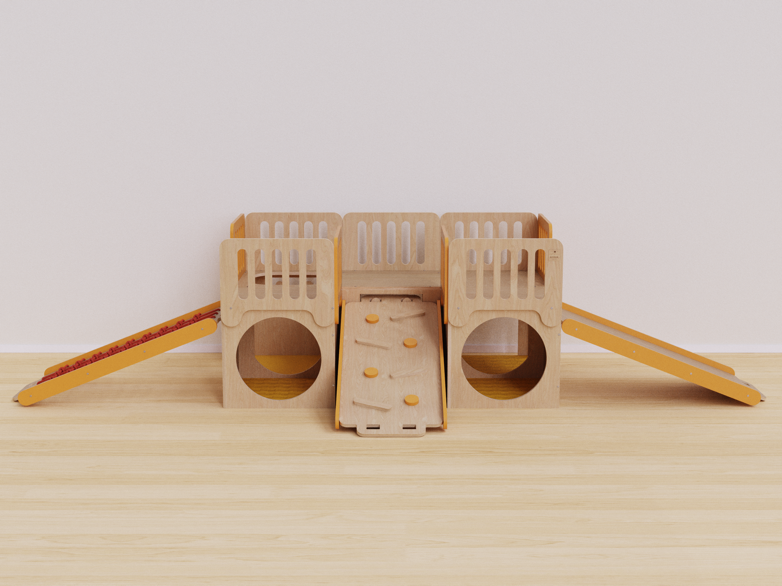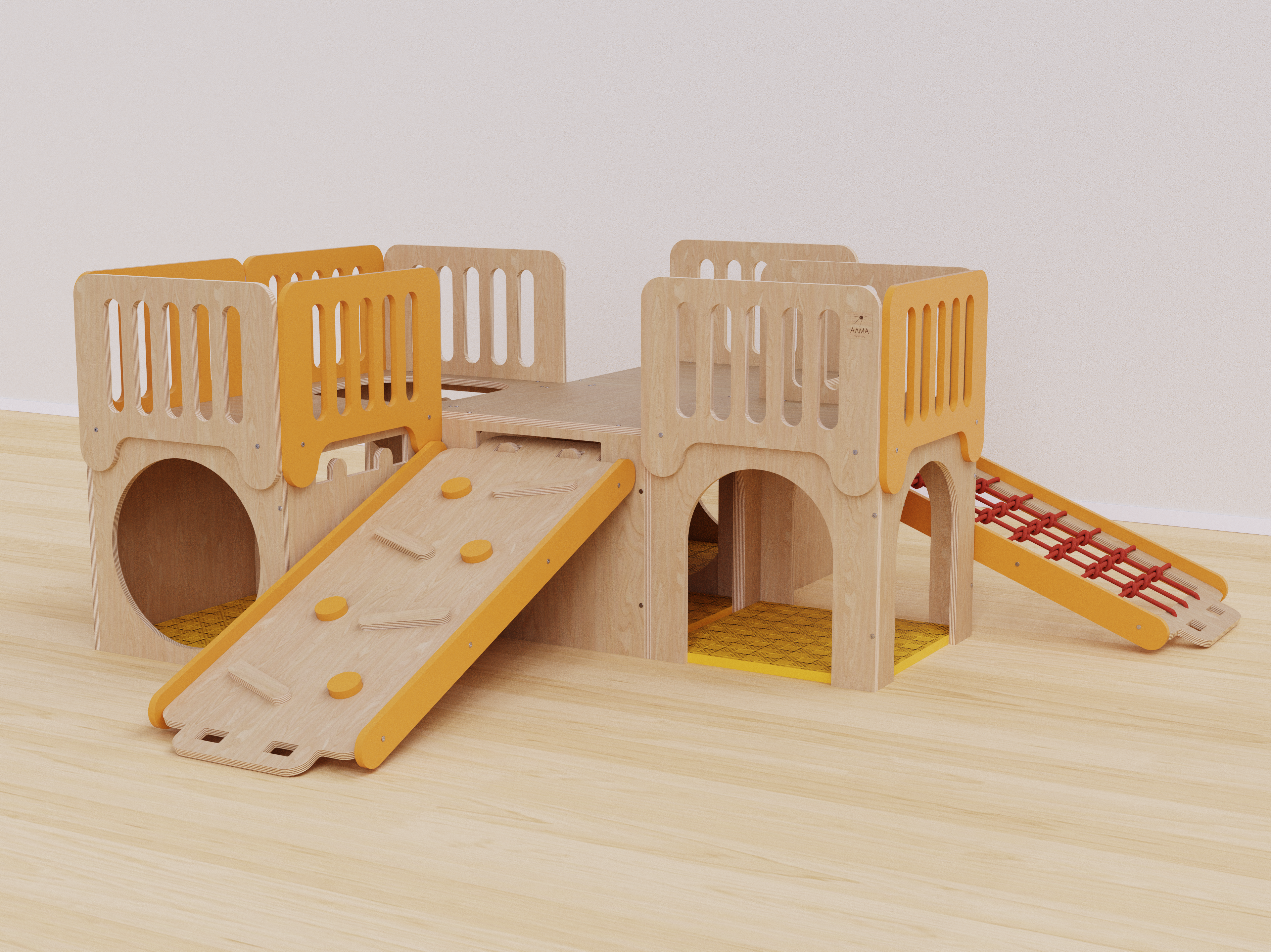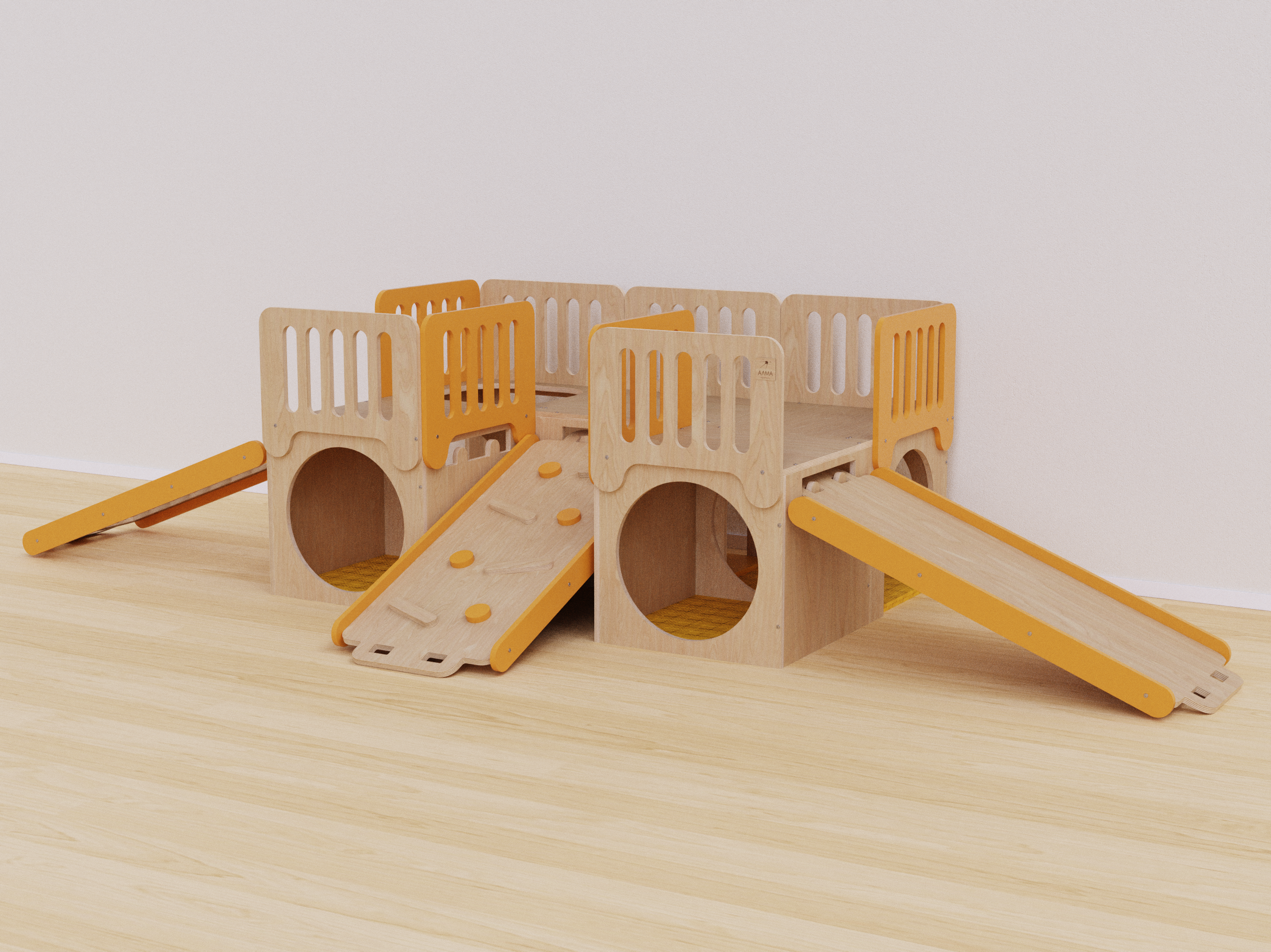 Каждый элемент конструкции соответствует актуальным ГОСТам на детскую мебель, требованиям СанПиНа и пожарной безопасности, рекомендациям ФОП ДО по созданию развивающей среды для детей раннего возраста. Гладкие поверхности просты в уходе: достаточно влажной уборки для поддержания высокого уровня гигиены. Универсальный дизайн позволяет установить комплекс в любое пространство.