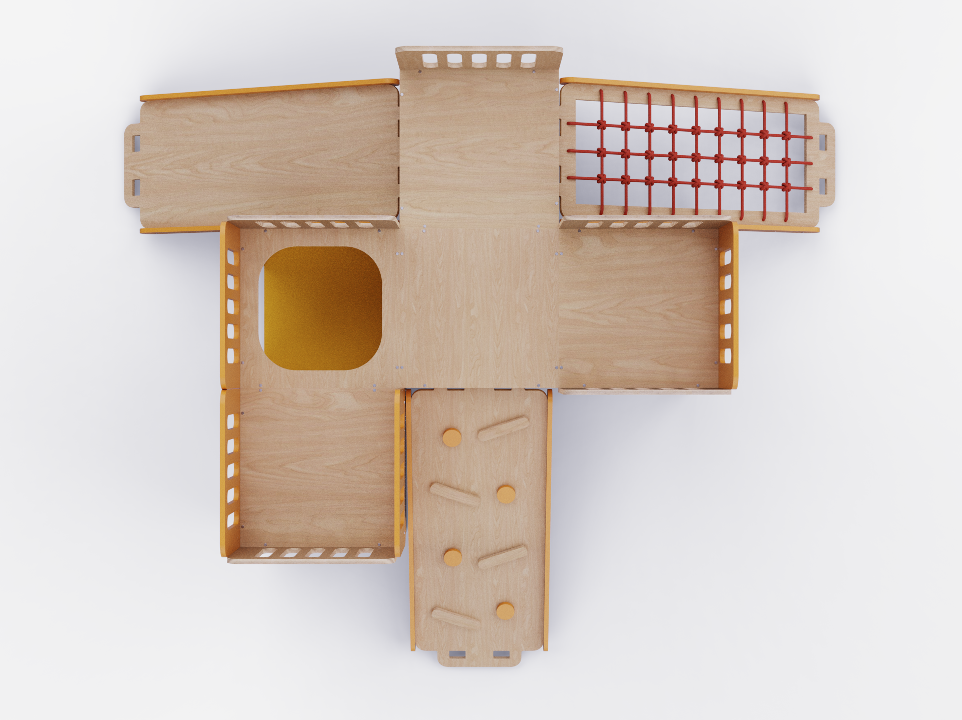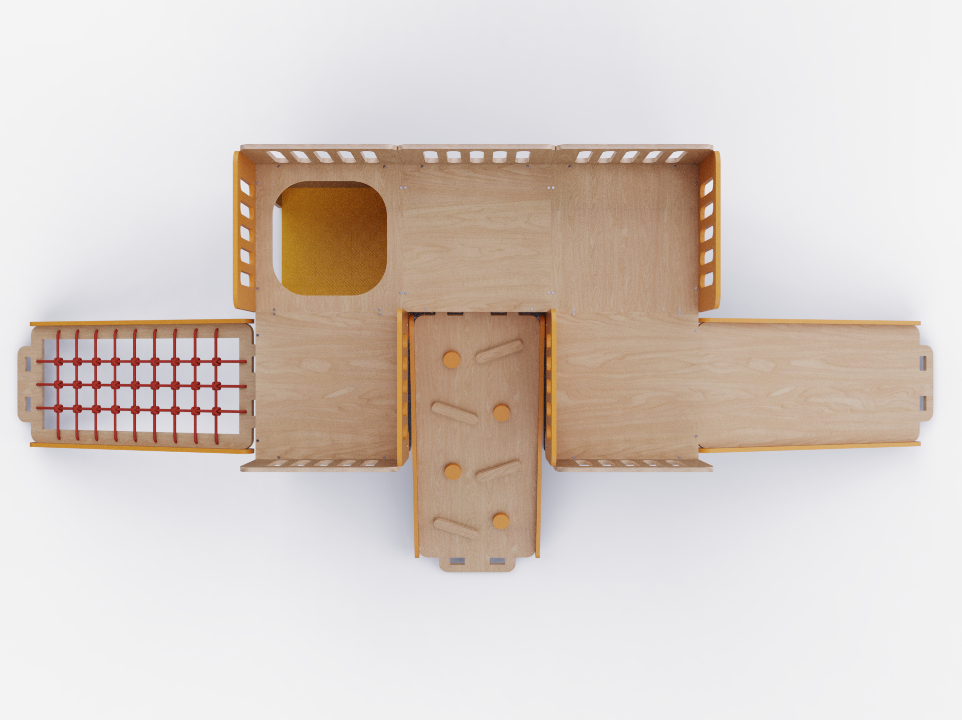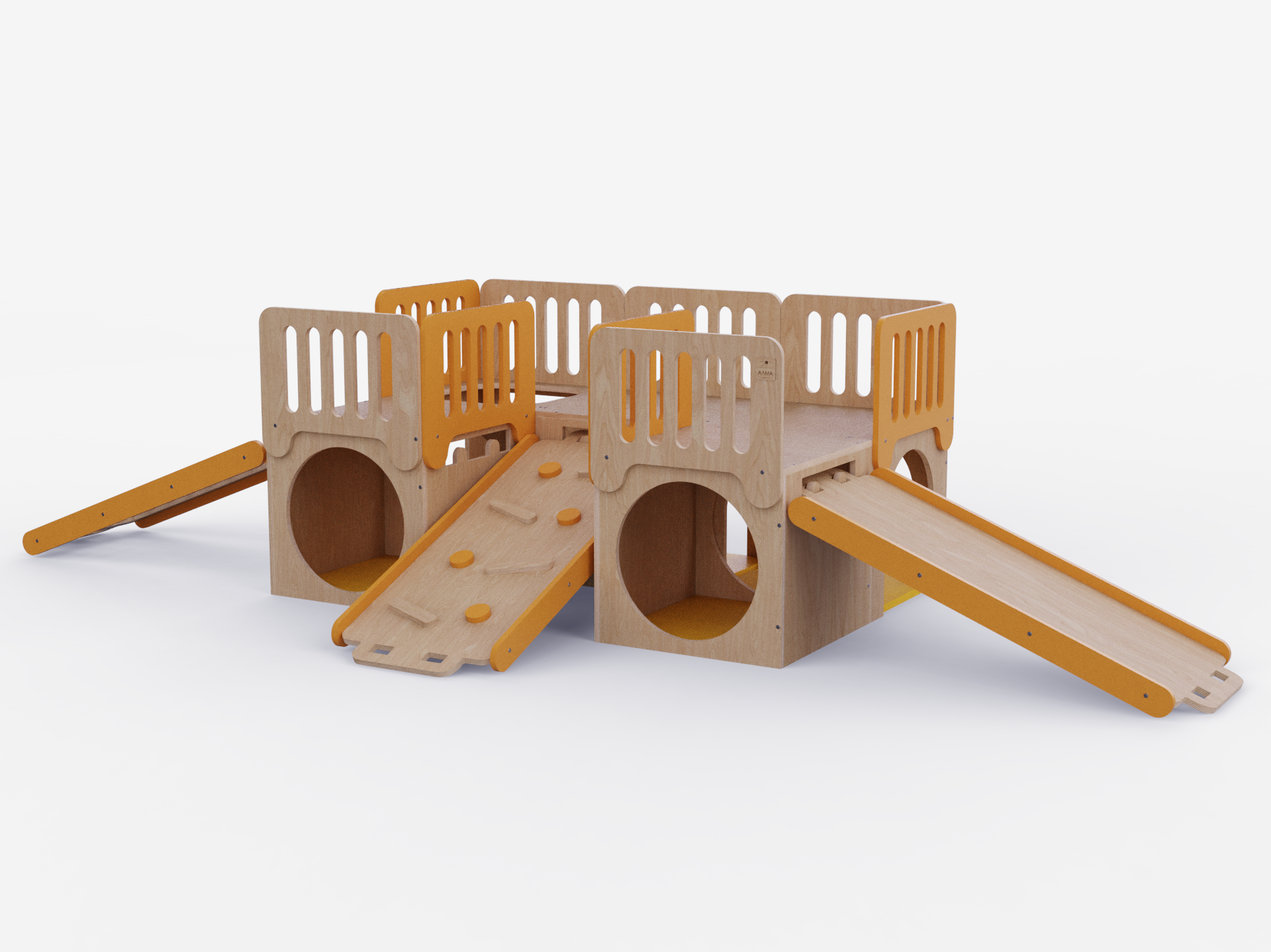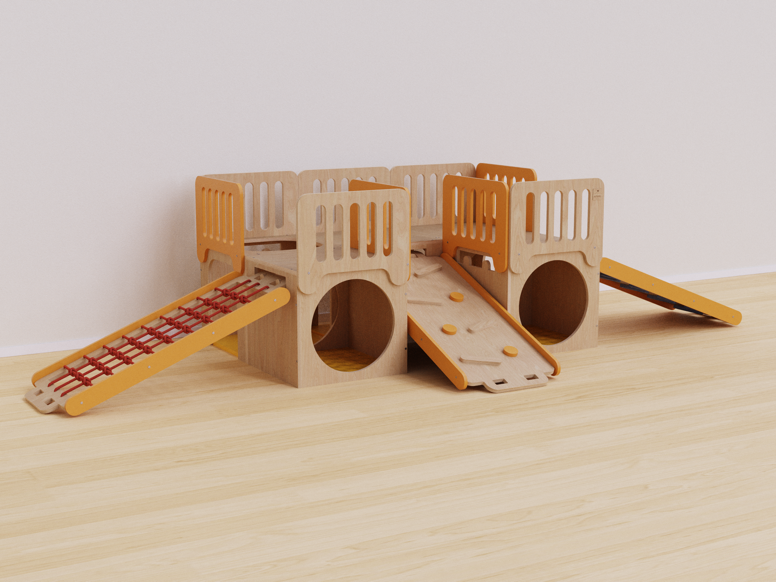 Комплекс спроектирован по типу конструктора, что позволяет менять расположение элементов и добавлять другие при необходимости. Защитный барьер можно поставить в удобное место, чтобы уберечь детей от возможного падения с комплекса.