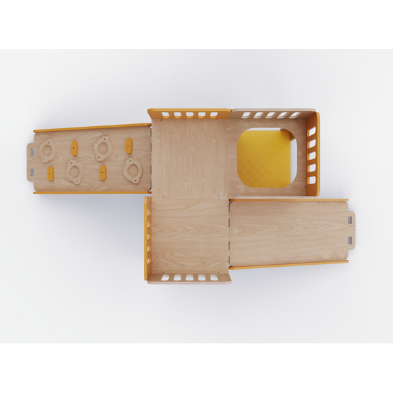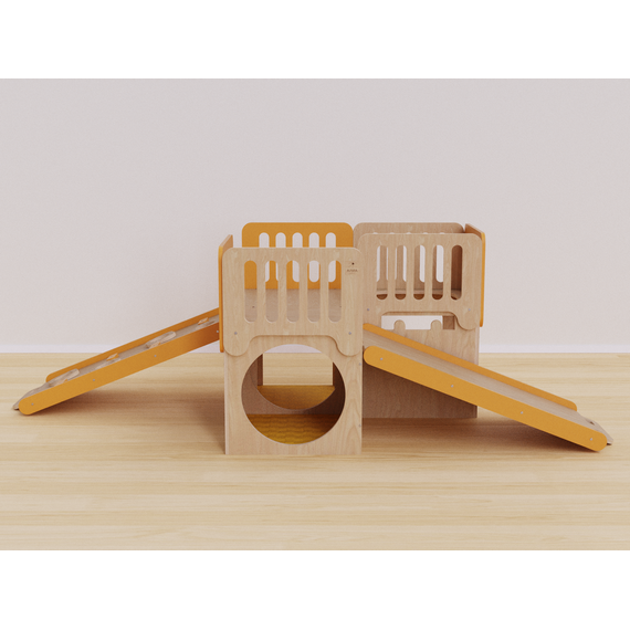 Комплекс спроектирован по типу конструктора, что позволяет менять расположение элементов и добавлять другие при необходимости. Защитный барьер можно поставить в удобное место, чтобы уберечь детей от возможного падения с комплекса.